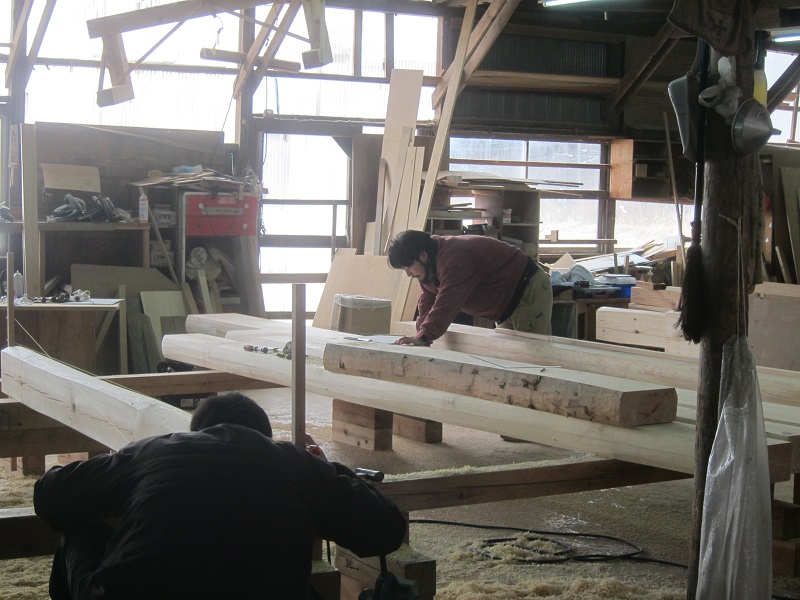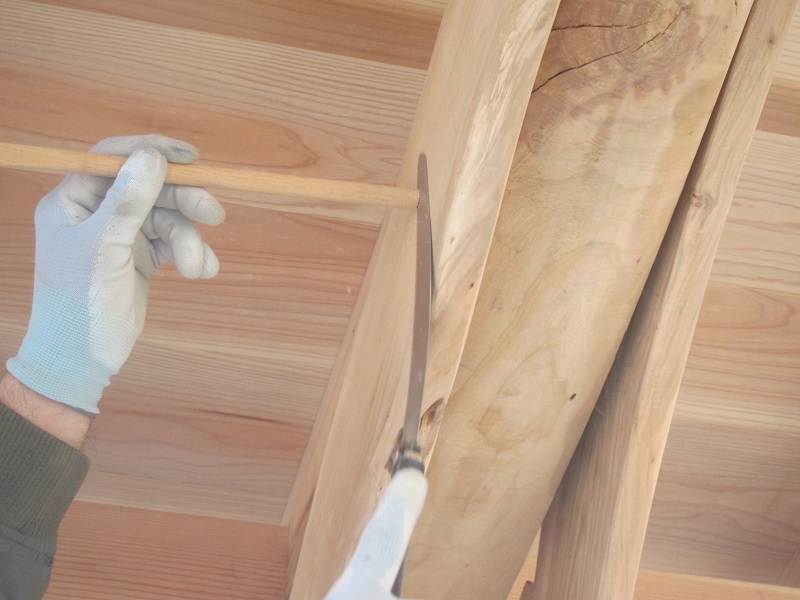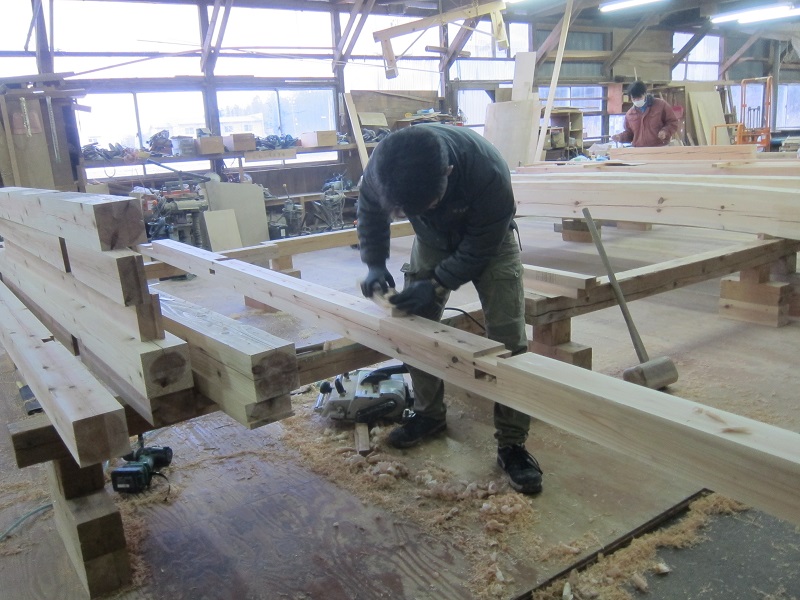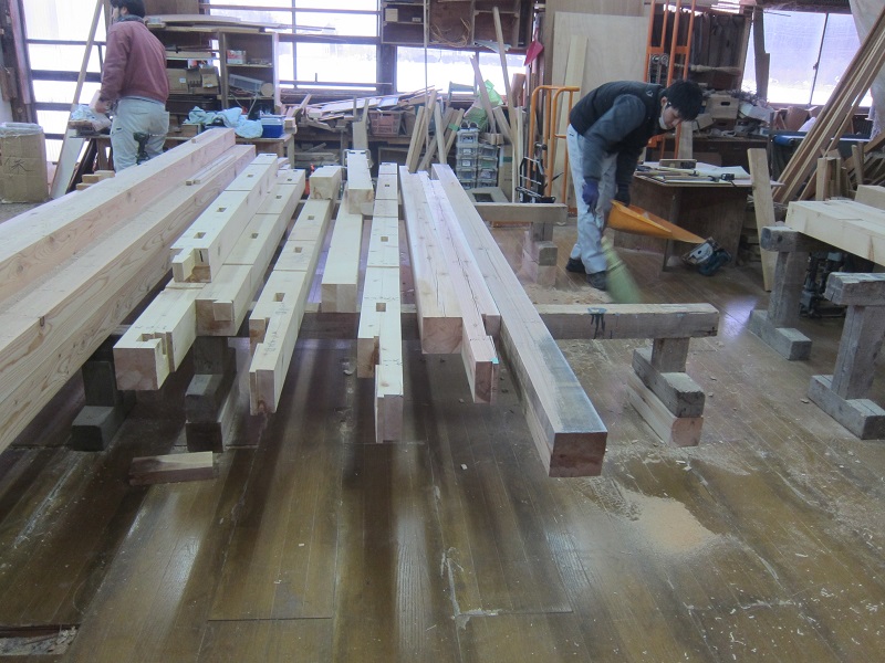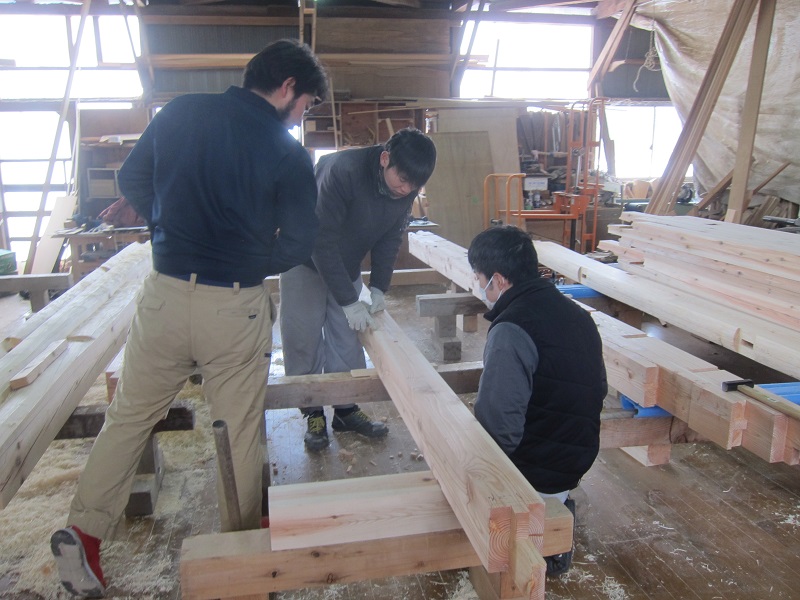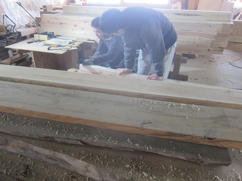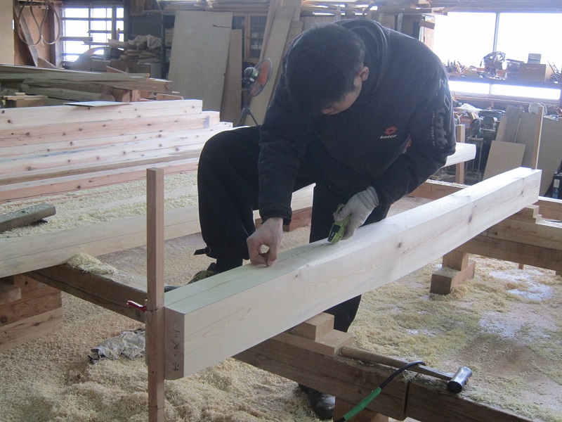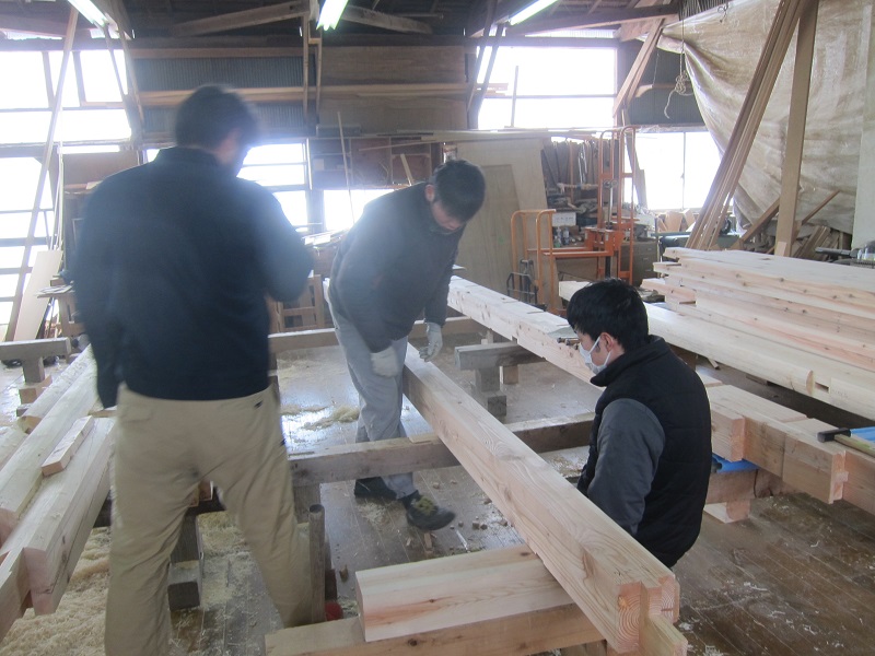 若手大工の墨付け刻みは、先輩が後輩を指導しながら無事進んで現在大方完了です。若手が教え合う姿に見る側の気持ちは春の様です。人は教えられても育ちますが、人に教える事も自らの成長に繋がりますね。