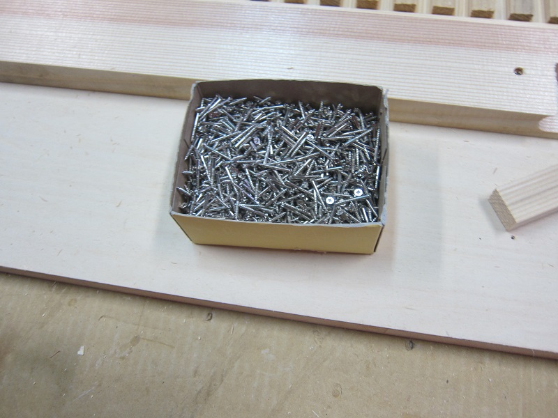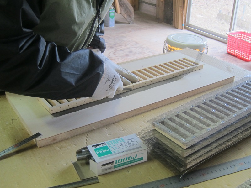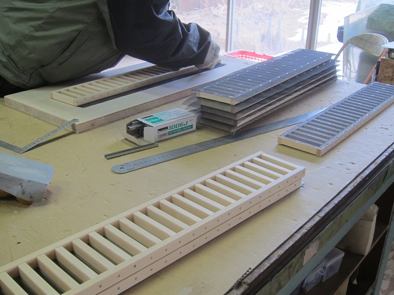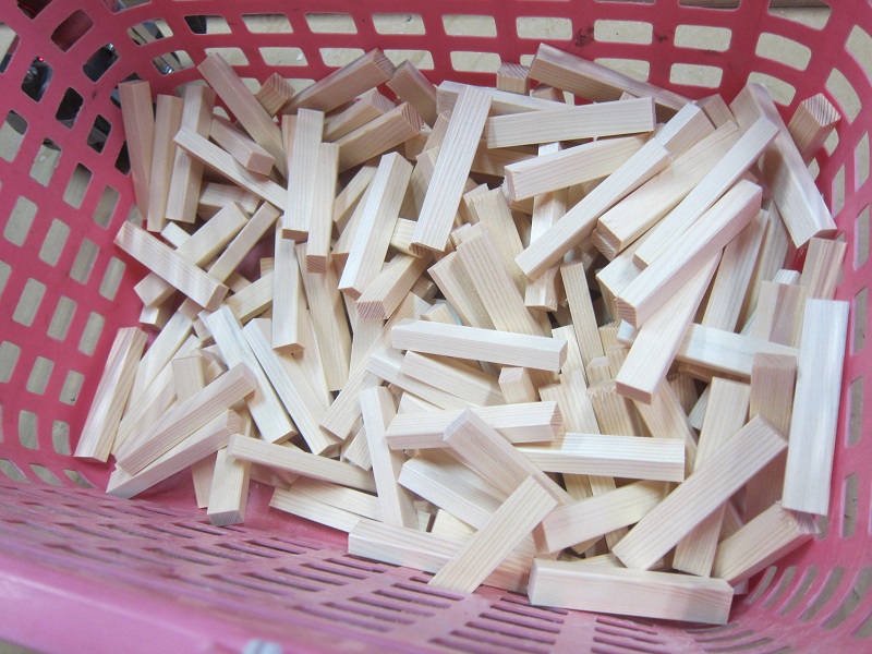 床スリット造りをしています。とにかく細かい材が大量なのです。毎回造るので、パーツは多めにストックするように心がけていました。この無節材を確保するのに、耳付板の切り落としから採るので、丸太から出る材の全てを利用していることになるので満足しています。