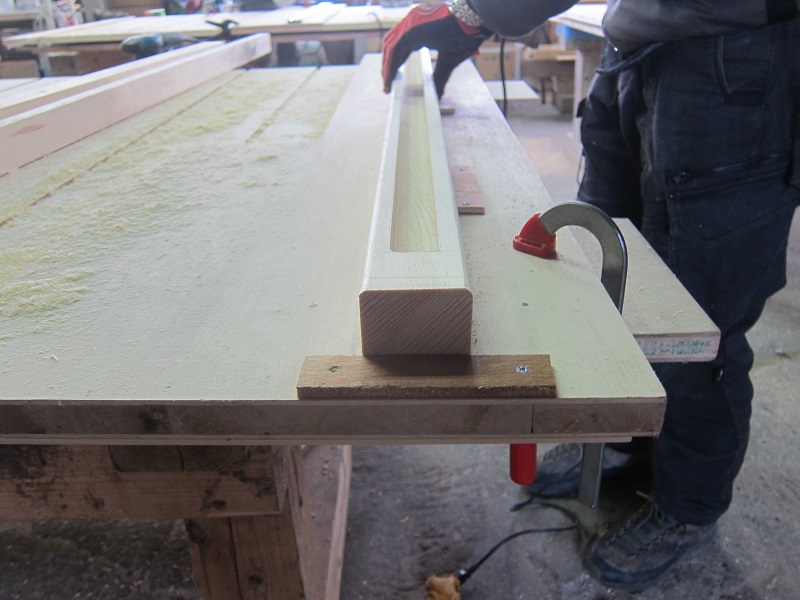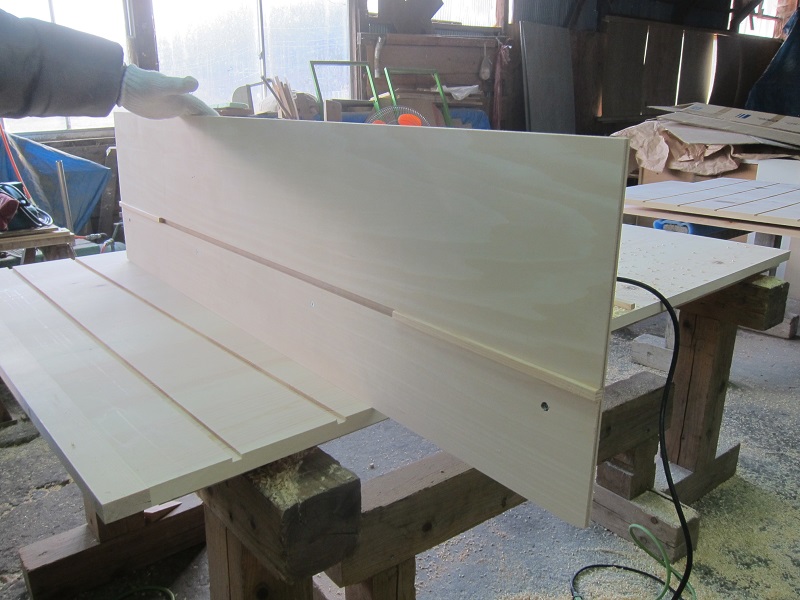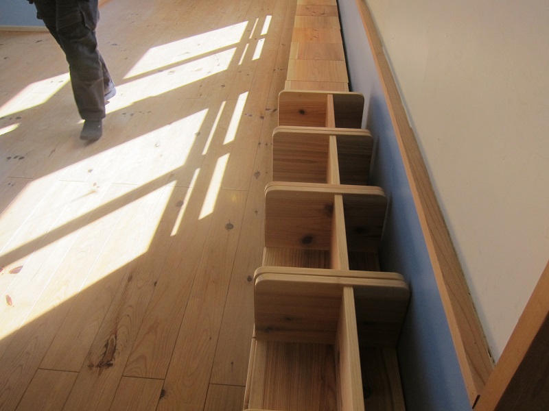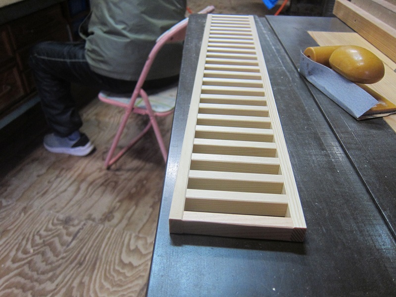 その名もハイハイ板!その名の通りハイハイさせるために手足が掛かる桟の取り付けを行いました。まずは溝を掘り込みそこに桟木を埋め込み取り付けて磨いて出来てきました。最後に塗装して仕上がりです。桟の溝を掘り込む為のジグも手作りですね。職人の技と知恵です。