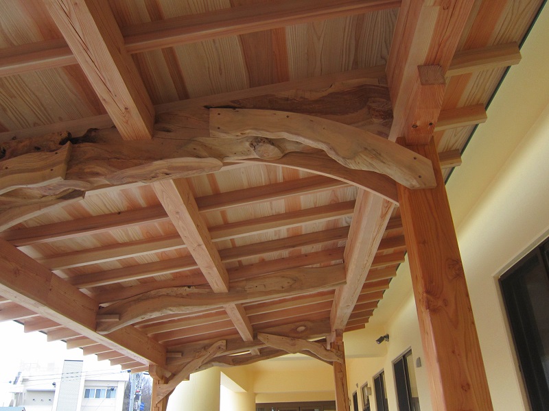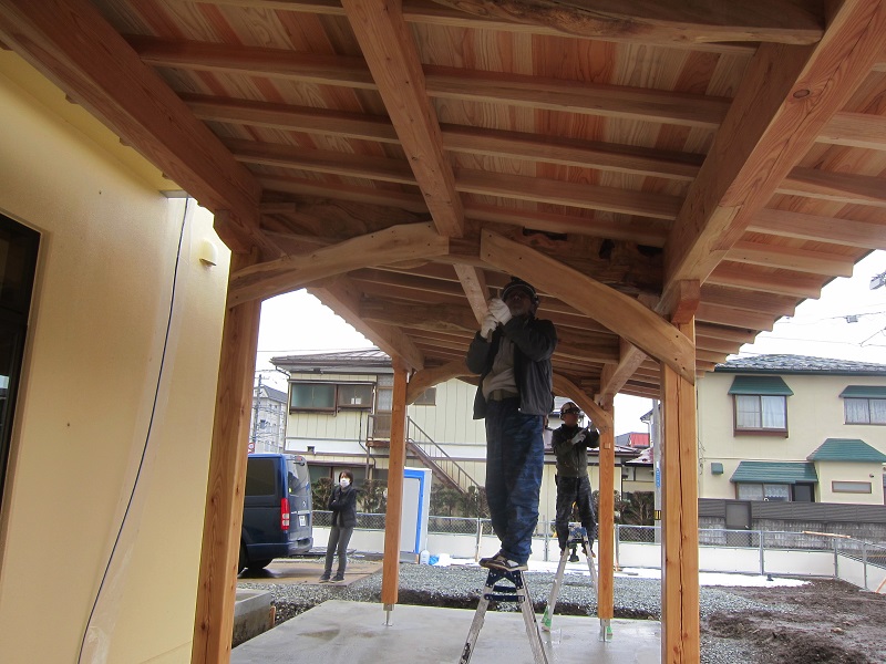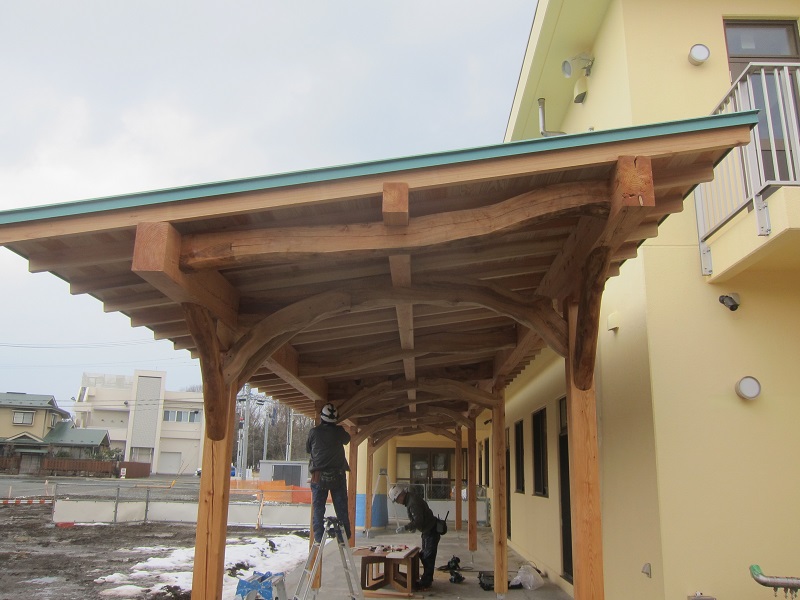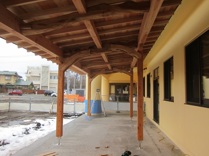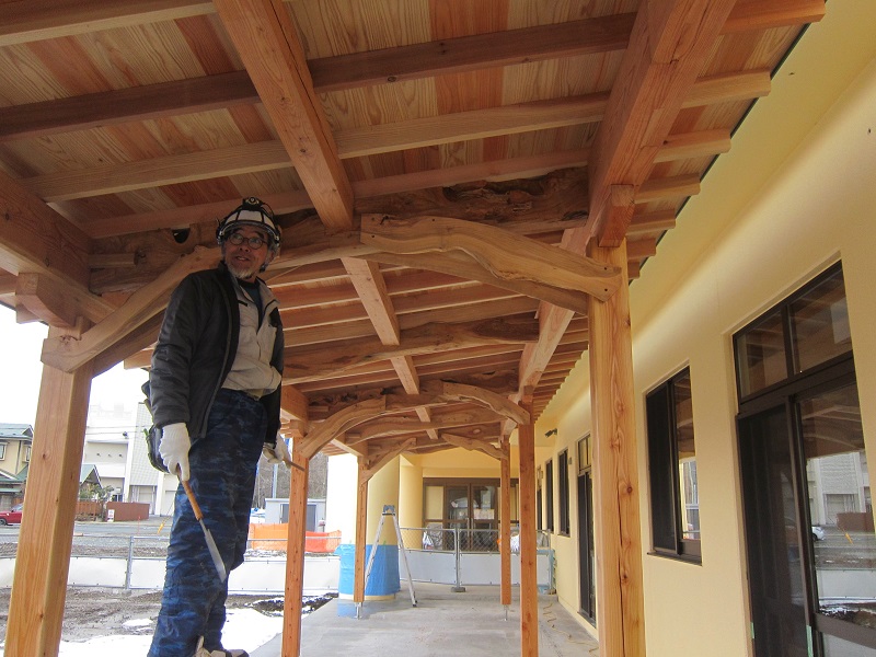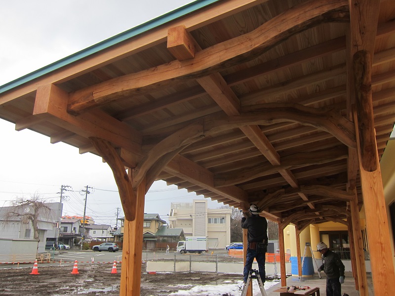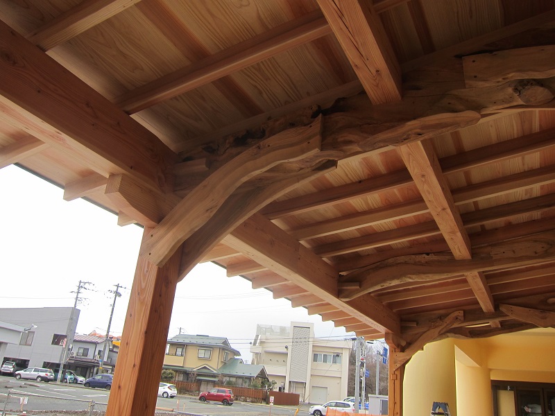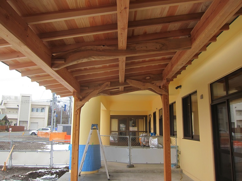 キャノピー工事は、補強の方杖を取り付けて本日完了しました。方杖板も桜丸太を製材した際の曲がり板が使われました。これで、ここの元園庭で伐採された桜の木がほぼ全部使用されたことになります。近隣の方のお話では昭和初期からあった桜の並木道だったそうなので、約100年の桜と云う事ですね。