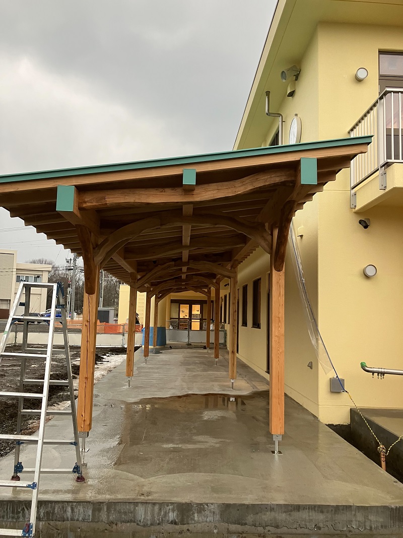 急遽キャノピーの方杖工事をしたのですが、材は添付写真の様な製材時の背板セッカと呼ばれる通常は使われずに処分されることが多い端材の中から選別して使用いたしました。なので、100年生きた桜の樹玲の中で街道の桜並木時代も有り、保育園の園庭で見事に咲き誇った時代もある木がこうして生かされて新たな姿で新しい園に戻って来たものと感慨深くなります。戦前戦後を見詰め、令和の新時代をも見守ってくれるに違いありませんから、素晴らしいストーリーがここに完成いたしました。