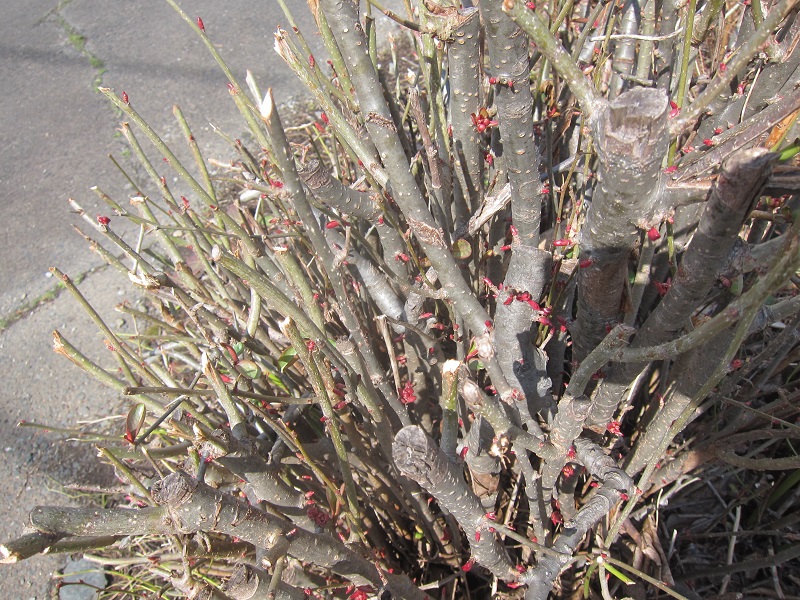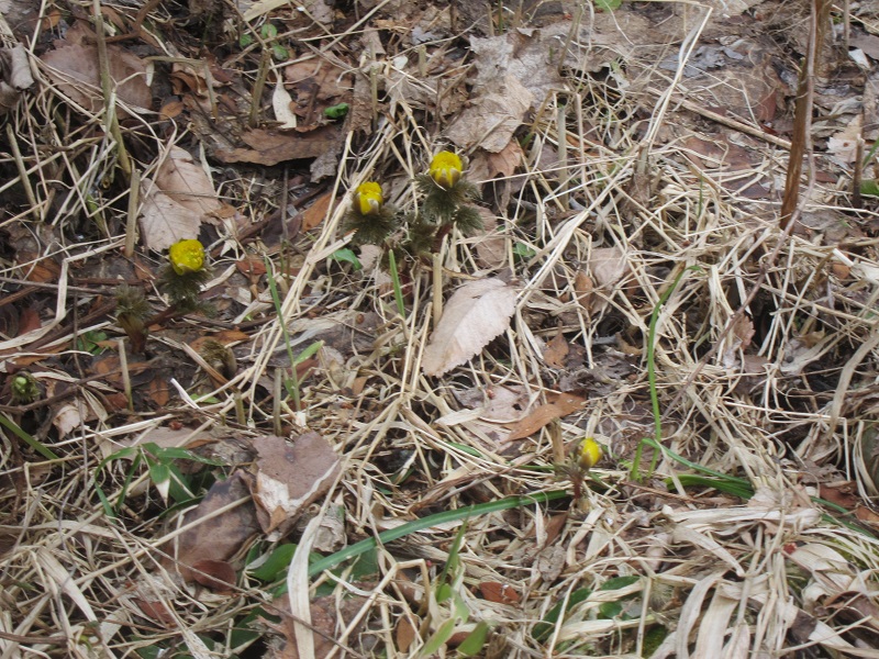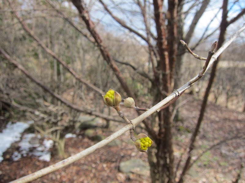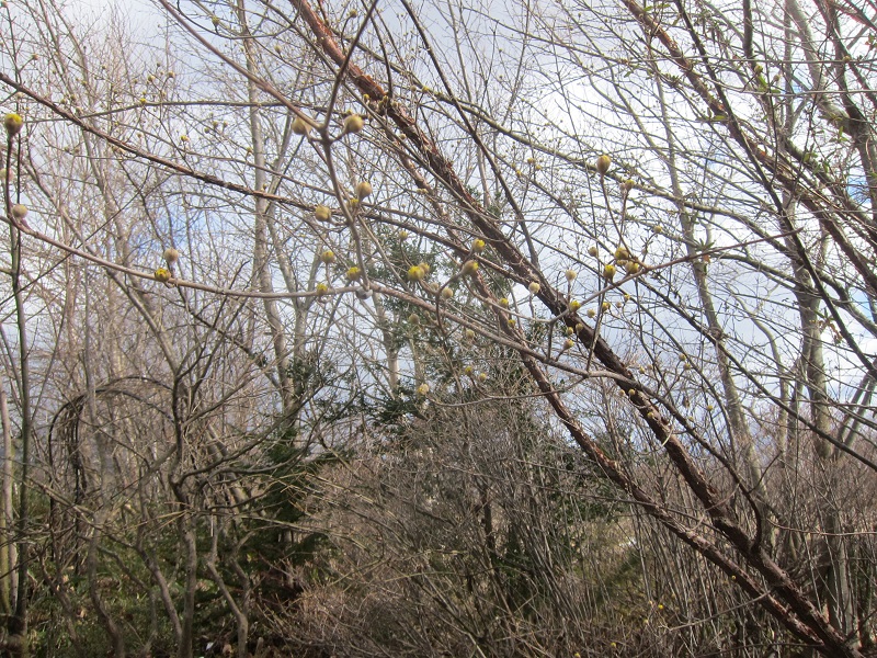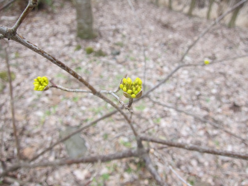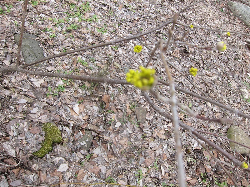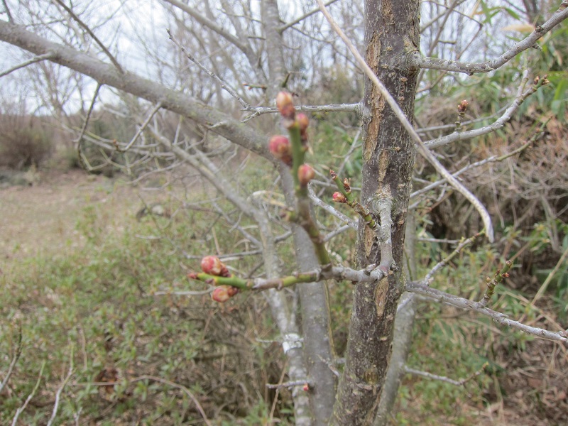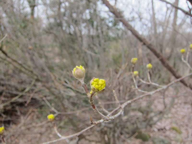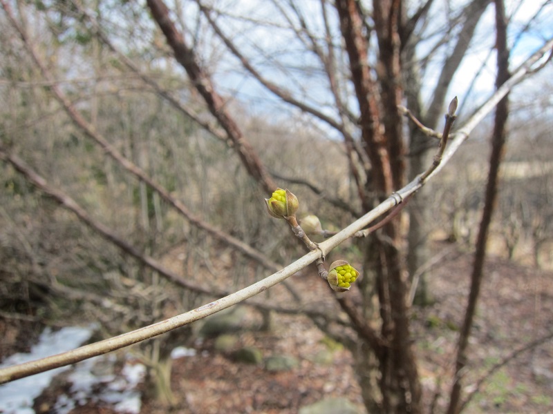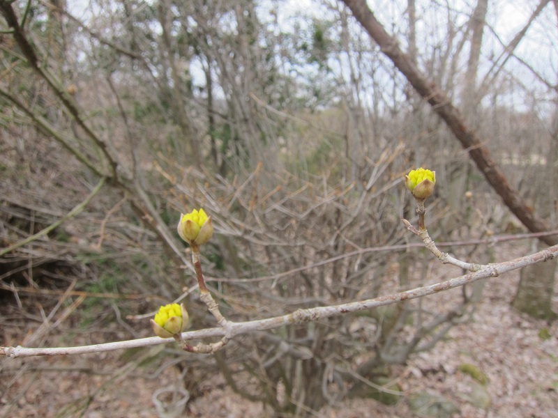場内のサンシュウユの蕾が膨らんで今にも咲きそうです。福寿草も同様です。