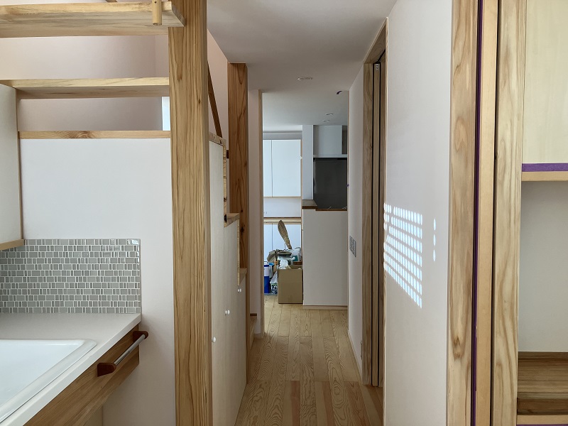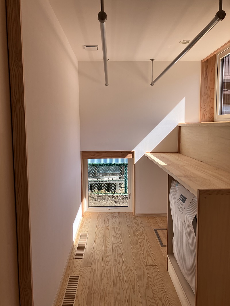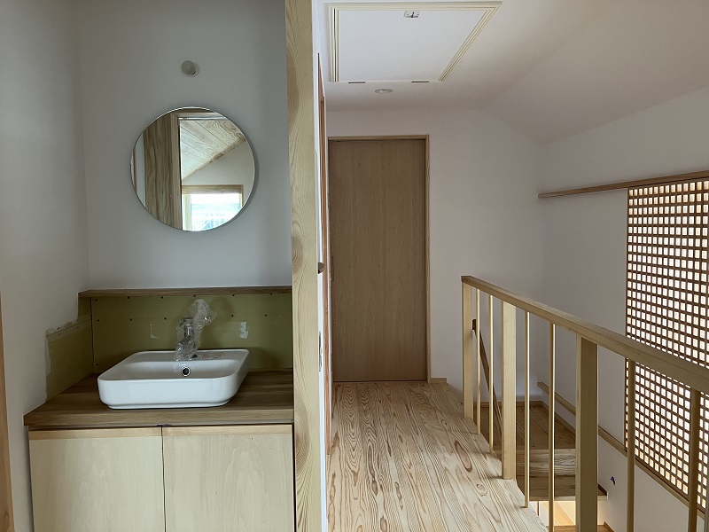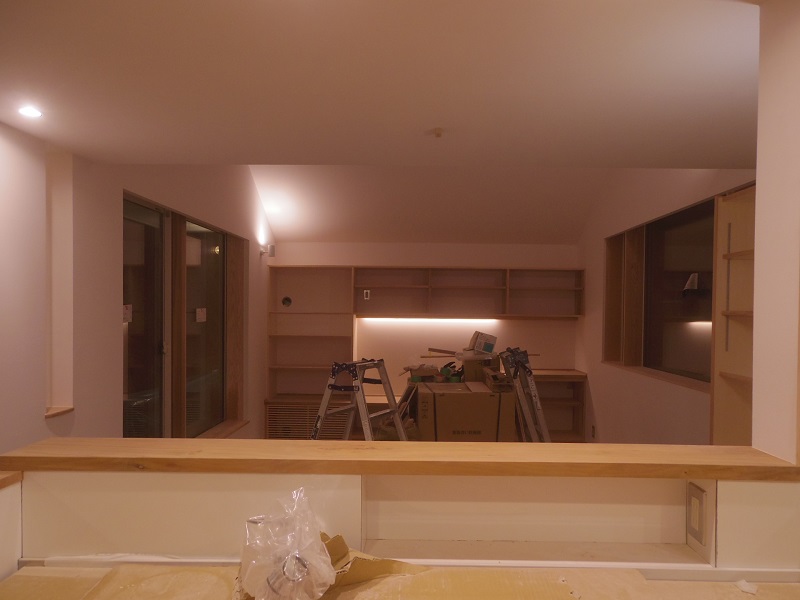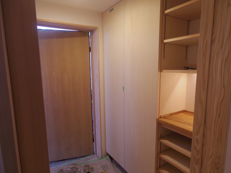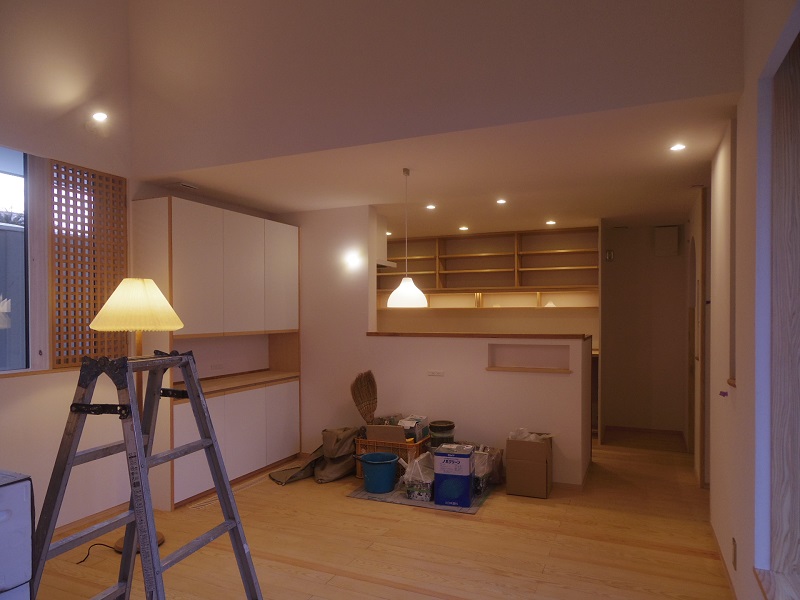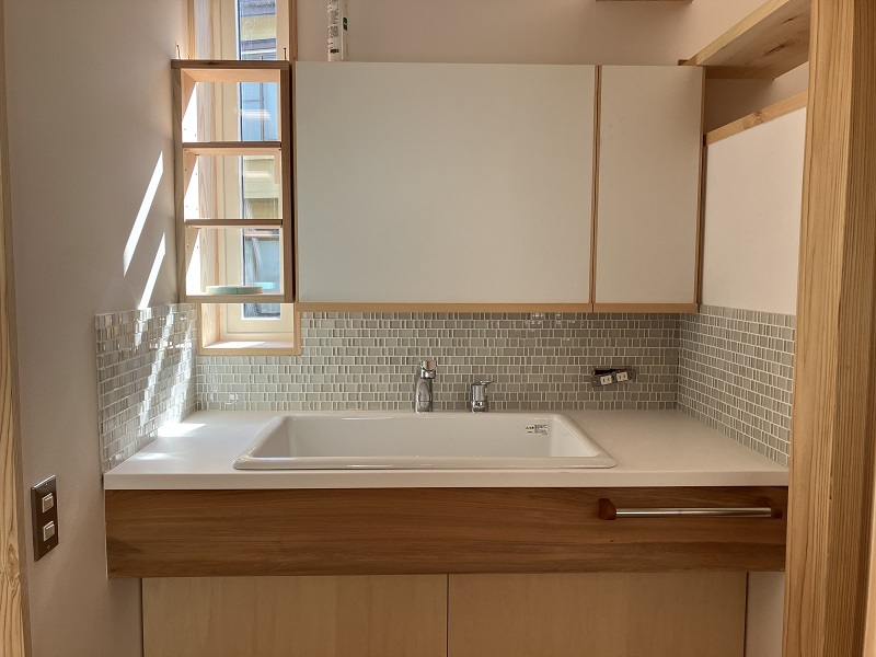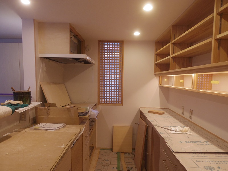 今週末完成見学会の梨木町新築住宅では、写真の様に大方完成して、エアコン等の器具付けと掃除が終われば竣工です。今回の写真は大工造作による、台所や洗面にランドリースペースなどの雰囲気をご紹介させて頂きました。現場便りでも内部の仕上がり雰囲気が見れますが、実際に見て触れて頂ければ幸いです。駐車場に限りが御座いますので、予約制とさせて頂いております。現在ホームページに予約申し込みページが御座いましたので、そちらからお申込み頂いた皆様に会場の住所と地図を添付返信させて頂きますので、何卒よろしくお願い申し上げます。