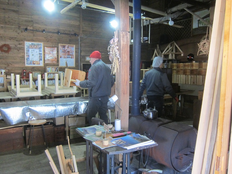 何やら楽しそうに、ハイハイ板造りしてると思ったら、きの節隠しに花や蝶々の木掘り象嵌をしていました。子供たちが喜んでくれたらよいねと言いながら自分たちが喜んでいるのでした。外は雪が降り雨が降るしかも雷鳴轟く日でしたが、場内は暖かな笑いと笑顔が溢れる一日でしたね。