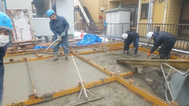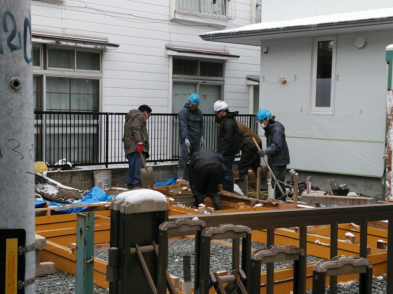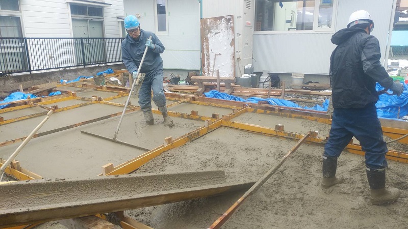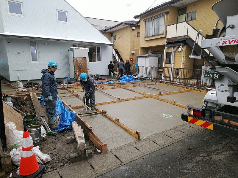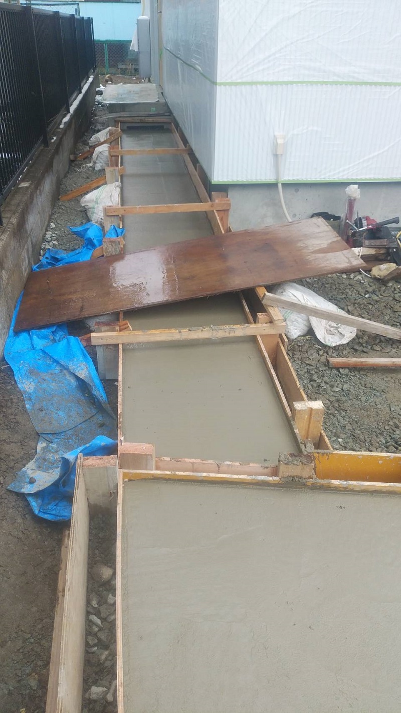 来週末完成見学会の梨木町新築住宅では、昨日車庫の土間コンクリートを無事打設いたしましたので、見学会準備が着実に進んでおります。生コンとはよくぞ名付けたものです。写真を見ての通り緩々ドロドロで流し込まれて次第にガサガサごつごつとなって乾きながら固まり均されて平滑になって行きます。駐車スペースに勾配を付けて雨水の流れ込みを調整できるのだからこその生コン打設です。左官の技が絶対に必要条件ですね。最後に養生を行って完了です。内部の造り付けの雰囲気写真も添付させて頂きました。現在ホームページに予約申し込みページが御座いましたので、そちらからお申込み頂いた皆様に会場の住所と地図を添付返信させて頂きますので、何卒よろしくお願い申し上げます。