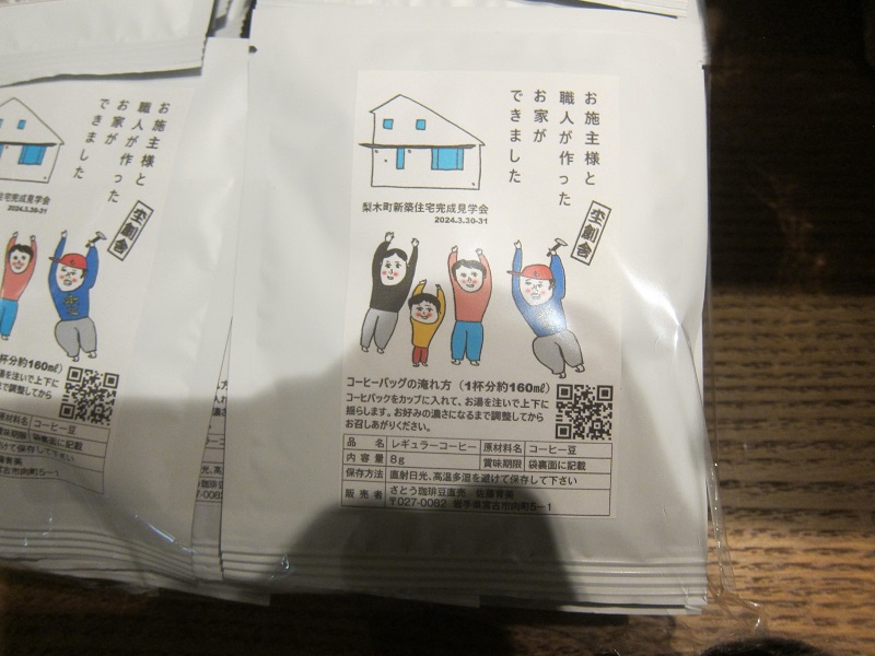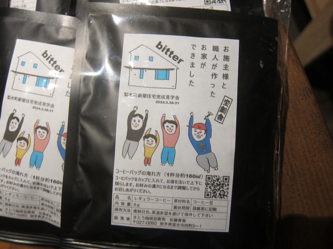いよいよ明日は梨木町の完成見学会です。以前乗せた外観写真を見て、宮古の佐藤珈琲店店主の佐藤さんがコーヒーバックにイラストを描いて送ってくださいましたので、当日は皆様のご来場プレゼントさせて頂きたいと思います。ただ、現地では板塀が出来て、イラストの雰囲気とは変わってしまいましたがご容赦ください。ご予約も頂いておりますが、まだ余裕が御座いますので、宜しければお申し込みの程何卒よろしくお願い申し上げます。