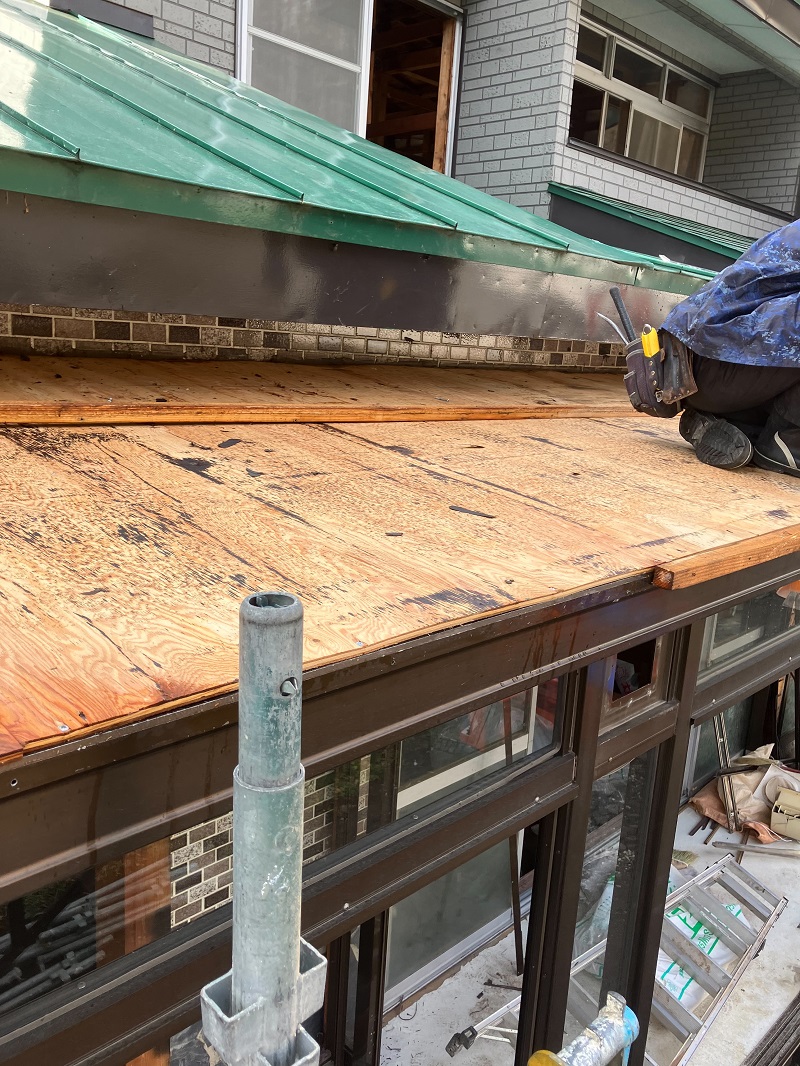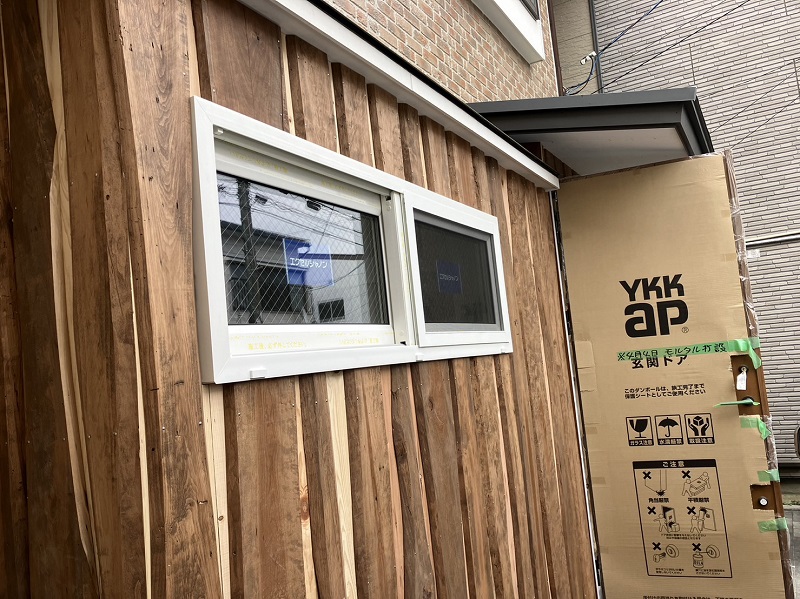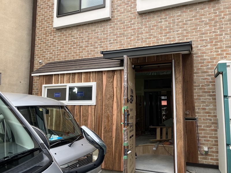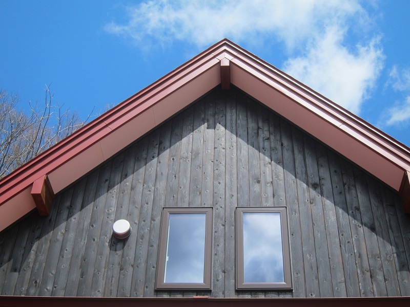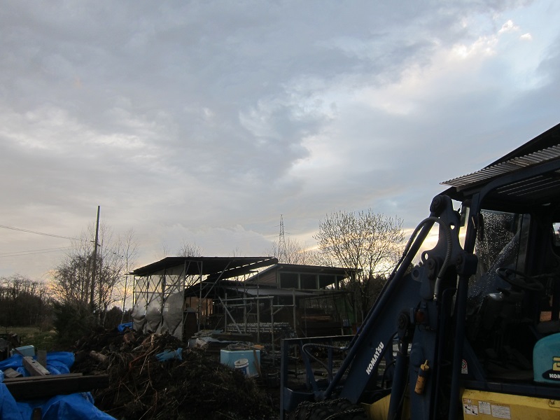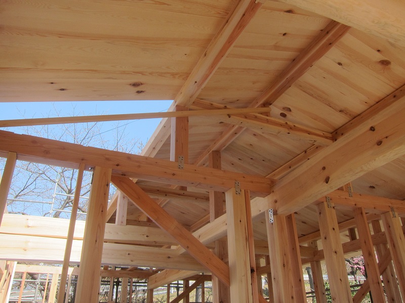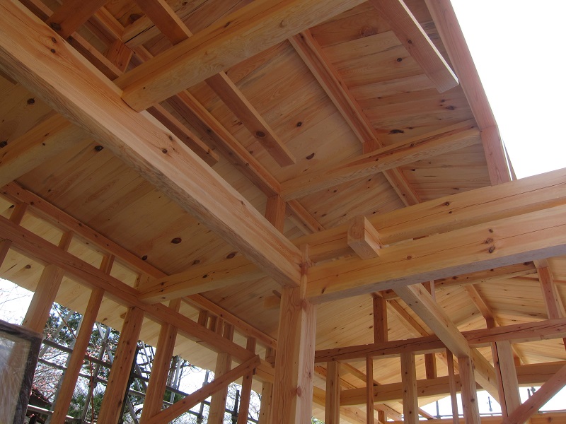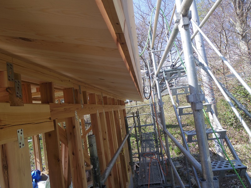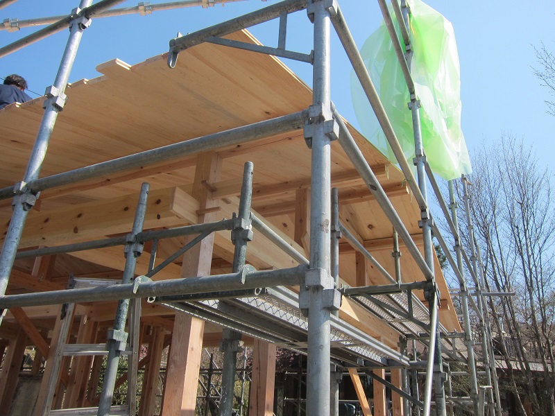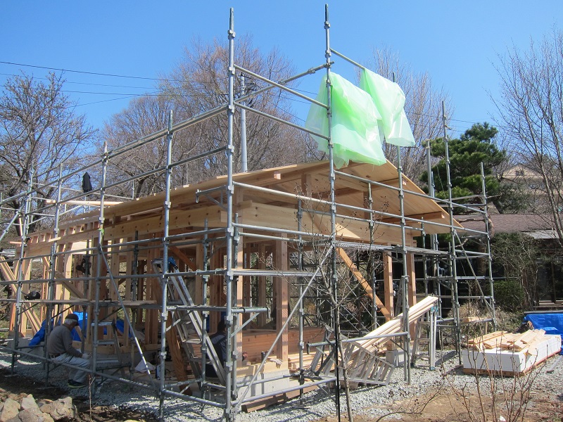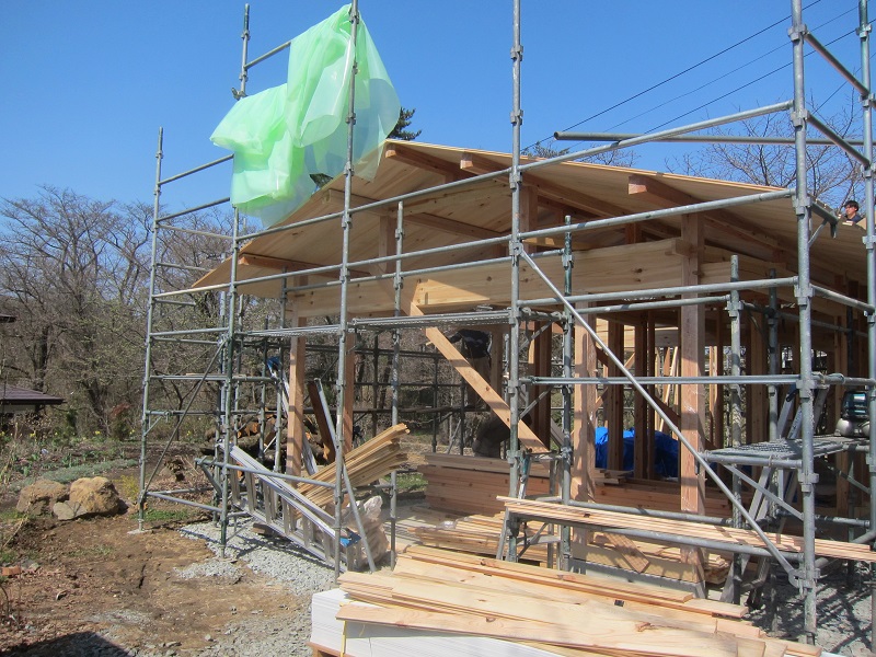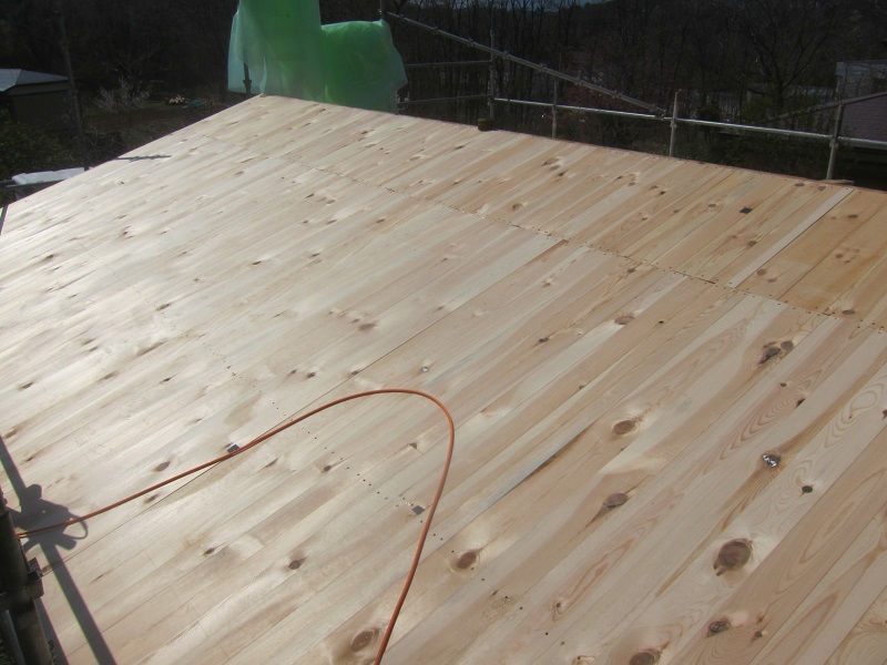 上棟後には、モルダー加工した本実板の敷き込みが進んで屋根の形が見えてきました。車庫小屋ですが、この上から確りと断熱は施します。