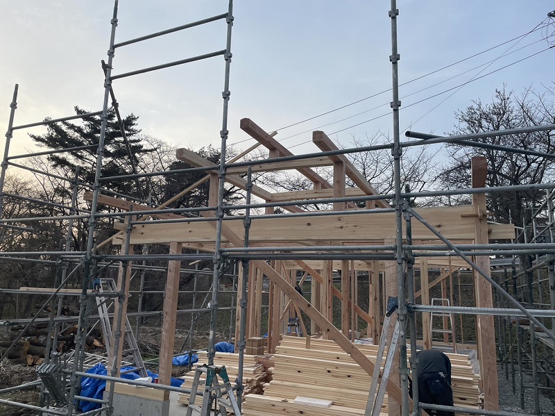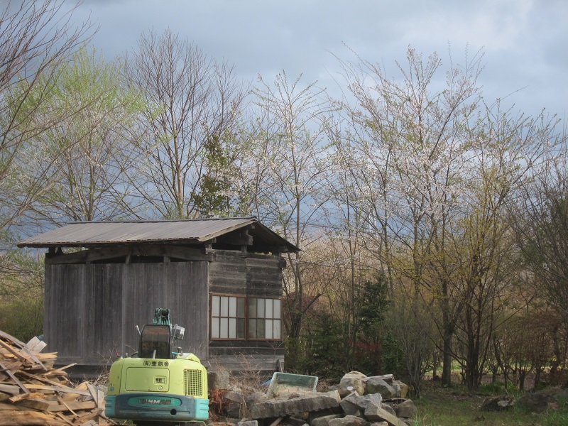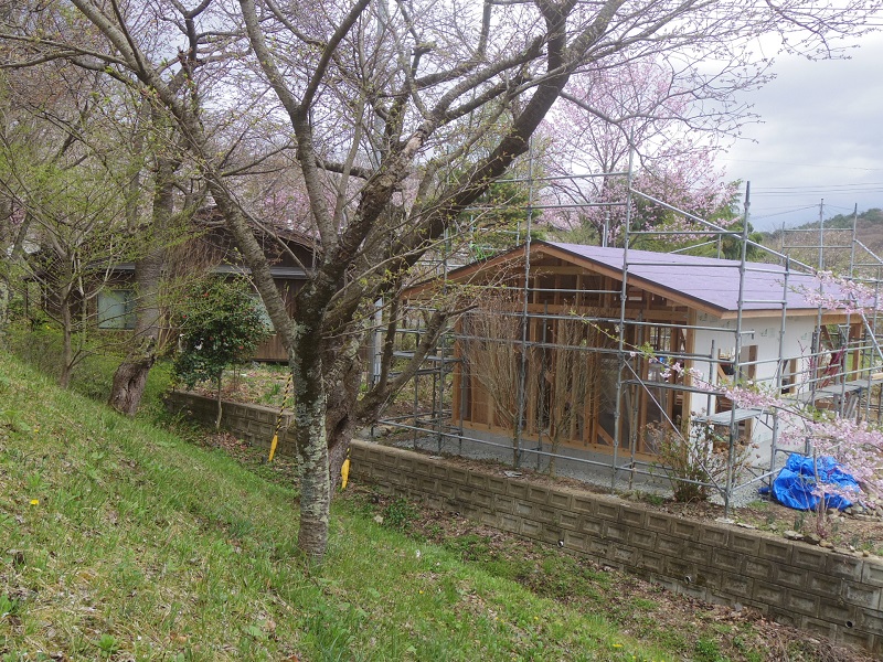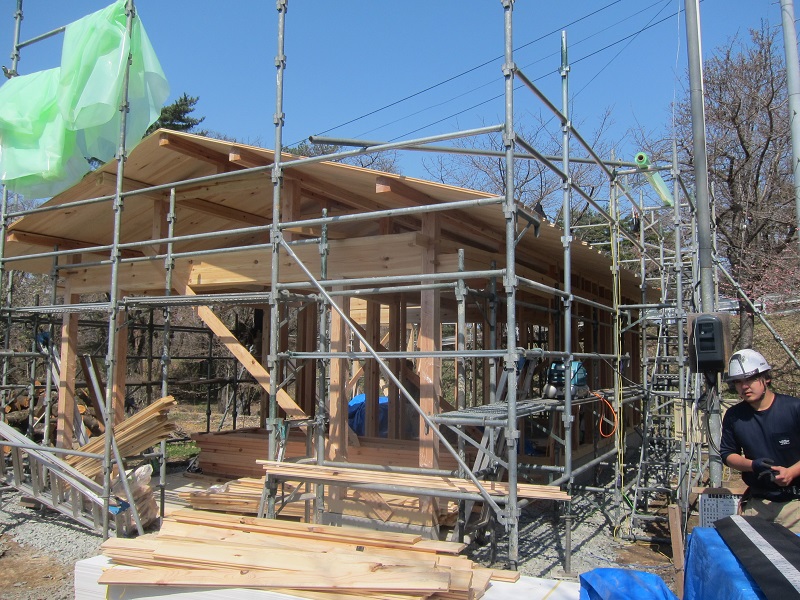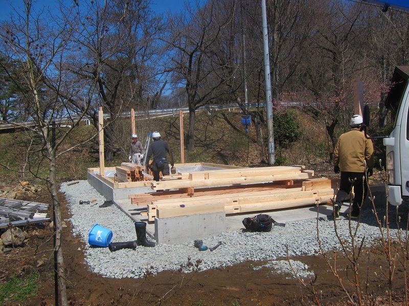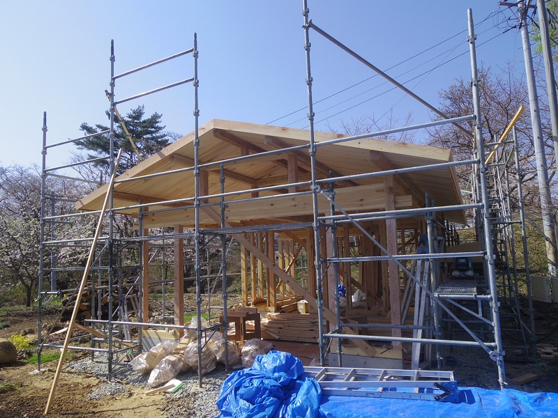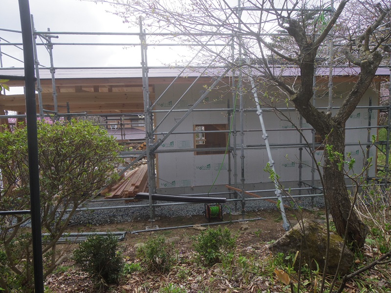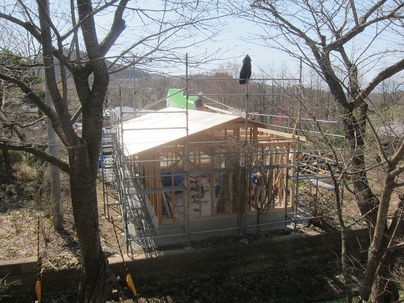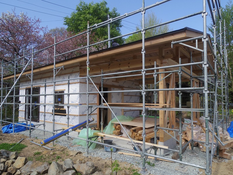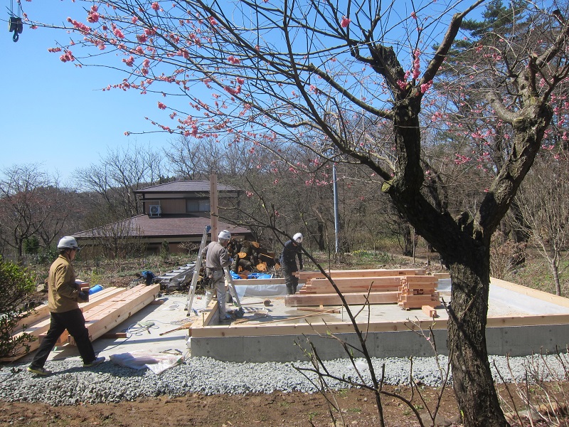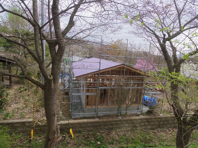 春先の雪で難儀した小屋の新築現場は、基礎が完成して整地も進み、建て込みが始まりました。木々の花も咲いて春らしい中での建て方です。お施主様の庭造りもいい感じで今年の薪の準備も順調な雰囲気です。