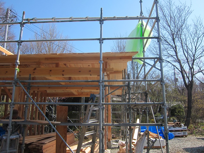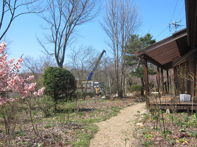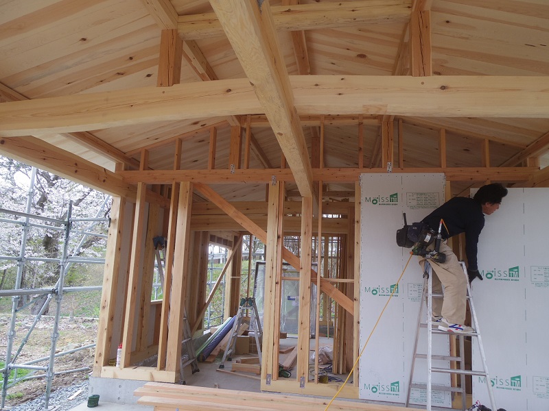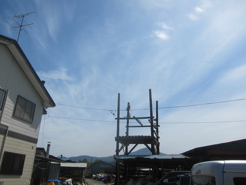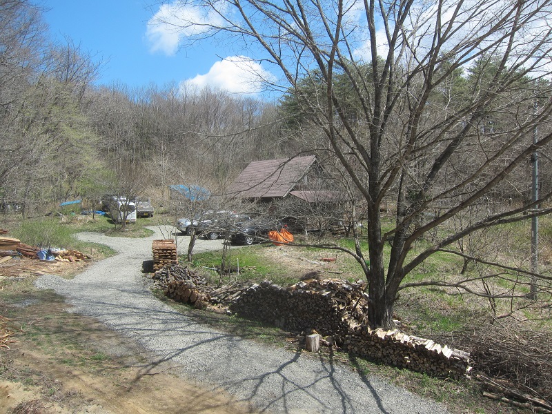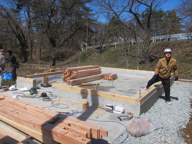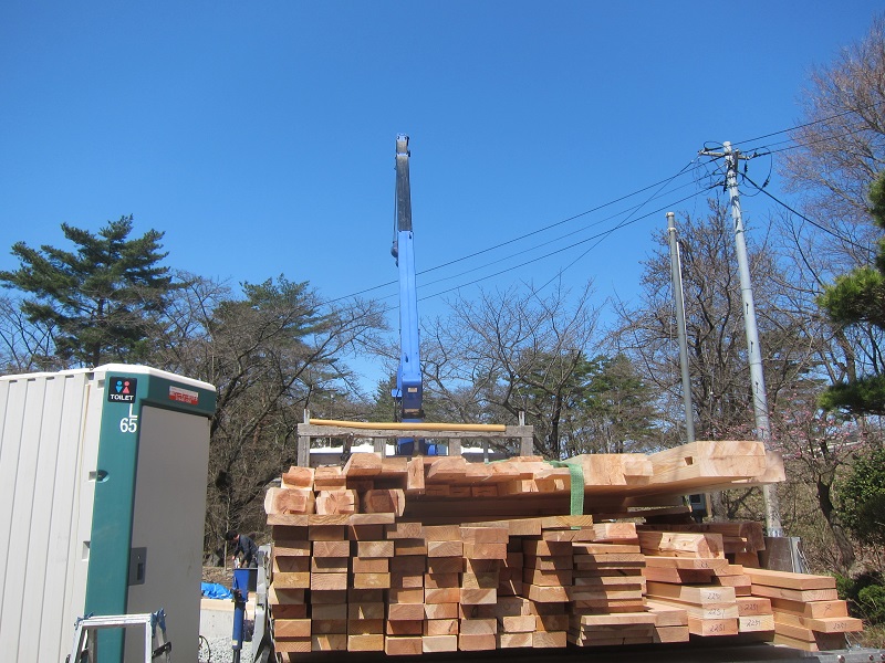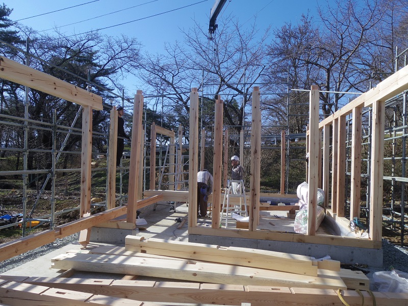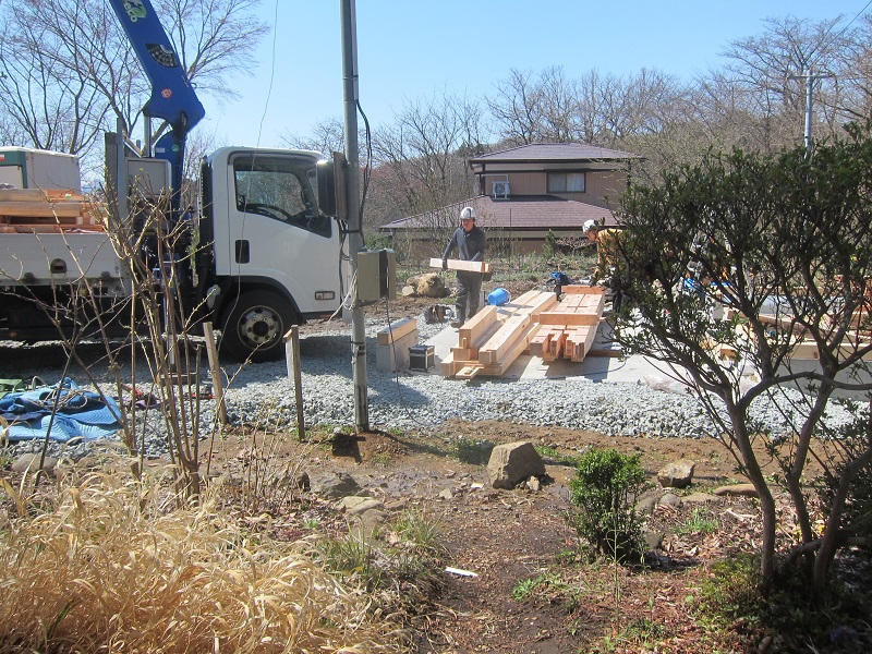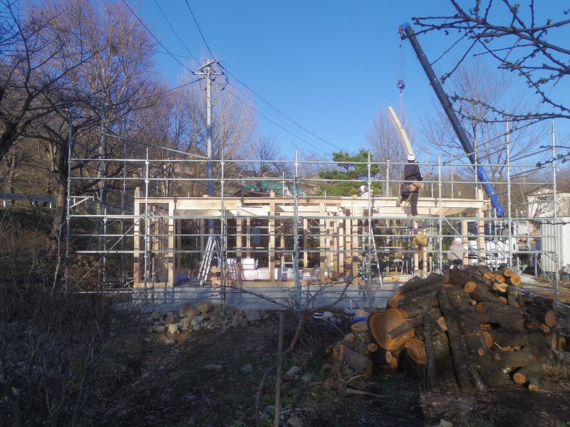 春先の雪で難儀した小屋の新築現場は、基礎が完成して整地も進み、建て込みが始まりました。木々の花も咲いて春らしい中での建て方です。お施主様の庭造りもいい感じで今年の薪の準備も順調な雰囲気です。