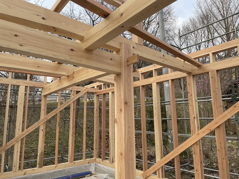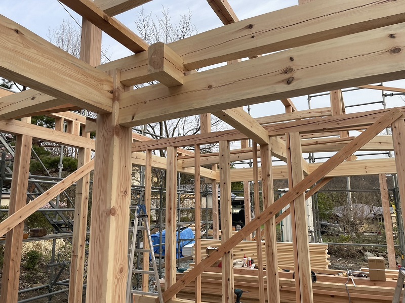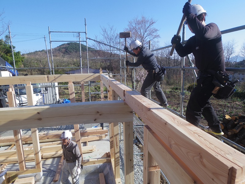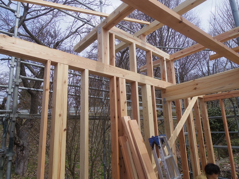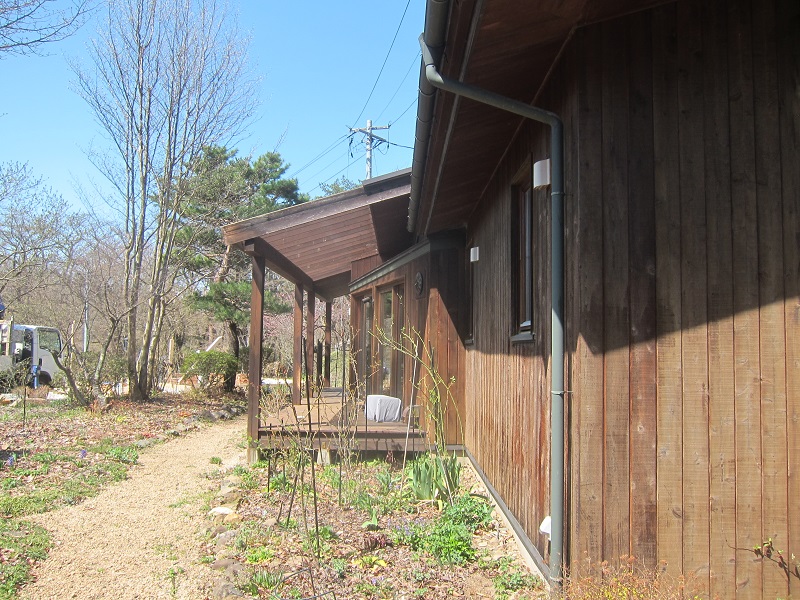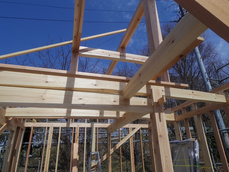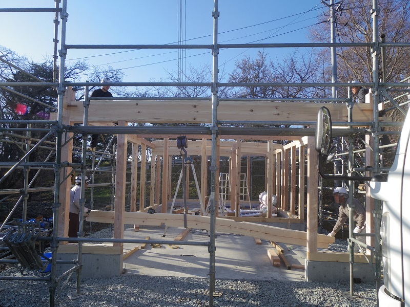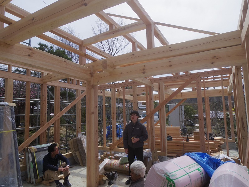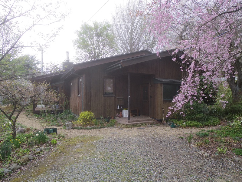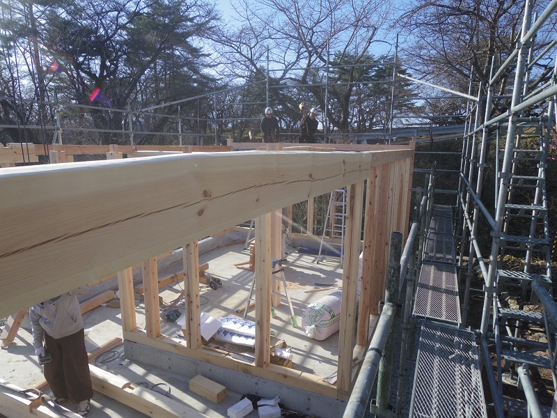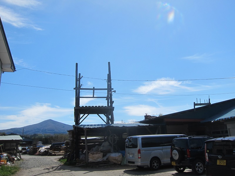 春先の雪で難儀した小屋の新築現場は、基礎が完成して整地も進み、建て込みが始まりました。木々の花も咲いて春らしい中での建て方です。お施主様の庭造りもいい感じで今年の薪の準備も順調な雰囲気です。