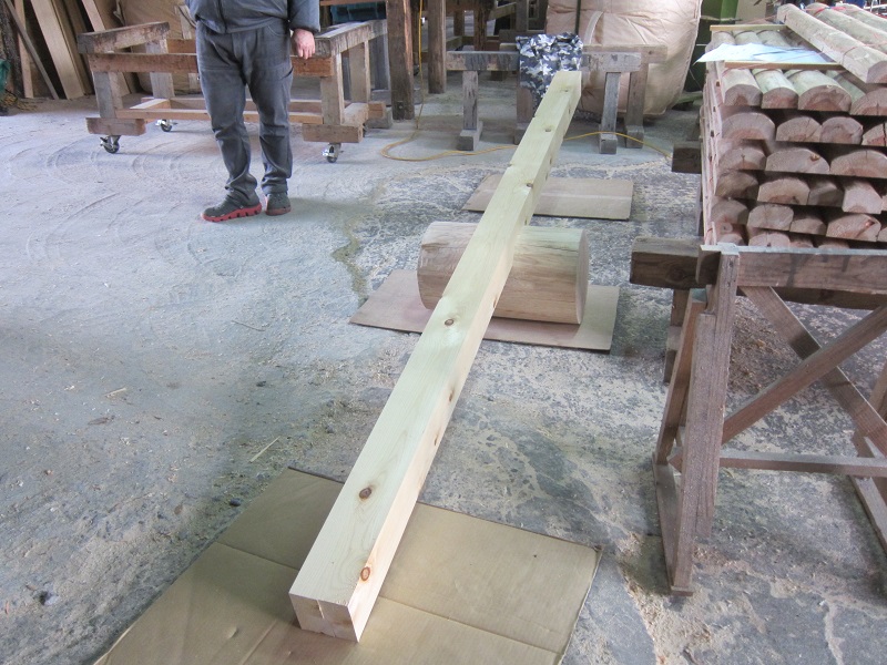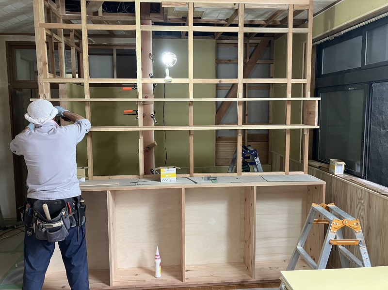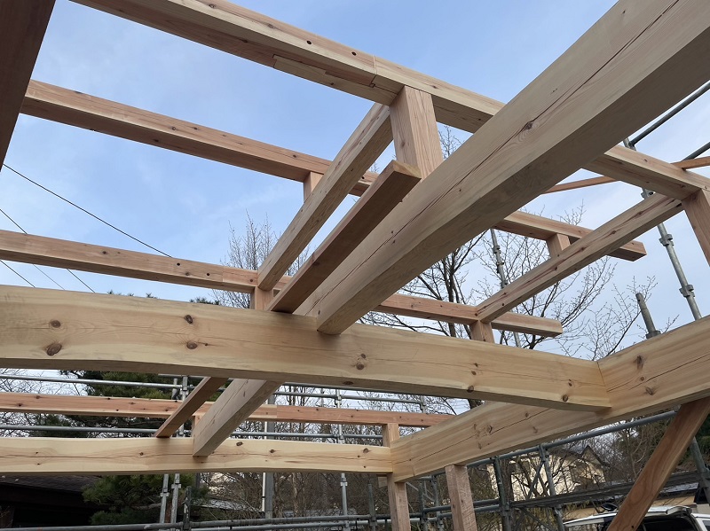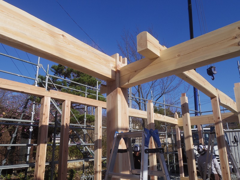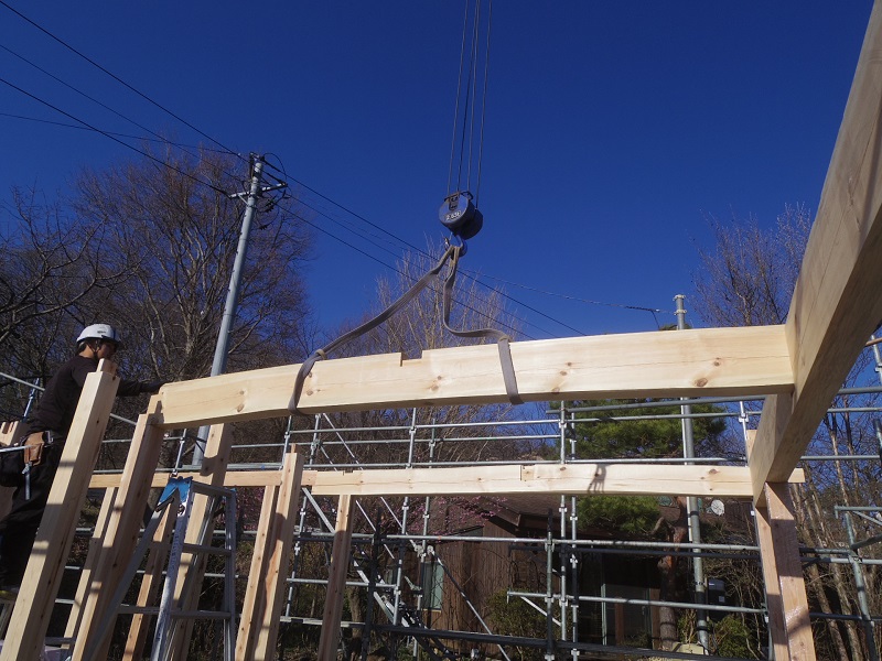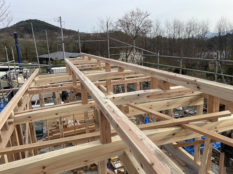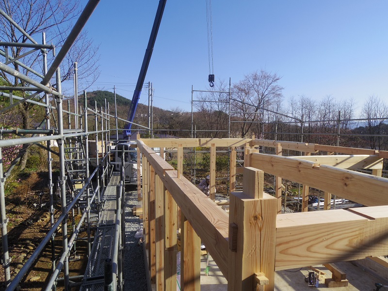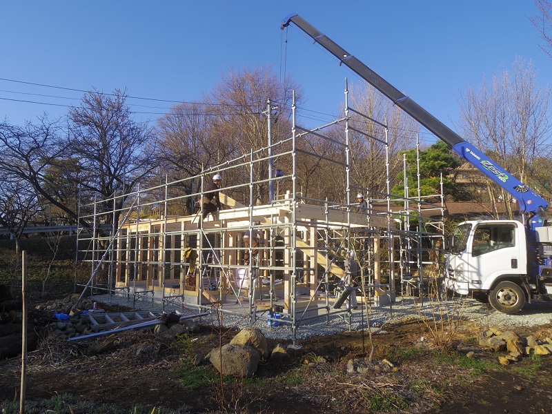 先日来の四十四田ダム湖方らで進む車庫小屋の建て方は、順調に上棟しました。