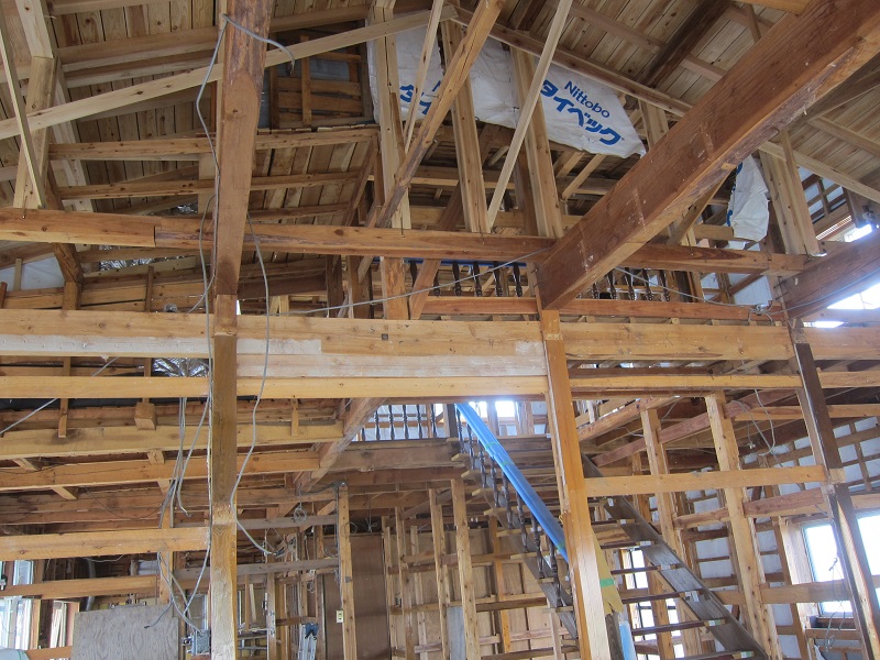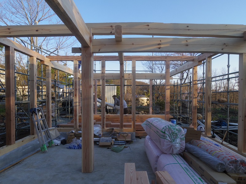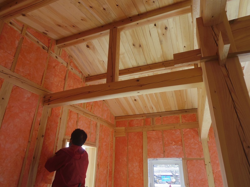 建て方を終えた車庫小屋工事は屋根を葺き上げて内壁断熱も進んでいます。四十四田ダム湖脇の立地でこの時期はとても美しい所です。母屋よりも小屋の方が立派な木組みの構造だと云われておりますが、小屋が将来住まいになっても暖かく暮らせる断熱構造です。もしも不足でも簡単に付け加えられる内容です。