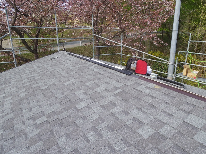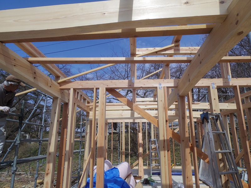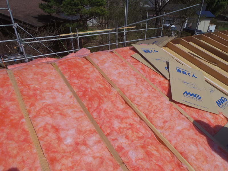 屋根の化粧板張込み後に垂木を並べて屋根断熱が充填されました。小屋でも断熱は確りと行います。天気が良いので、順調に進む現場でした。