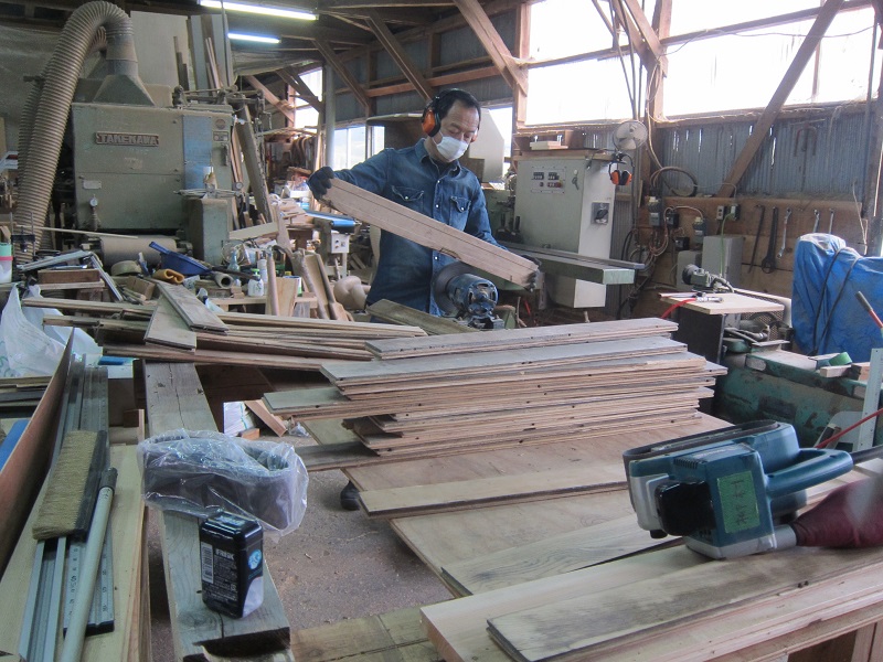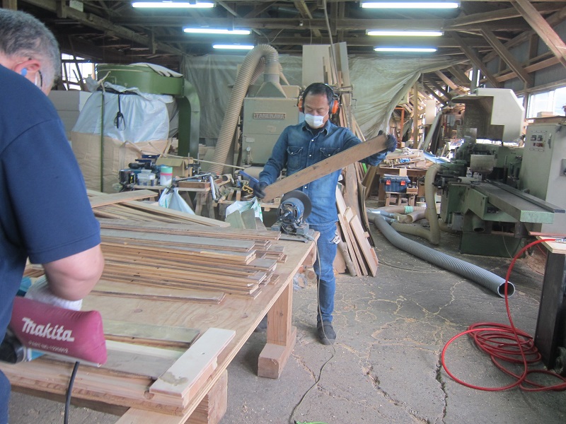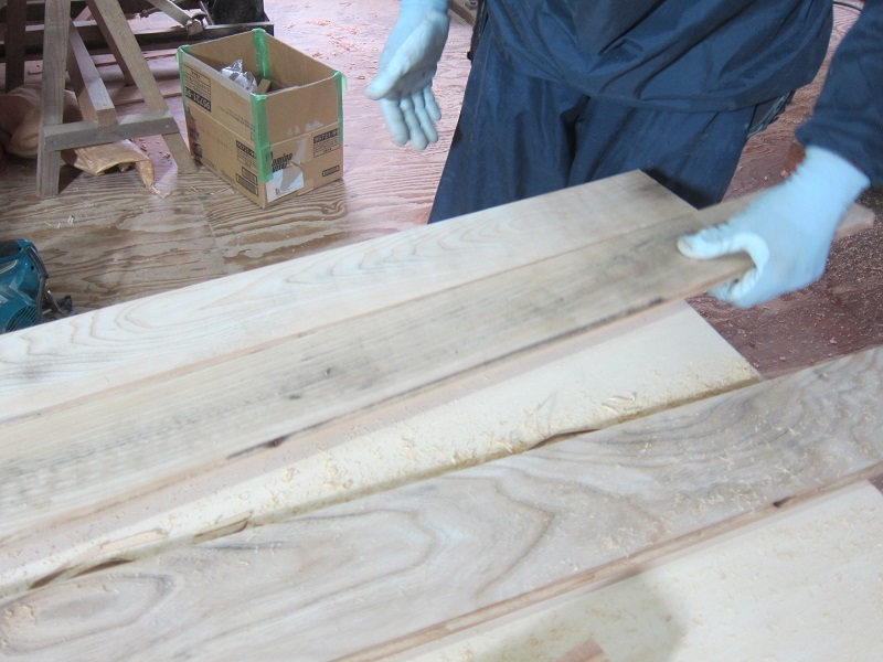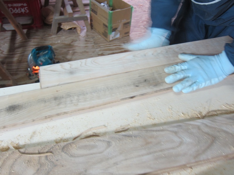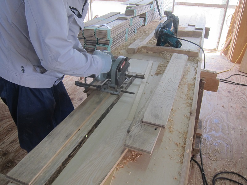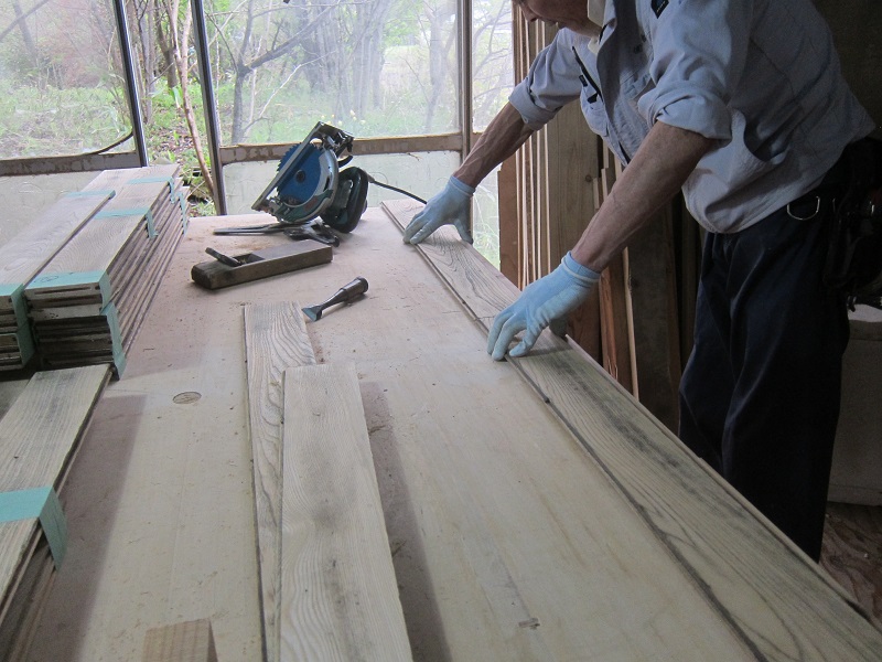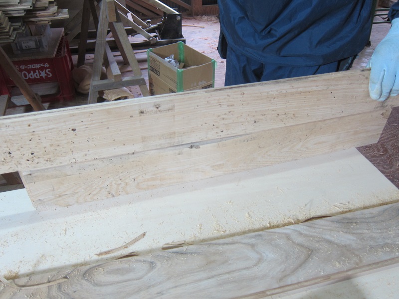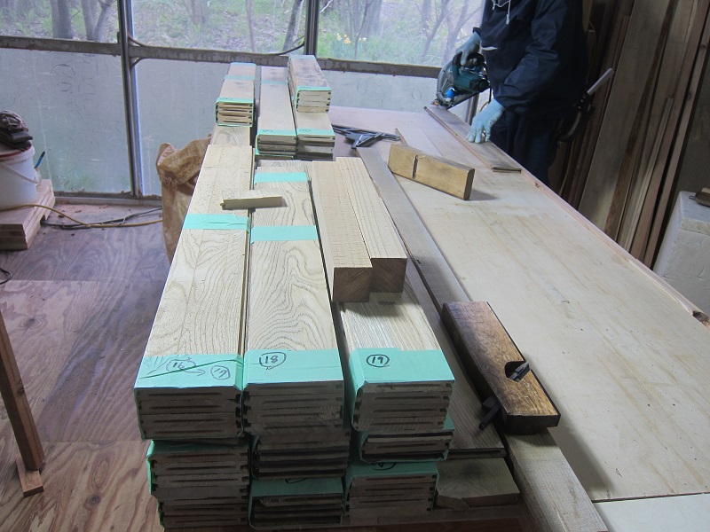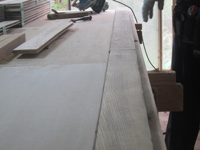 車庫小屋工事は内部の床組みが進んでいるので、ここに貼る予定の古床材の磨きが終わり引き続きで本実の修繕と張込み調整のメンテナンスに取り組んでいます。写真からも伝わると思いますが、とても難しくて大切な作業工程です。本物の木の床だからこそこうした事が可能です。これを知らないと実が合わないから貼れないと使う事を拒否されてしまう場合もあります。ここをしっかり直して貼りやすく仕上げて現場に届ける事が無垢の木の床を使い続ける縁ともなります。場内に居る若手大工にも、こうした仕事をよく見て覚えておくように諭しました。