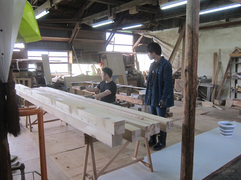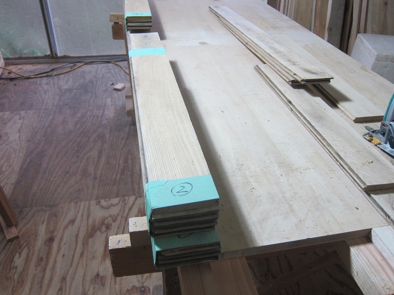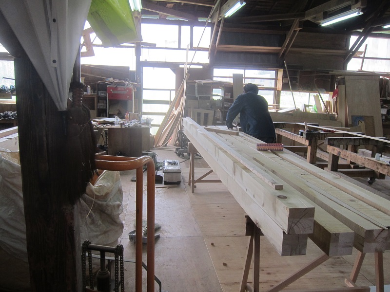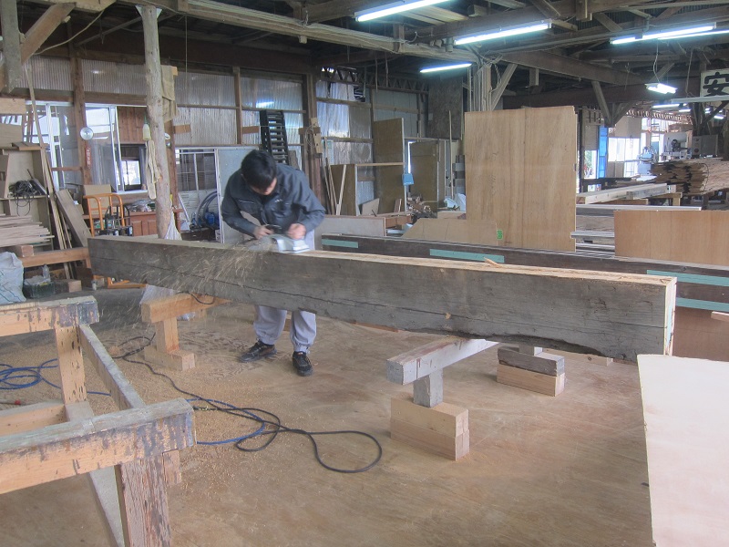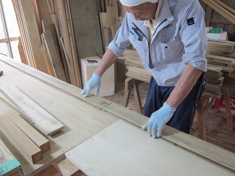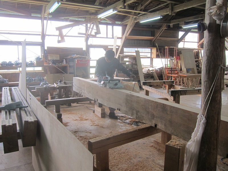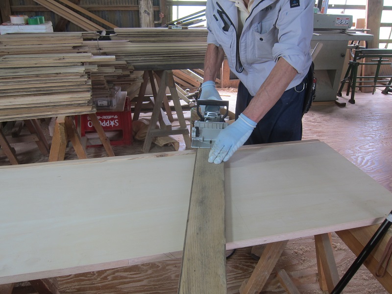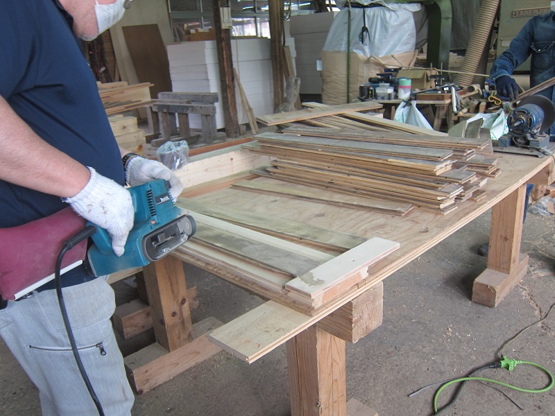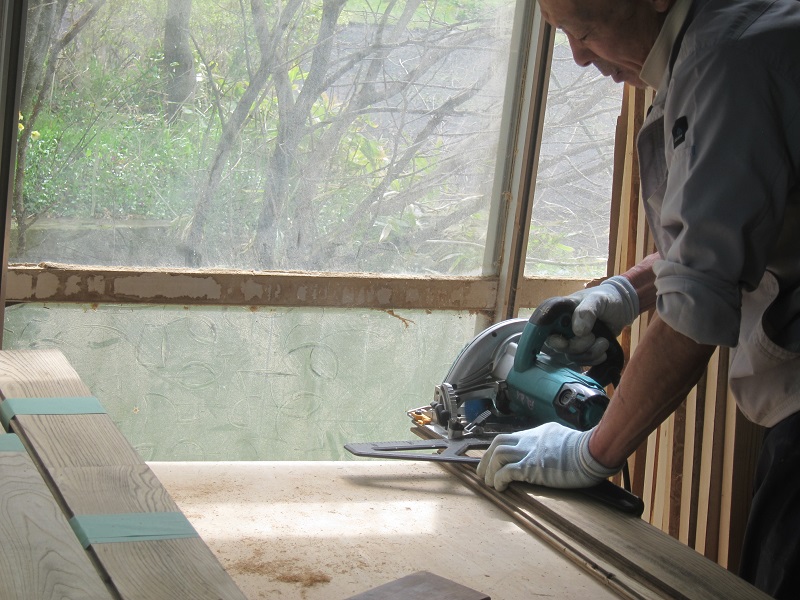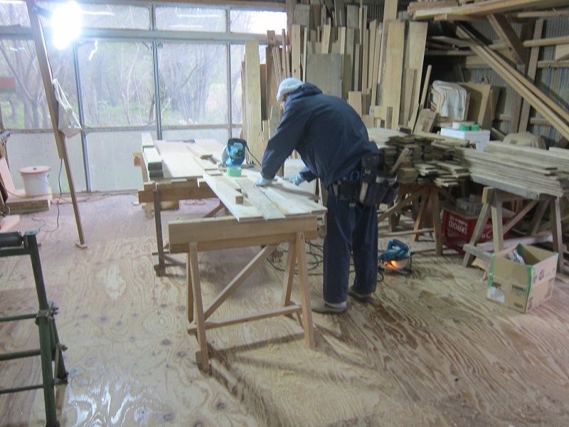 車庫小屋工事は内部の床組みが進んでいるので、ここに貼る予定の古床材の磨きが終わり引き続きで本実の修繕と張込み調整のメンテナンスに取り組んでいます。写真からも伝わると思いますが、とても難しくて大切な作業工程です。本物の木の床だからこそこうした事が可能です。これを知らないと実が合わないから貼れないと使う事を拒否されてしまう場合もあります。ここをしっかり直して貼りやすく仕上げて現場に届ける事が無垢の木の床を使い続ける縁ともなります。場内に居る若手大工にも、こうした仕事をよく見て覚えておくように諭しました。