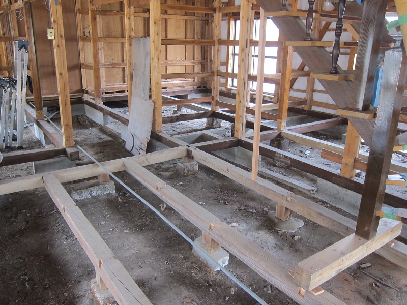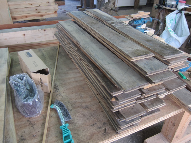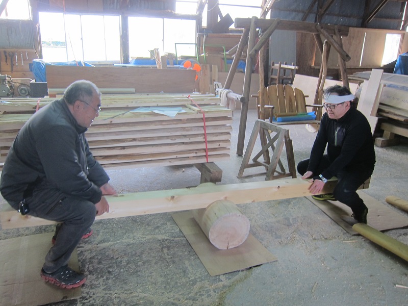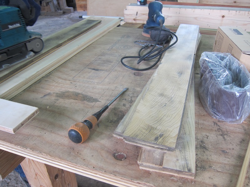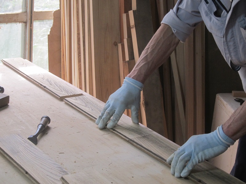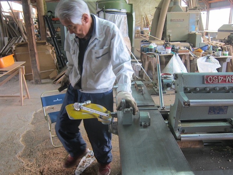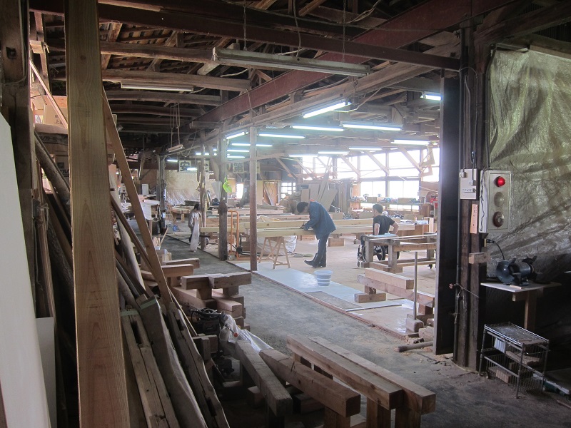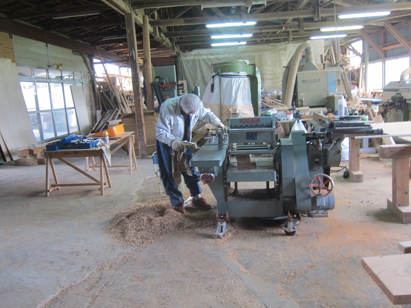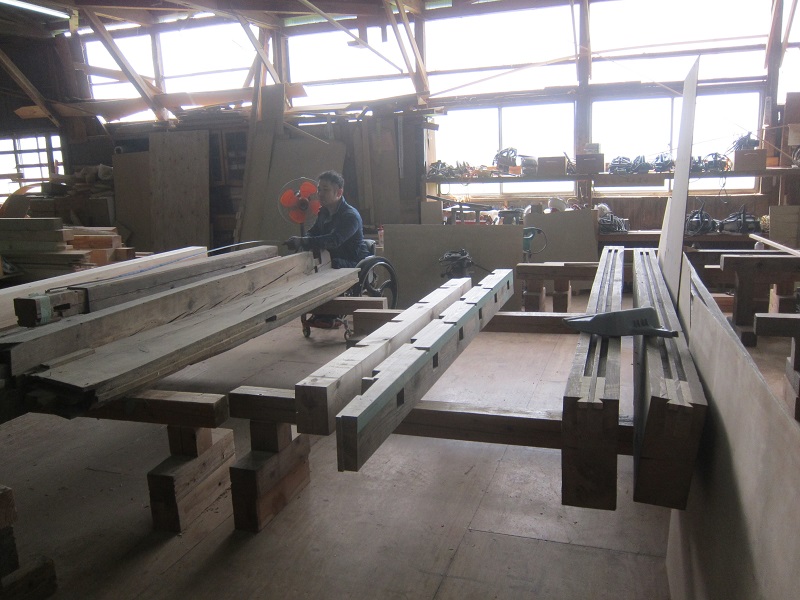 車庫小屋工事は内部の床組みが進んでいるので、ここに貼る予定の古床材の磨きが終わり引き続きで本実の修繕と張込み調整のメンテナンスに取り組んでいます。写真からも伝わると思いますが、とても難しくて大切な作業工程です。本物の木の床だからこそこうした事が可能です。これを知らないと実が合わないから貼れないと使う事を拒否されてしまう場合もあります。ここをしっかり直して貼りやすく仕上げて現場に届ける事が無垢の木の床を使い続ける縁ともなります。場内に居る若手大工にも、こうした仕事をよく見て覚えておくように諭しました。