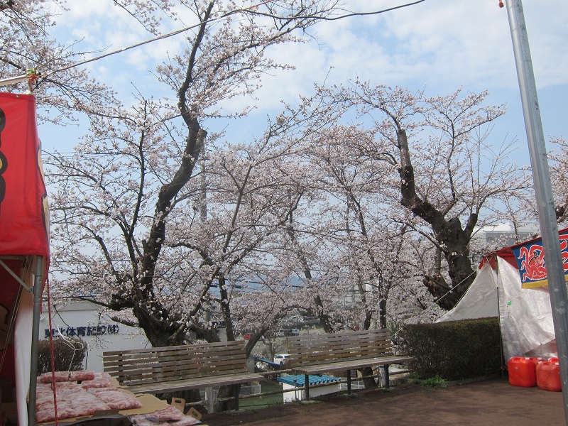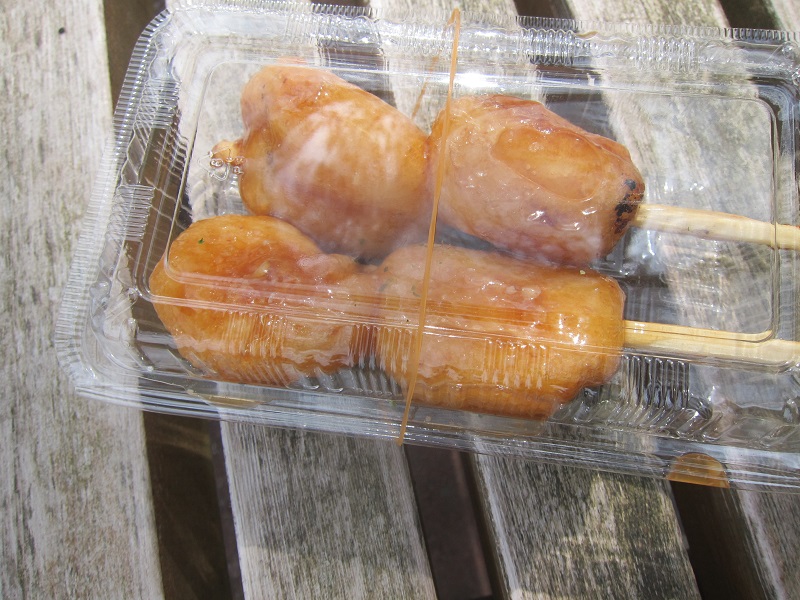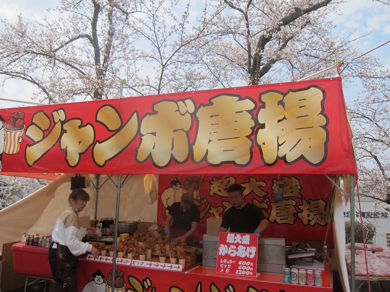 花より団子の例えの如く懐かしの一休だんごを買ってベンチで一休みの花見をしました。巨大唐揚げのお店の横に鶏肉の冷凍パックが山の如しでした。