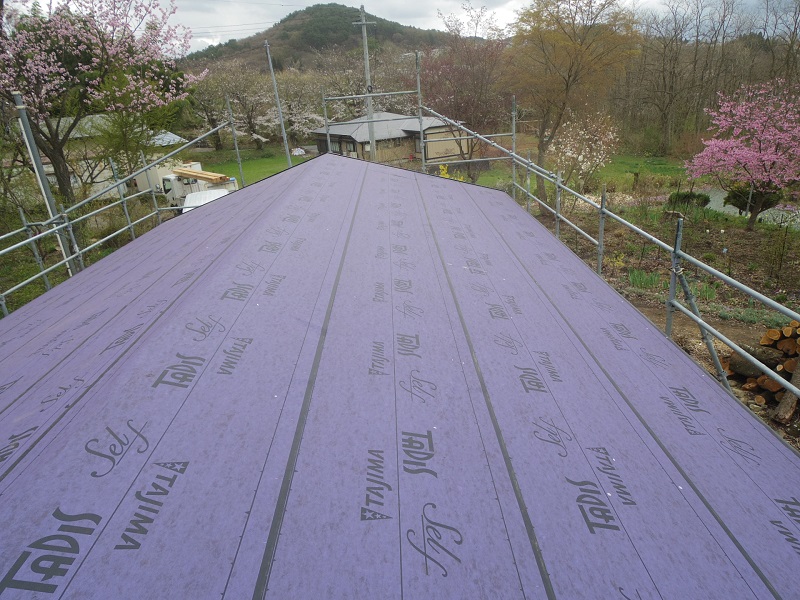 屋根断熱を終えて、構造面材の屋根野地も敷き込んで屋根の防水シートの張込みも進んで、外周部の構造面材の張込みも進み雨が降る前に外囲いが出来て来た桜に囲まれている車庫小屋の新築工事現場です。