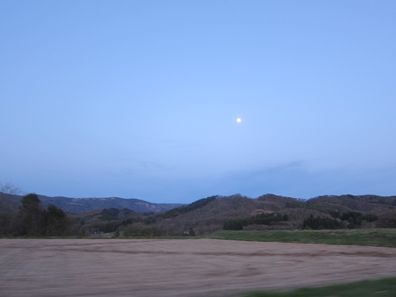 通勤路、西の山は岩鷲山で東の姫神山にはイーグルにも見える緑の森の姿があって、大鷲が飛ぶにふさわしい大空には筋雲が美しい春空です。月も浮かび、そろそろ満月です。