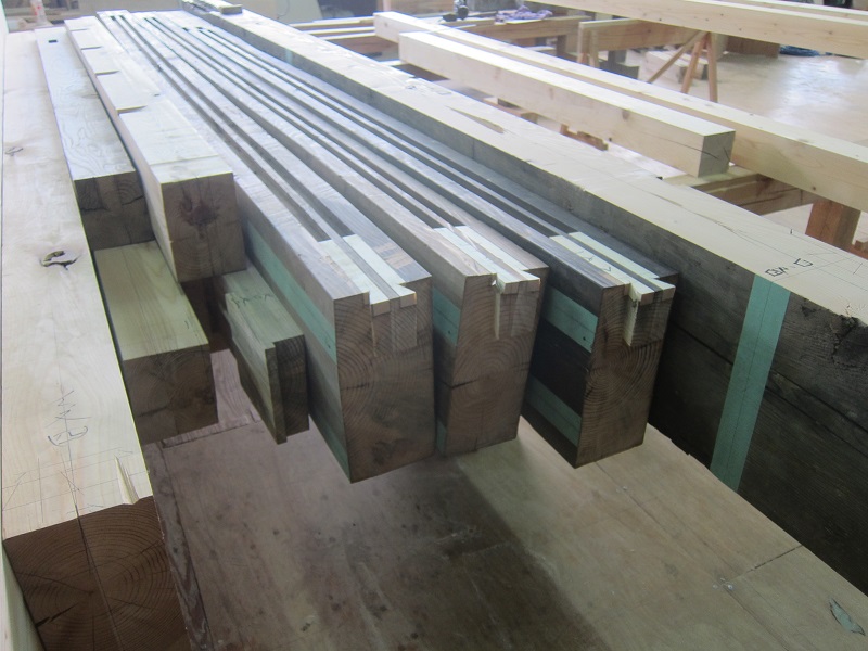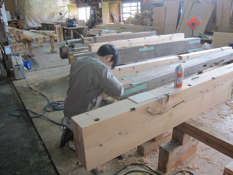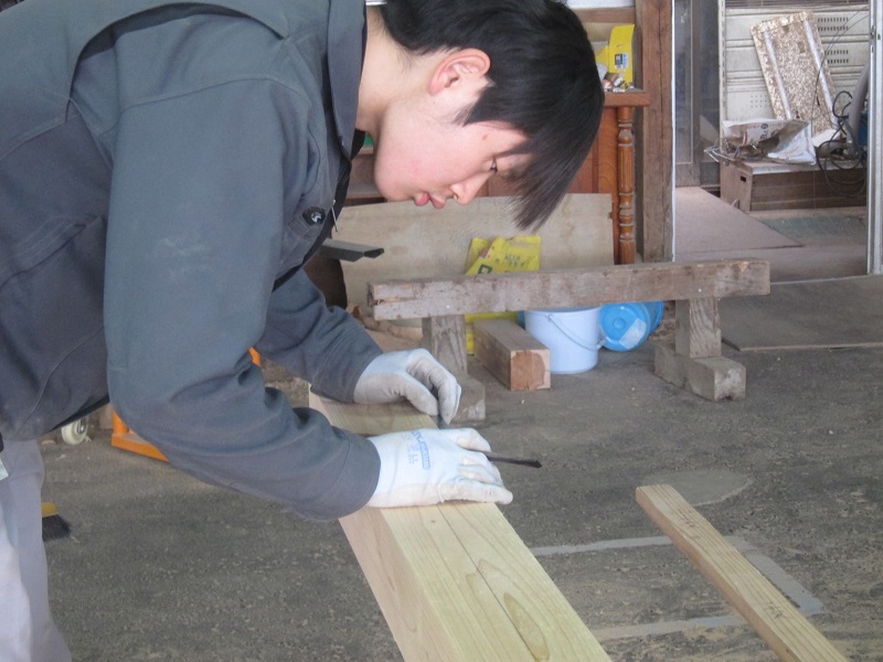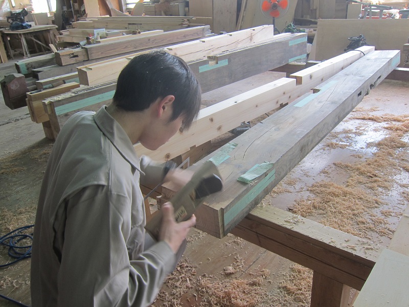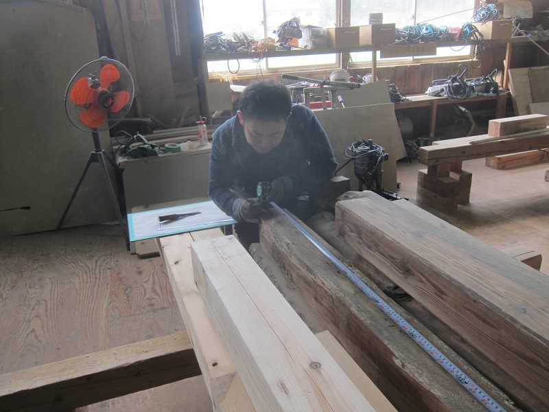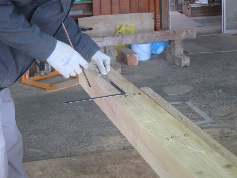 古材を再利用する車庫の木組みの準備に取り組んでいます。新材を使用する部分もあるので、そこは若手が墨付け刻み体験をしています。手刻みも墨付けも実際に行う事で体に沁み込ませて覚えるとても大切な事です。
