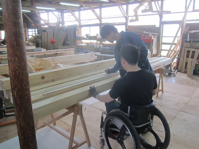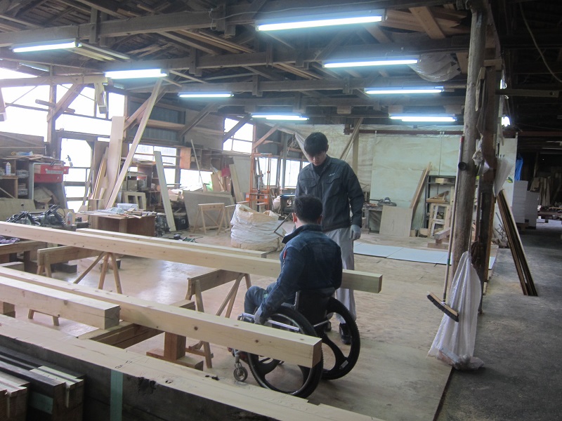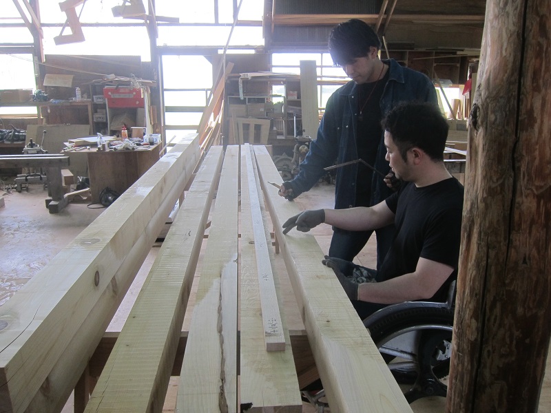 場内では、若手による新たな墨付けが始まりました。車椅子大工が確りサポートしています。その横で、手刻みの取り組む若手の姿も見られます。