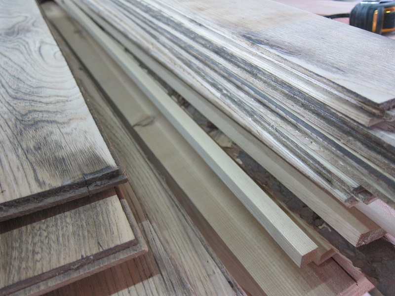 改修工事の際に取り外して取り置いてあった無垢の床材の釘を抜き塗装を剥がしてまた床材として使える様に古材再生に取り組んでいます。ブナや楢材の床です。合板だと解体処分として捨てるだけになってしまいますが、本物の木で作られた物は、この様に人が手を掛ければまた付ける物に出来るのです。地球環境がとても厳しい現実に直面している現代だからこそ、方向転換を果たして、こうした取り組みに目を向ける事も大切だと感じます。