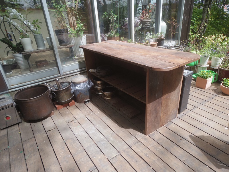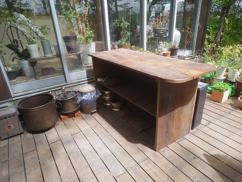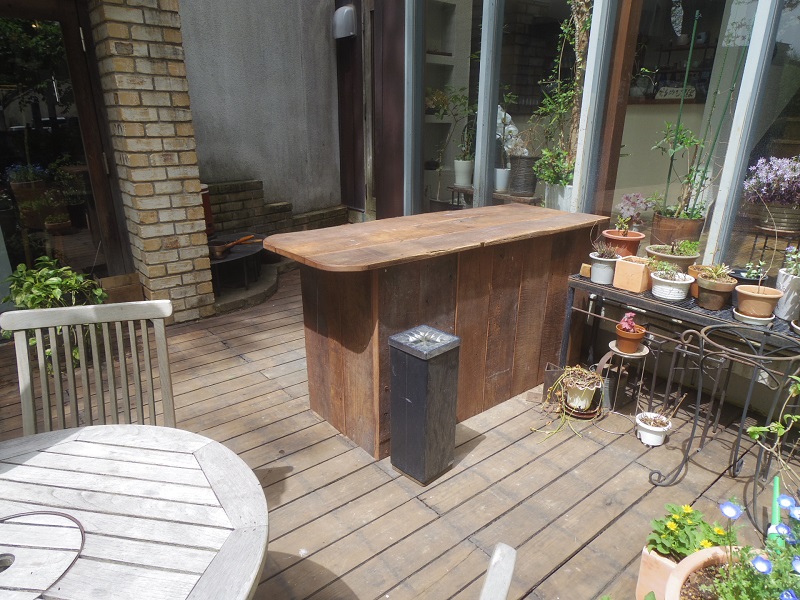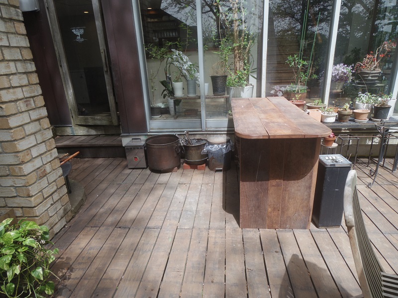 ピョンピョン舎様本店の中庭に遊具に続いてカウンター棚を製作させて頂きました。材料はチーク材材でお客様からのご支給品です。ここは本当に素敵な中庭です。