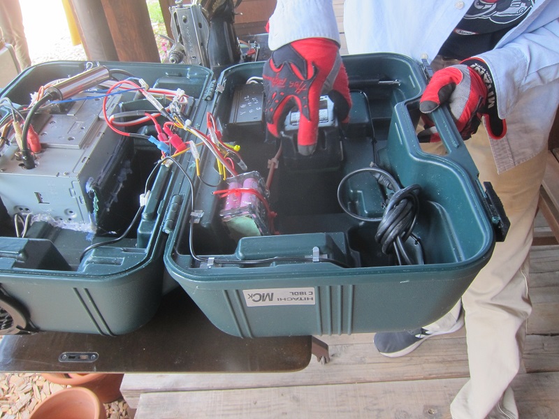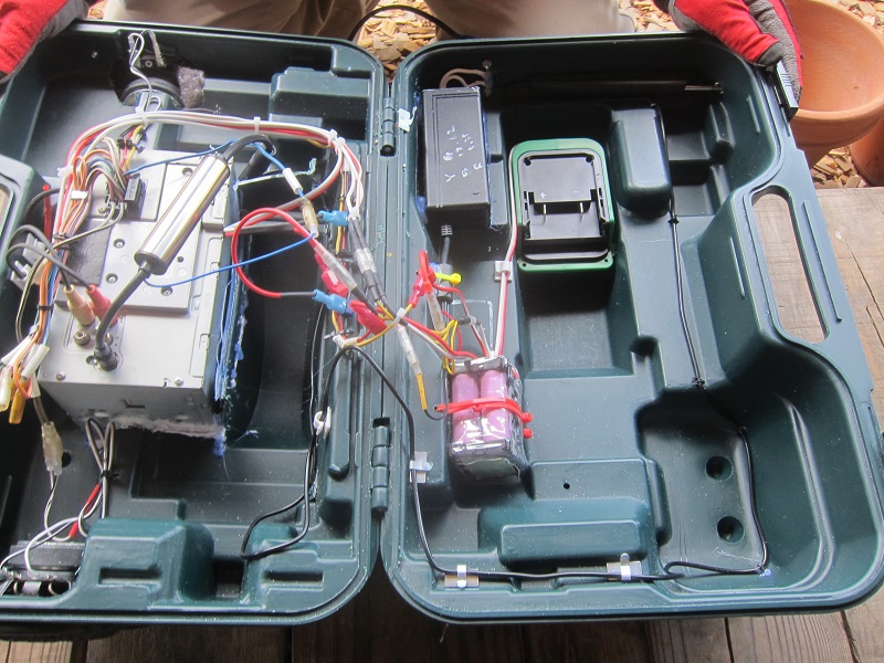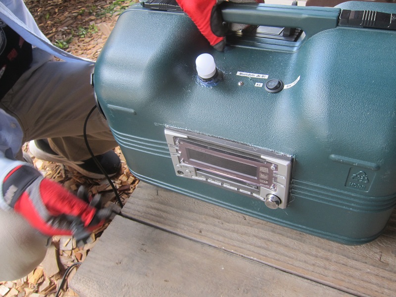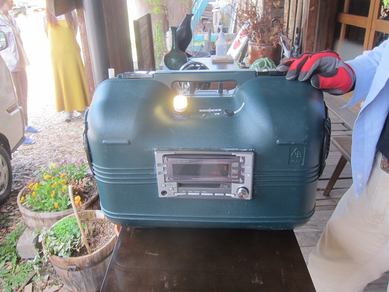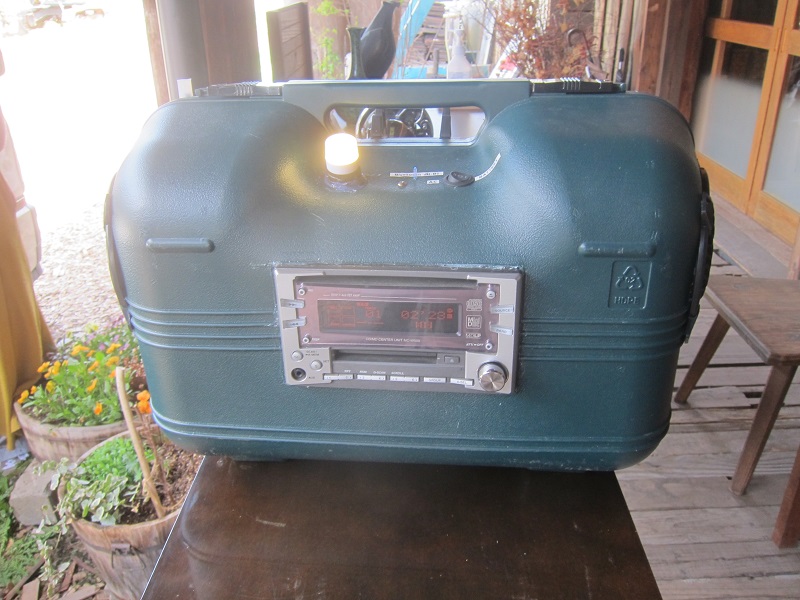 自作コンポが届きました。電気丸鋸ケースを利用した、カーコンポ類の部品を組み込んだもので、ラジオも聞けるし、CDもMDも掛ける事が出来ます。電源はコードもありますが、充電器も使えるので持ち歩き可能です。楽しい仲間に囲まれています。