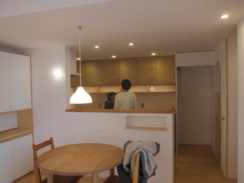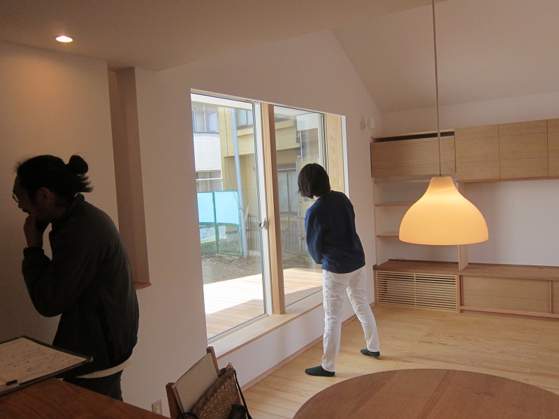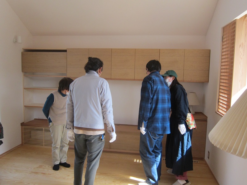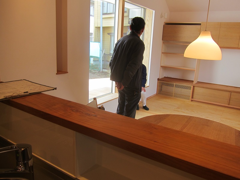 土日二日間の見学会無事開催させて頂きました。ご来場いただきました皆様に心から御礼申し上げます。何より、会場をお貸しいただいたお施主様に感謝御礼申し上げます。見学会会場の掃き出し窓の取り付け位置が好評でした。通常より高さを上げている事で、腰掛にもなるし、窓が大きく感じられて室内が明るく感じられるとのご感想を沢山いただきました。そして、台所の造作類を建築予定中の新居の参考にして頂けたようです。有難い事ですね。