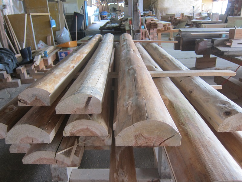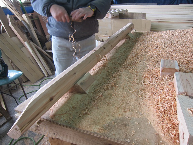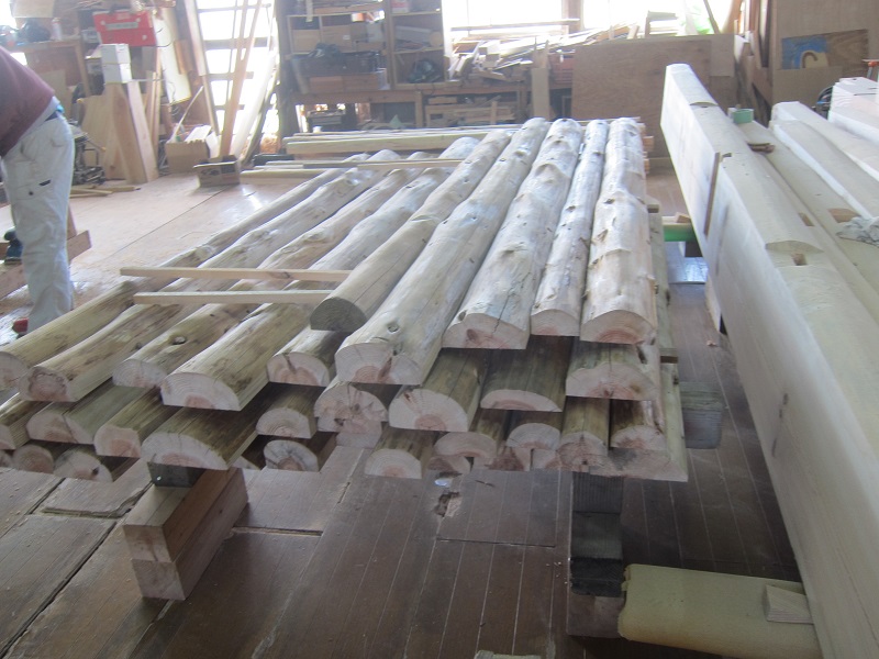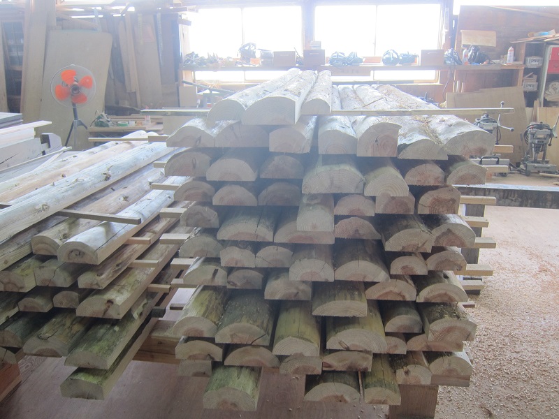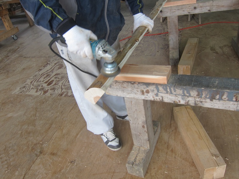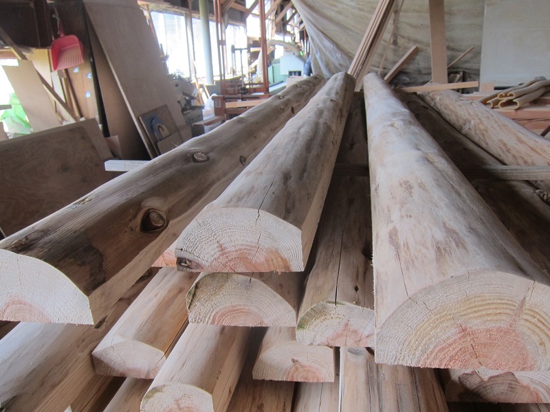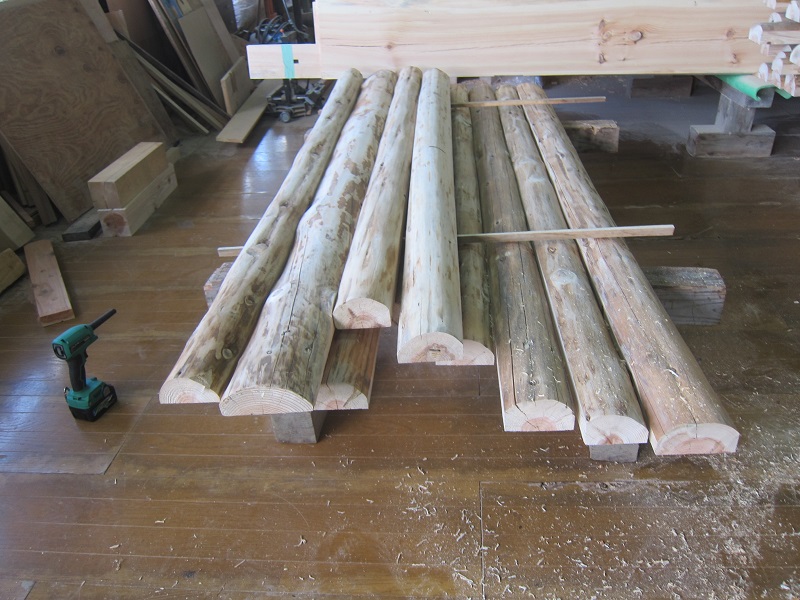 杉の丸太を半割にした丸太の壁を創る予定です。間伐材の利用に良い方法かとも思い、皆で磨き込んでいました。山小屋風の室内にとのご要望でこの様な取り組みを行っていました。