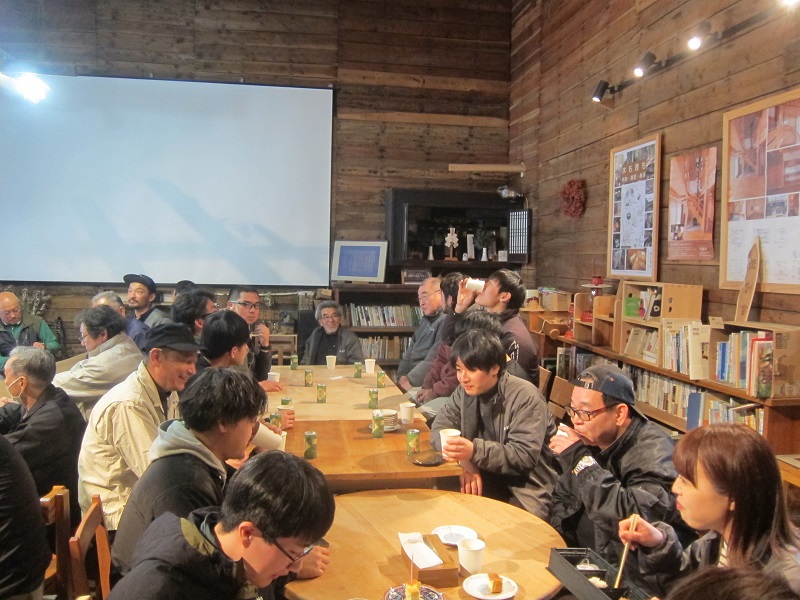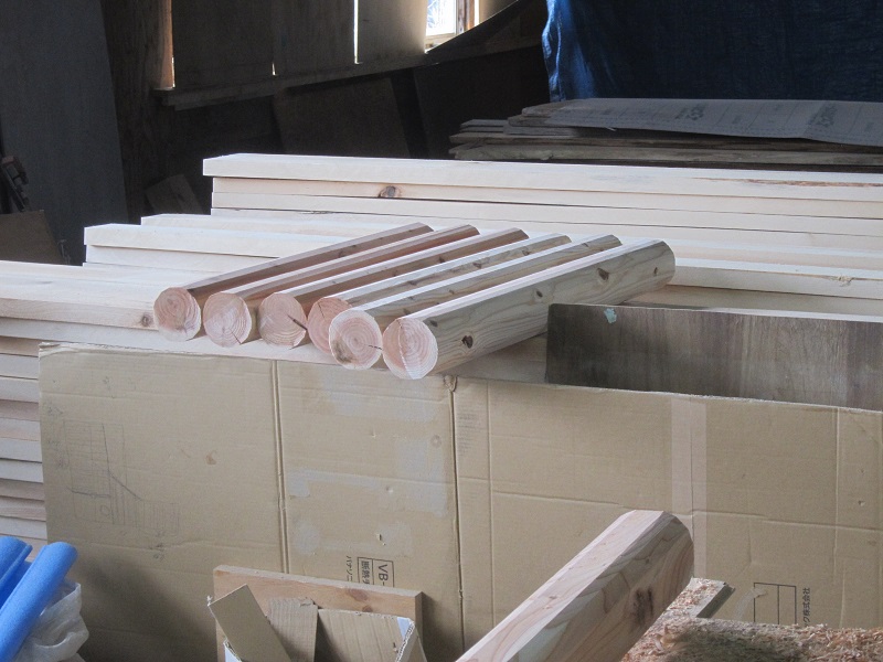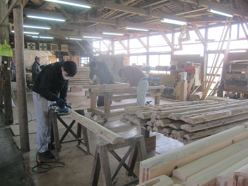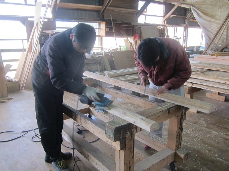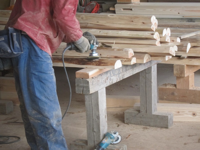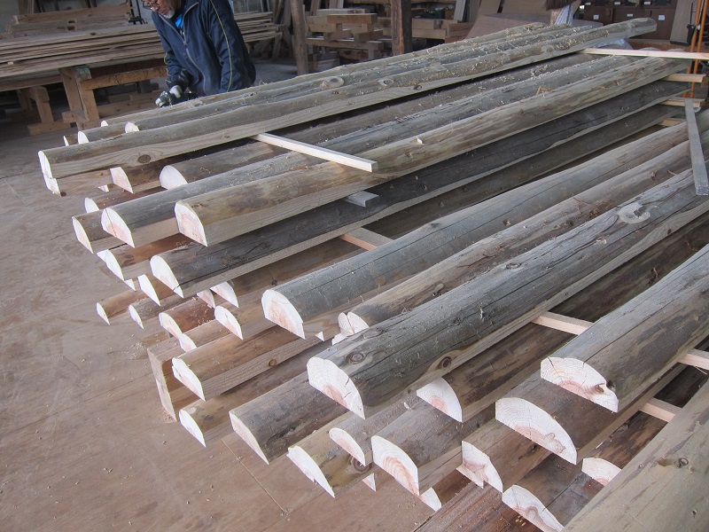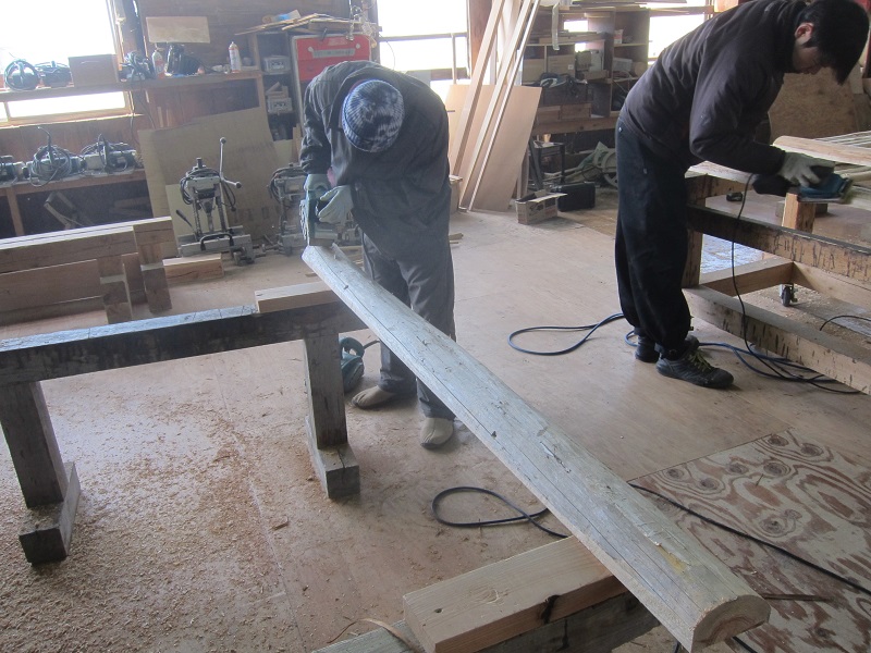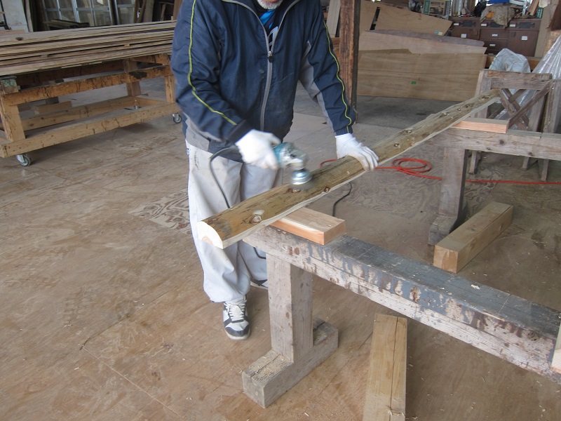 杉の丸太を半割にした丸太の壁を創る予定です。間伐材の利用に良い方法かとも思い、皆で磨き込んでいました。山小屋風の室内にとのご要望でこの様な取り組みを行っていました。