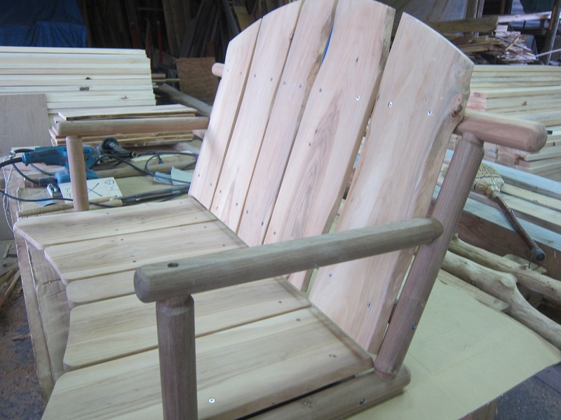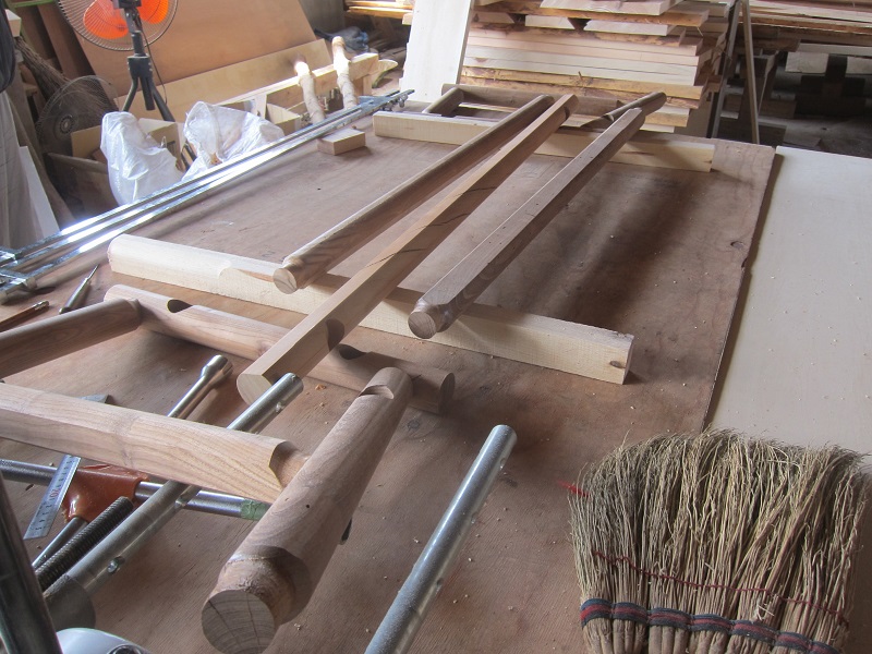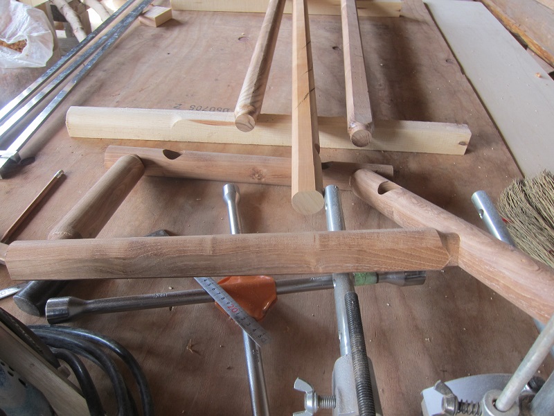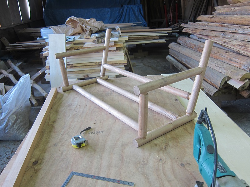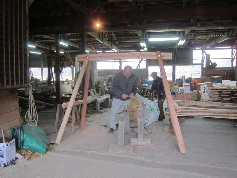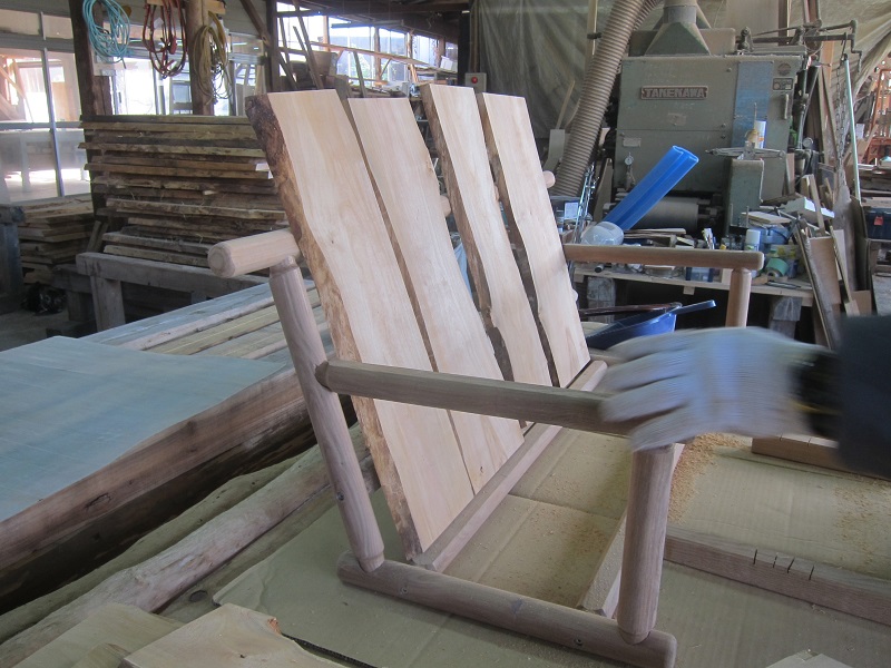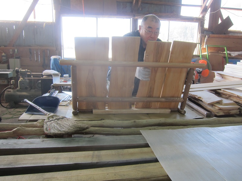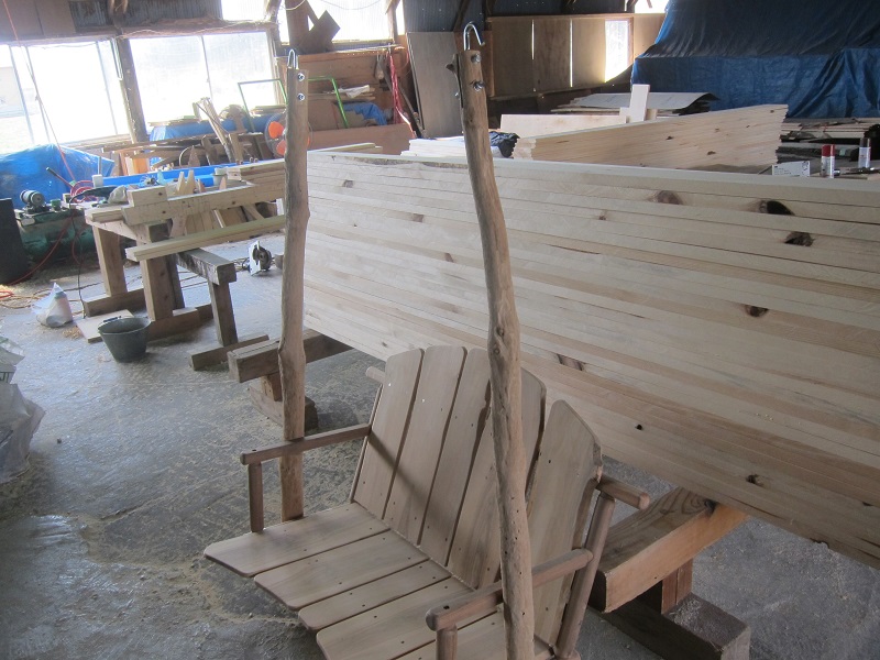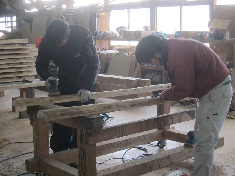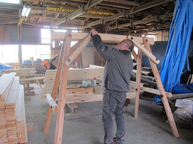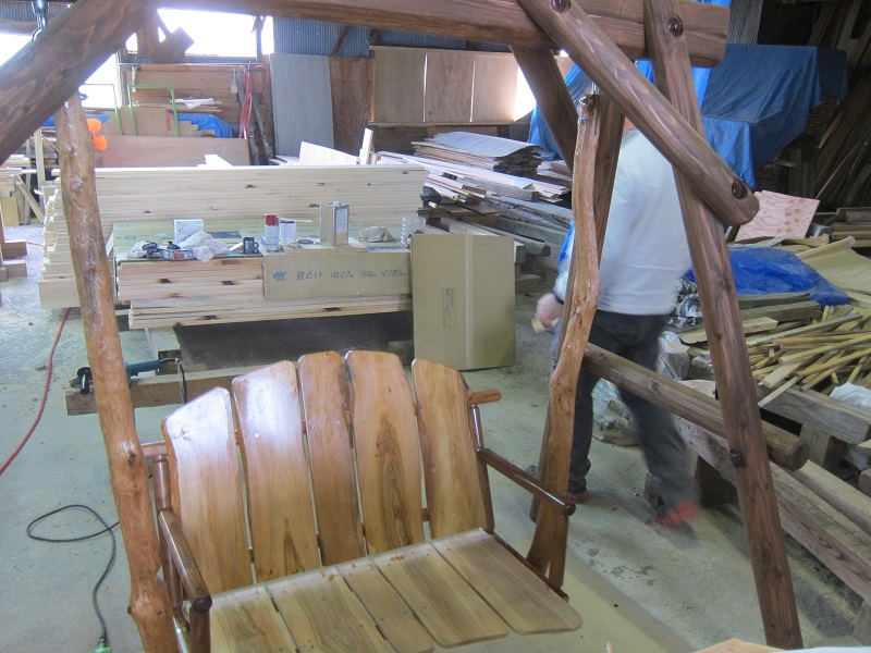 保育園のハイハイ板造り後は、ブランコ造に取り組む家具職人です。各所に工夫が凝らされていて、これまでとはまた違ういい雰囲気の遊具が出来そうです。