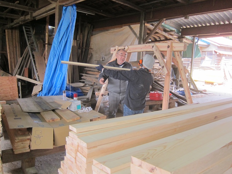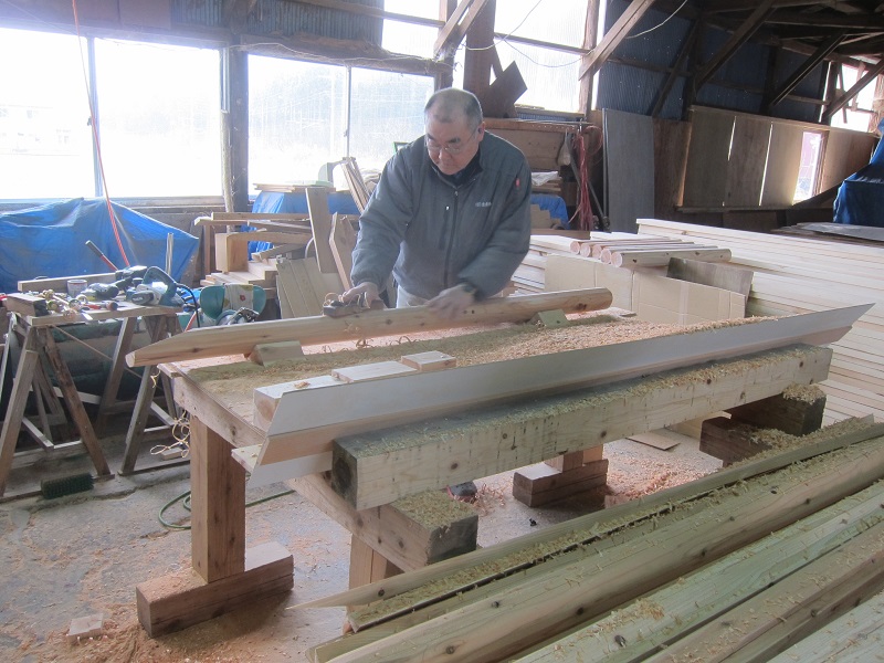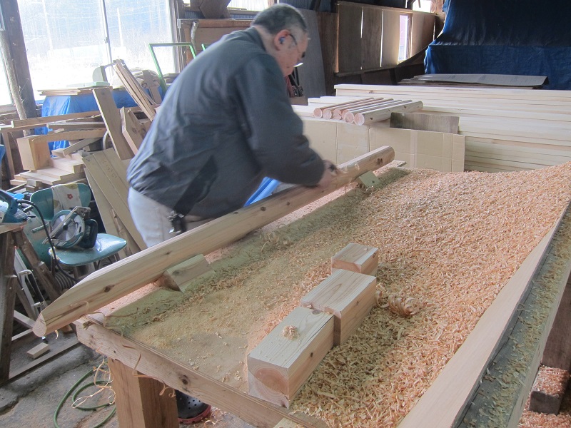 モルダー加工は本実造りに作業が移行していました。その作業を見詰めながら指導と共にブランコ造も塗装を終えて完了間近です。