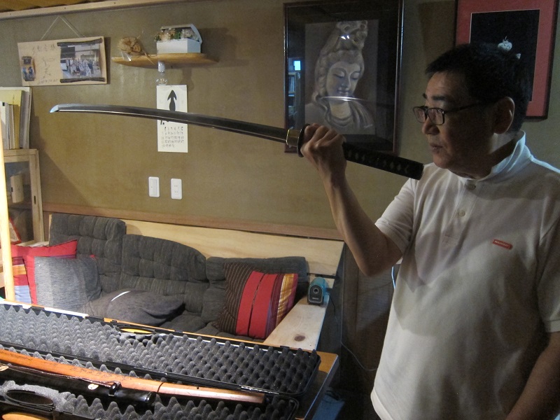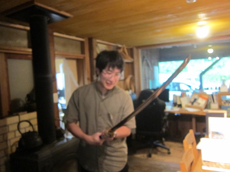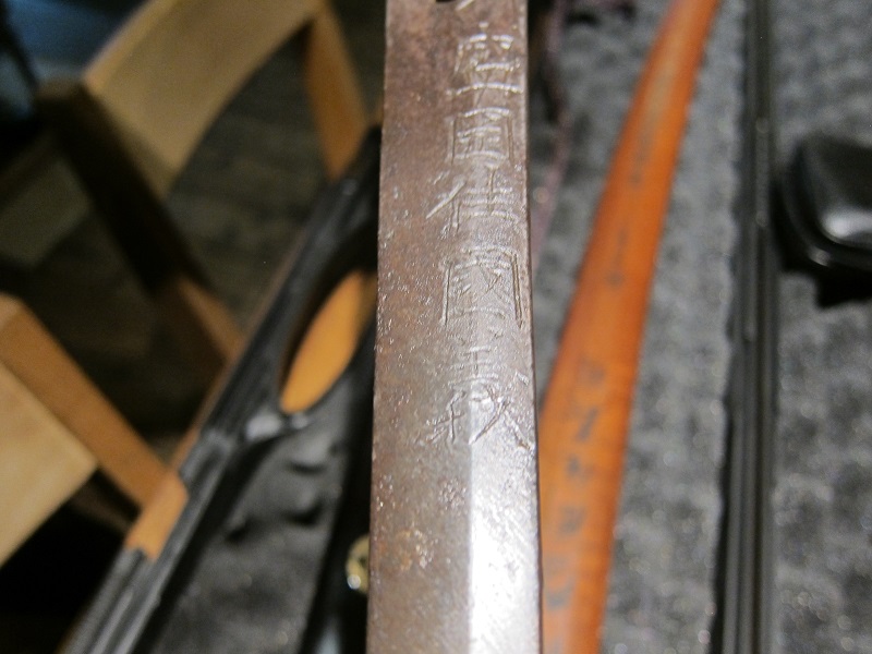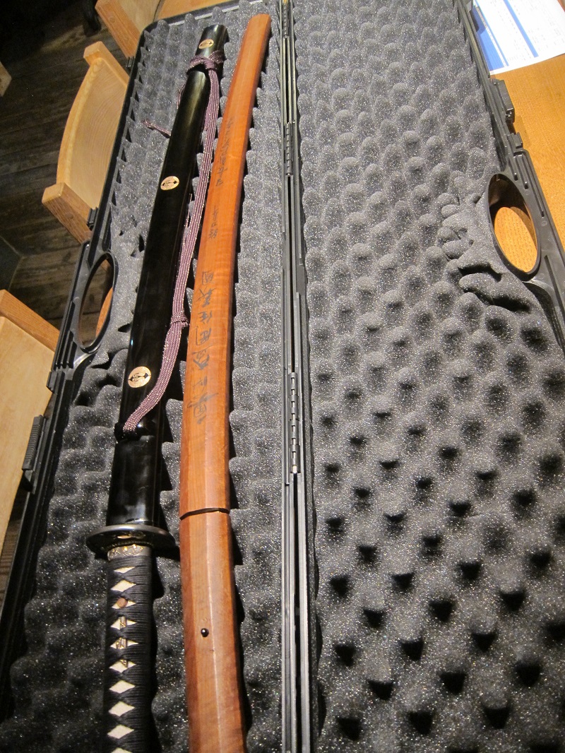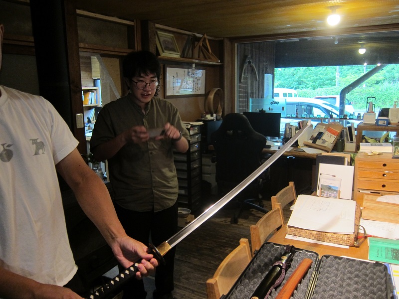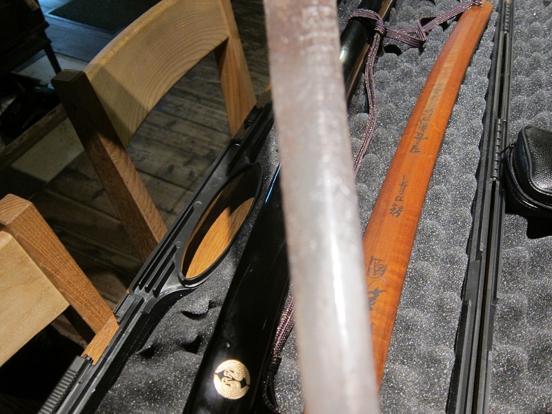 先日、当社に盛岡藩時代に作られたとみられる刀が本件に戻ったとのニュースが岩手日報に紹介されておりましたが、その刀をインターネットオークションで落札された全日本抜刀道連盟岩手支部橋野副会長が当社の畳表を引き取りついでに持ってきて見せて下さいました。同藩お抱えの刀工新藤国義作との事です。当社では、古い畳表を試し切り様に寄贈させて頂いておりますので、そうした御縁でのことでした。