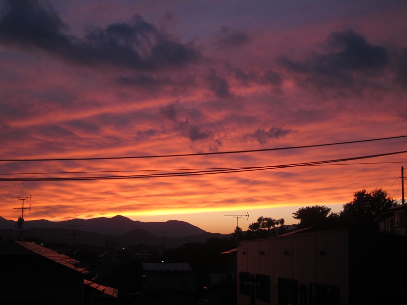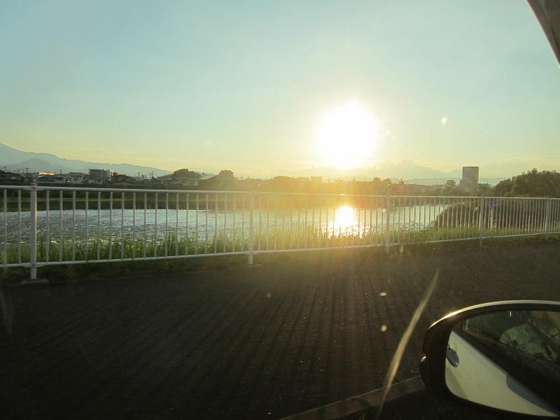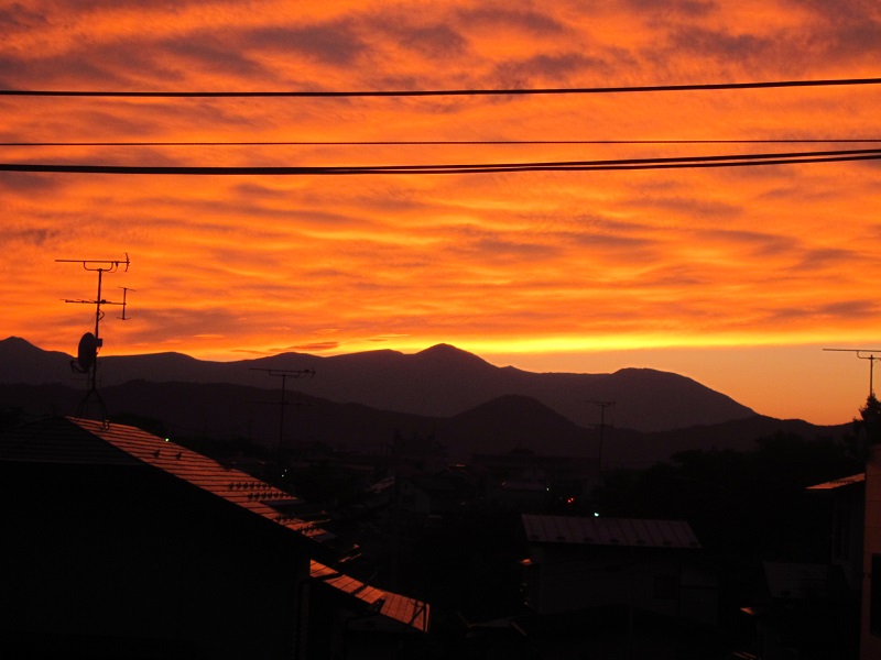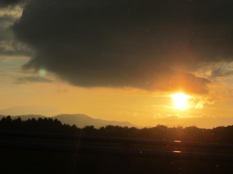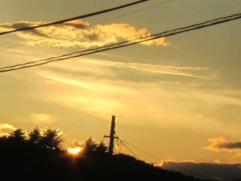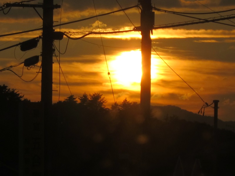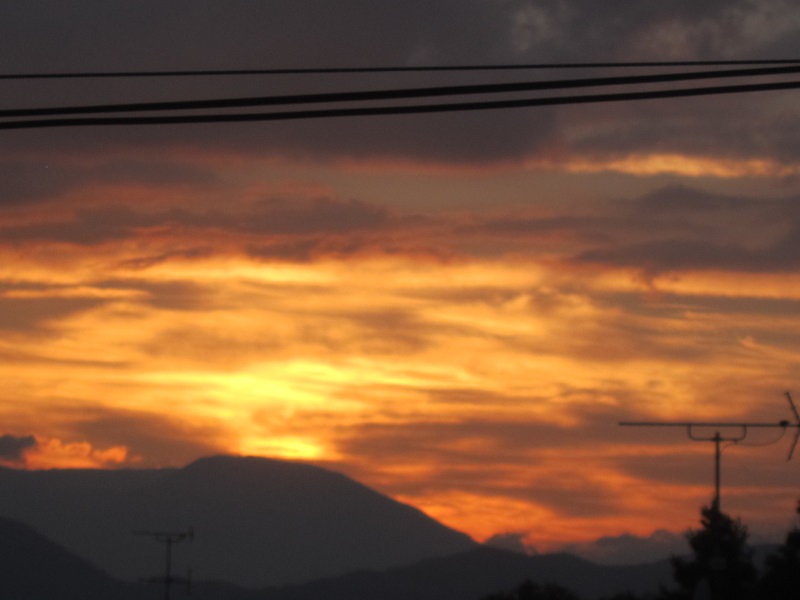 今年の暑さを物語るかのような、夕焼けが出ています。空も焼けているイメージです。山に沈む太陽が輝く瞬間が美しく見えます。