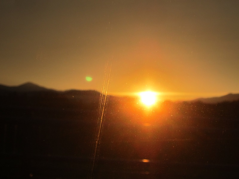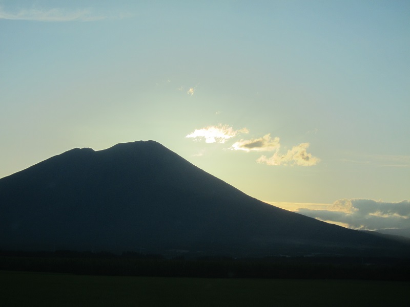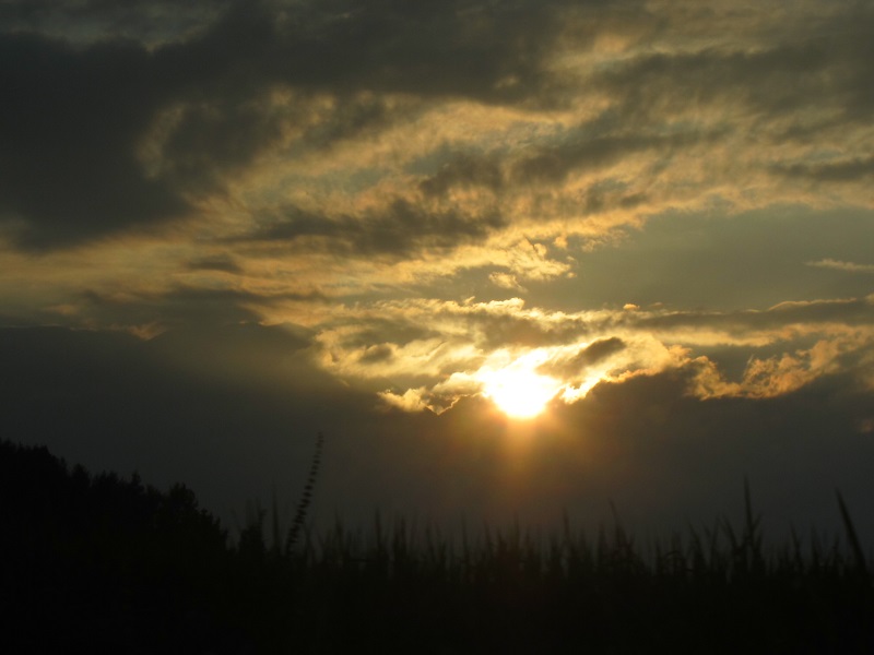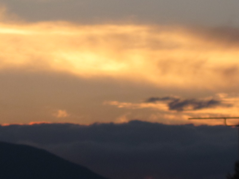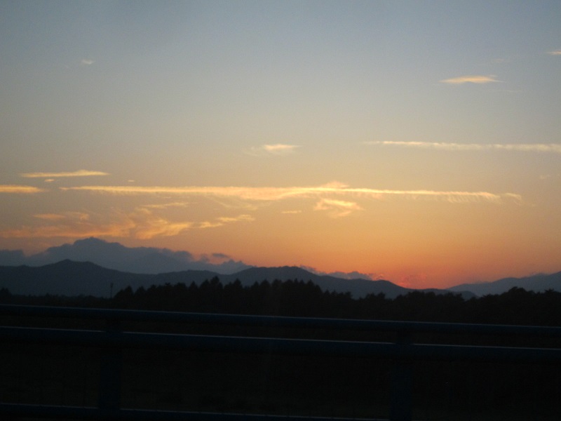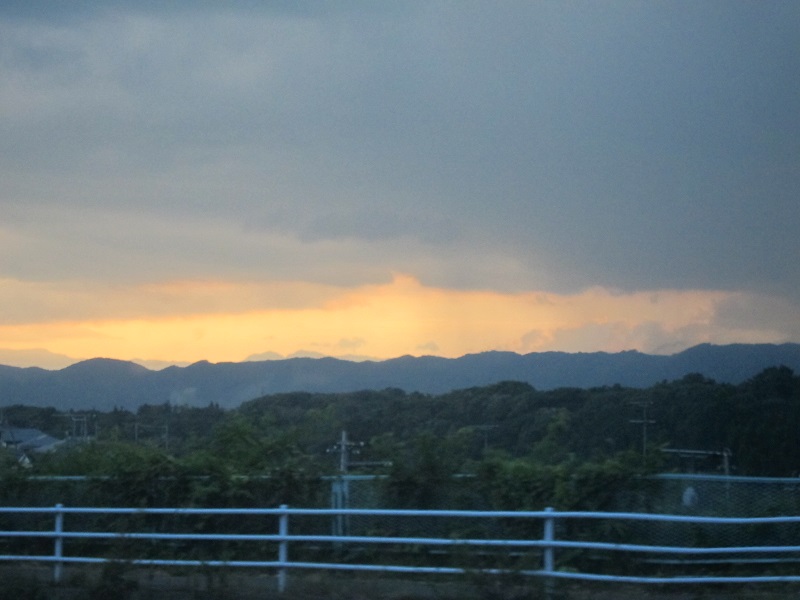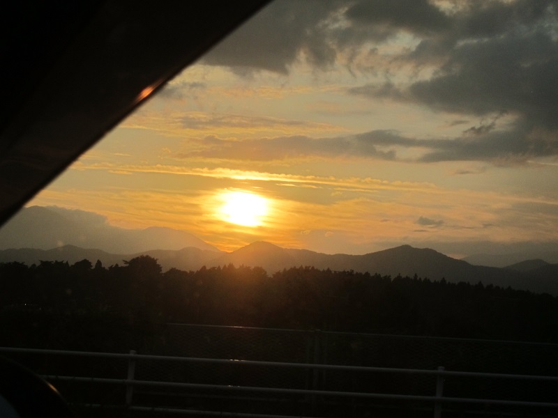 今年の暑さを物語るかのような、夕焼けが出ています。空も焼けているイメージです。山に沈む太陽が輝く瞬間が美しく見えます。