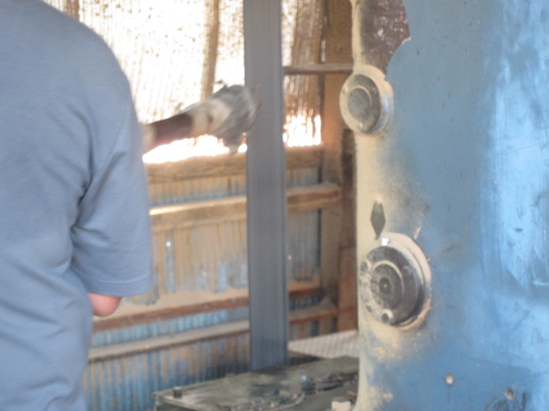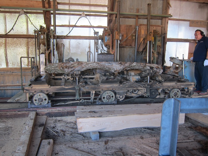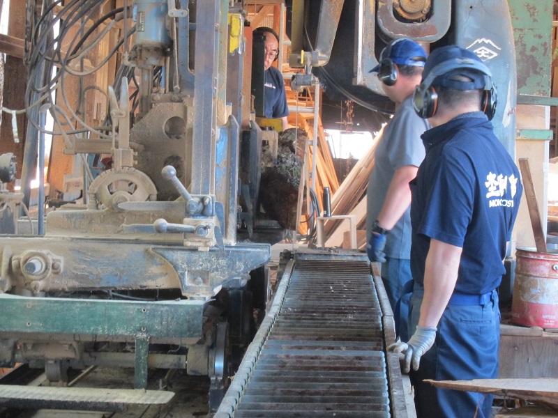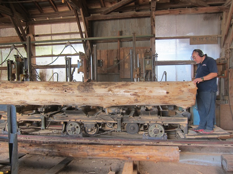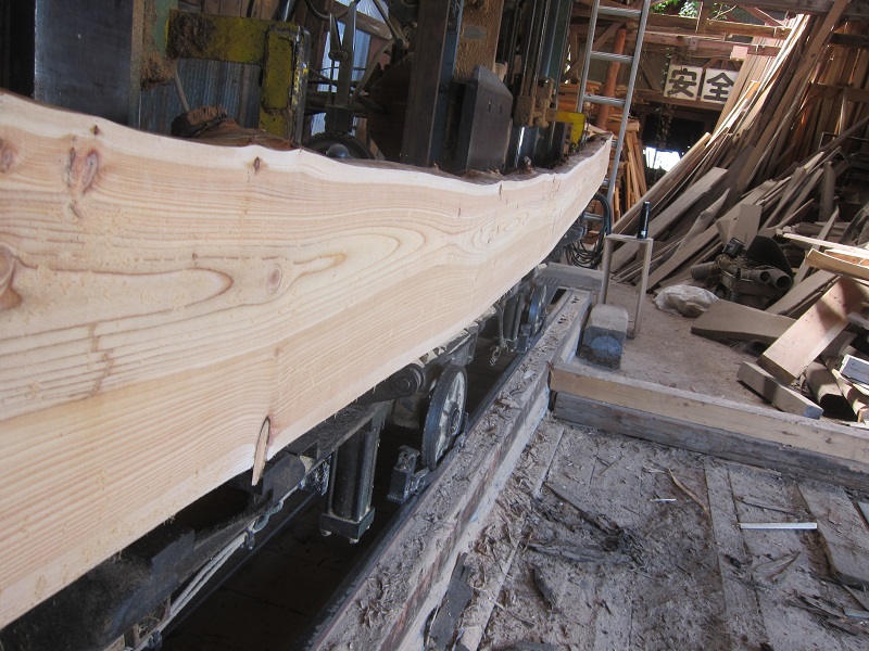 雫石山林から罰倒木を運び出して水圧で樹皮を剥がした杉丸太の製材を進めました。台車は電動で動く機械仕掛けですが、その操作及び受け手は昔さながらに人力です。機械化オートオペレーションで自動的に製材される世の中で、ここだけは木を見て板を取り柱を取る木の年輪を見詰める作業が今だに取り組まれているのです。時代が変わろうとしている歴史の中間点であがく様に必死に人力での姿がここに見られるわけです。