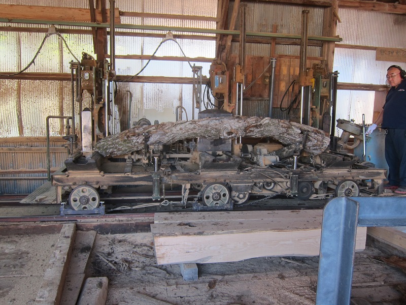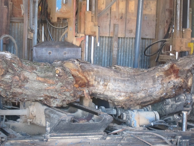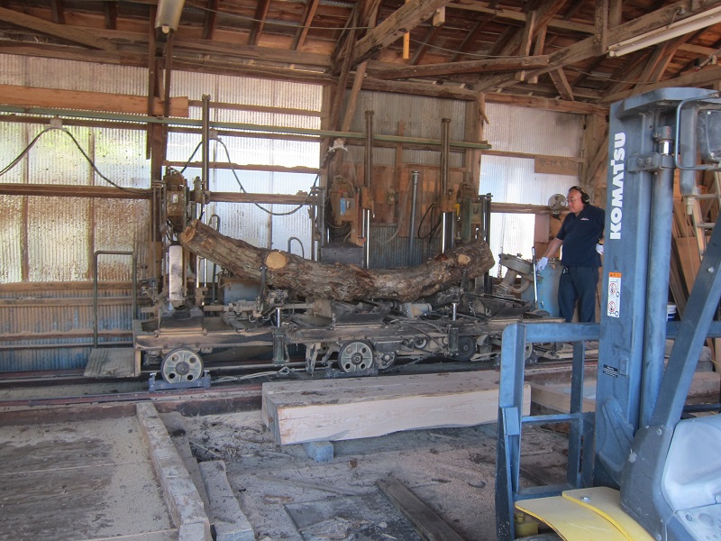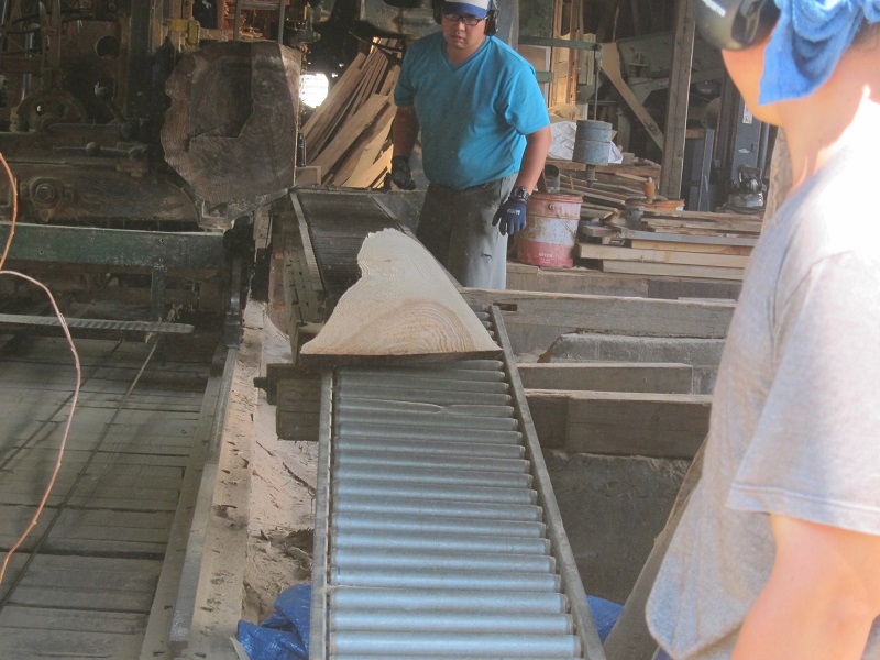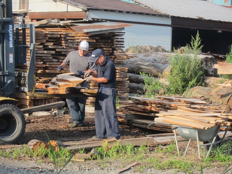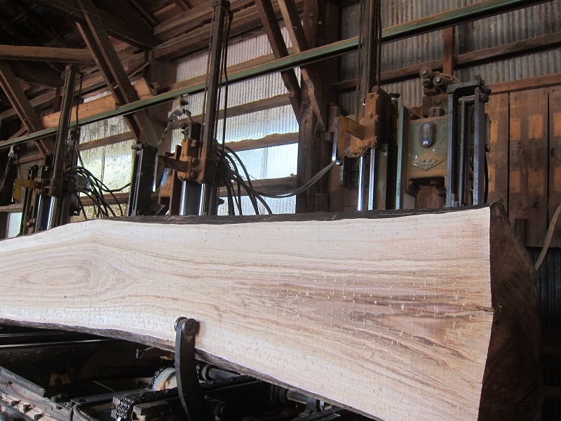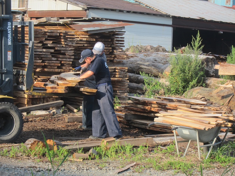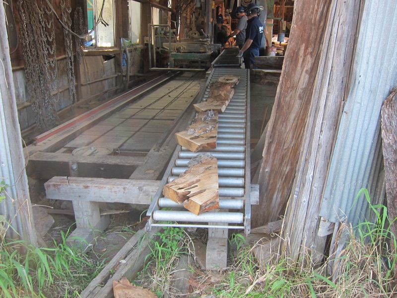 栗の曲がり材の製材に取り組みました。台車上で、アーチにして爪で押さえて製材して、今度はひっくり返して反転させた逆アーチにするなどチェーンベルトで位置を調整するなど見ていると単純に製材出来る代物でないことが分かります。受け手も、鋸に水を打ちローラーで端材を搬出するなど手伝いの手間も相当掛かります。しかも挽いてみて穴だらけで製品にはなりそうもない状態です。でも栗なので、クサビにも使えるし、避けた所の杢目は良い感じです。真直ぐな材を単純日製材する方が合理的な事も理解できます。それでも人の手でいつかは良い材に大変身する可能性も捨てきれないものです。