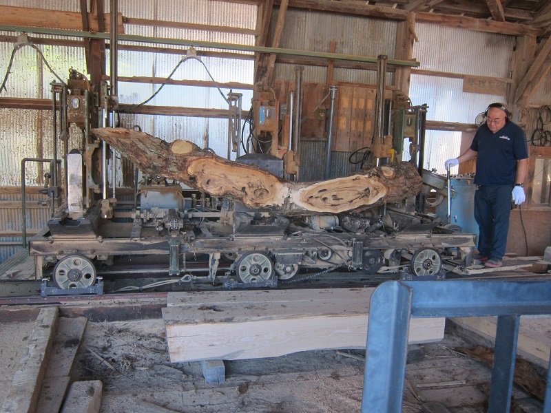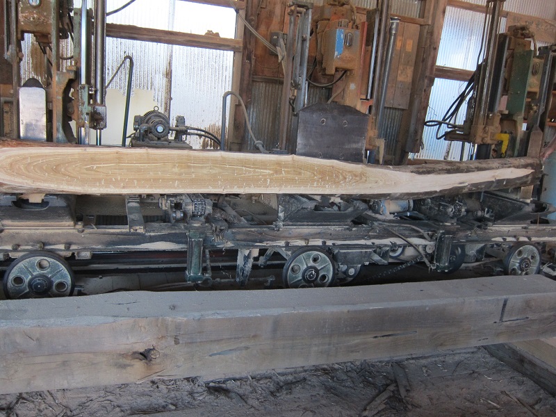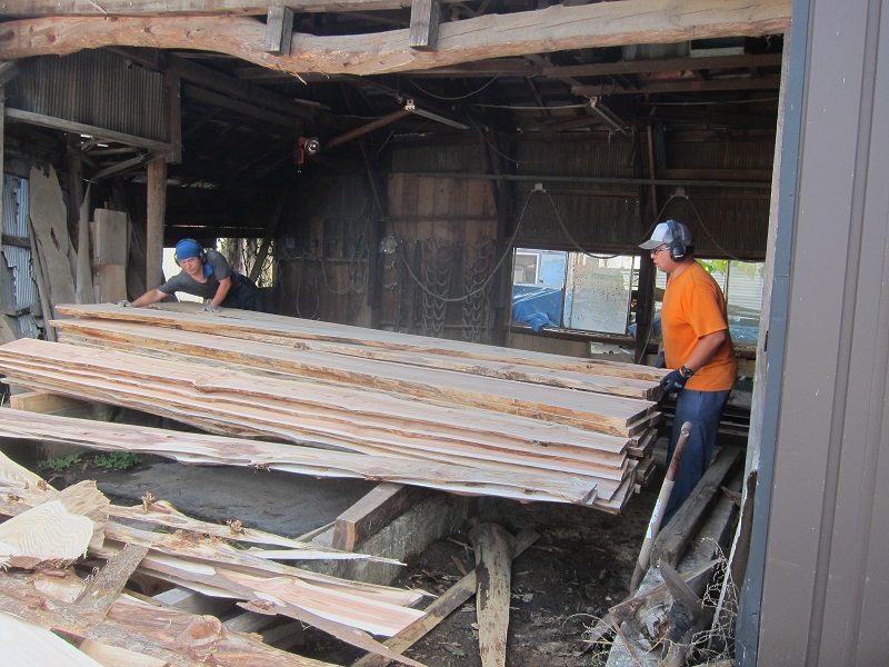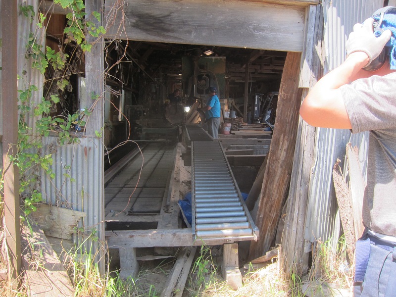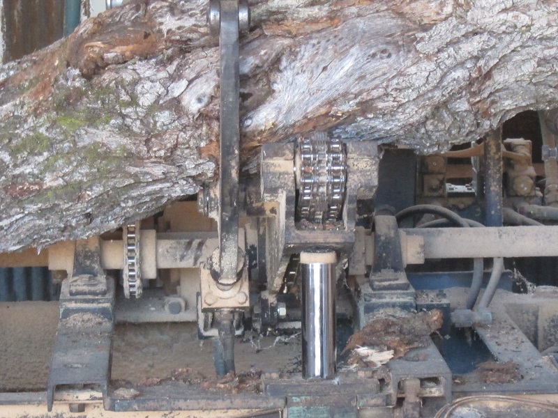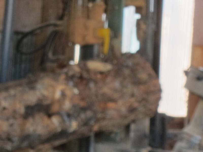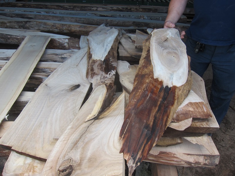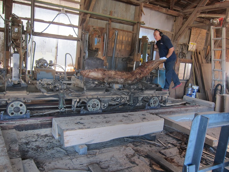栗の曲がり材の製材に取り組みました。台車上で、アーチにして爪で押さえて製材して、今度はひっくり返して反転させた逆アーチにするなどチェーンベルトで位置を調整するなど見ていると単純に製材出来る代物でないことが分かります。受け手も、鋸に水を打ちローラーで端材を搬出するなど手伝いの手間も相当掛かります。しかも挽いてみて穴だらけで製品にはなりそうもない状態です。でも栗なので、クサビにも使えるし、避けた所の杢目は良い感じです。真直ぐな材を単純日製材する方が合理的な事も理解できます。それでも人の手でいつかは良い材に大変身する可能性も捨てきれないものです。