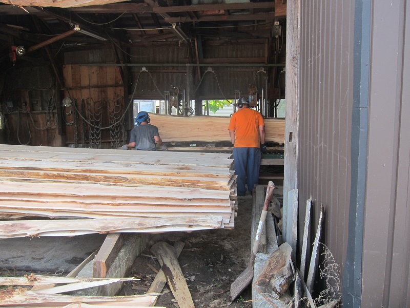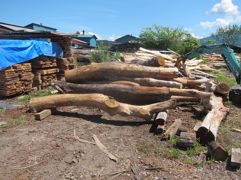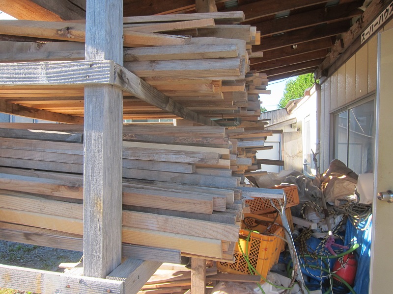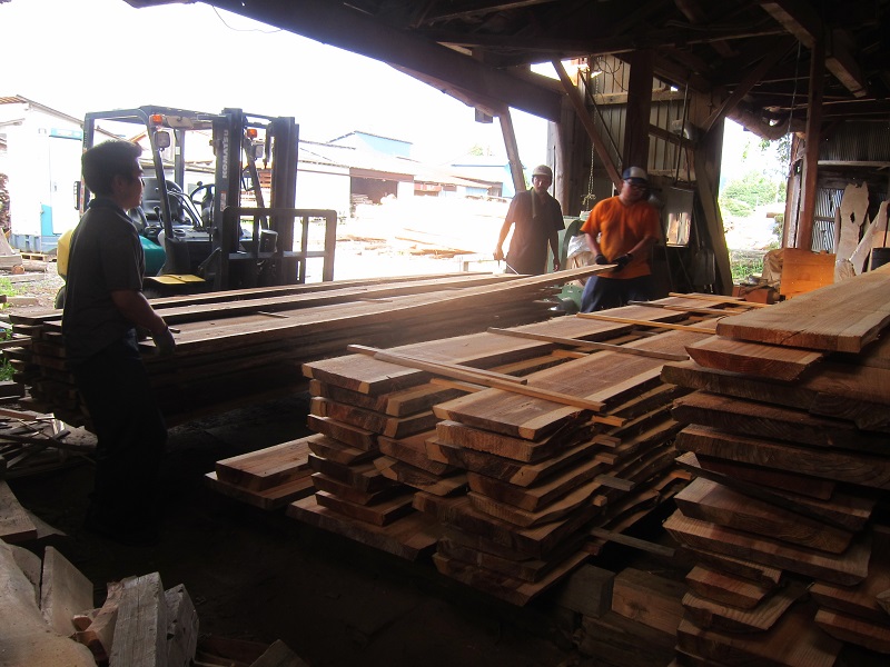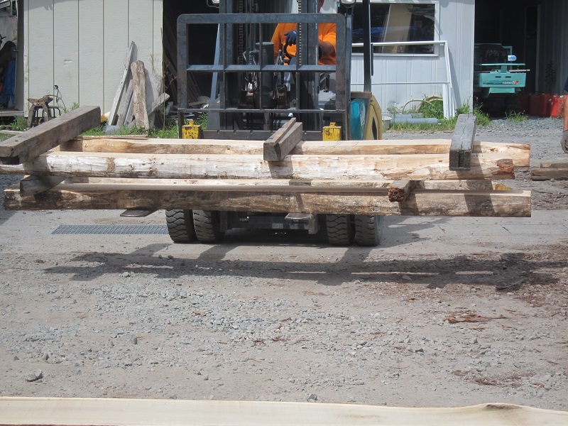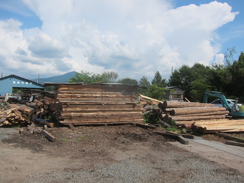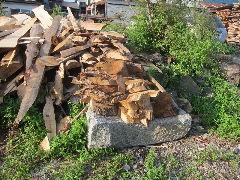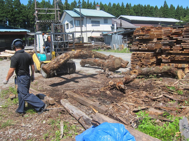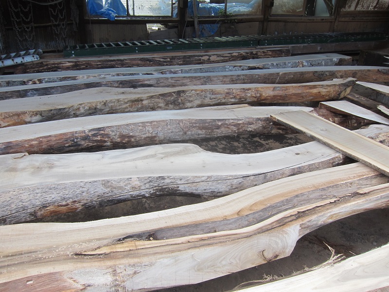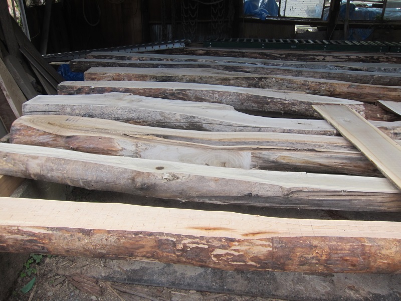 休み前は、栗や胡桃に朴などの雑木の製材を行いました。クルミの大黒柱は向こう5年以上は乾燥時間を要すると思われます。丸太の様態でこのウネル曲がり状態でしたが、製材してみると、数年後は曲がり梁か曲がりままの柱にも出来そうな楽しい雰囲気です。もしかすれば10年後これらが活躍する時もあるかもしれません。栗の板類も厚さ1年ですから使えるのは3年後想定です。これらの前に桟積み乾燥中の板があるので、それらを先に使いながら今回の製材材が乾くのを待ちます。製材時に出る端材もそれなりに役立つ日もあります。