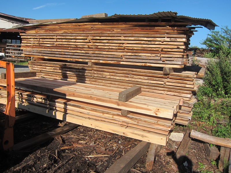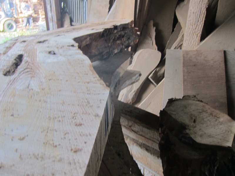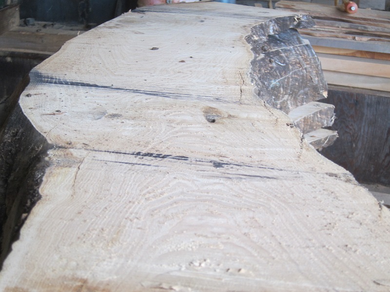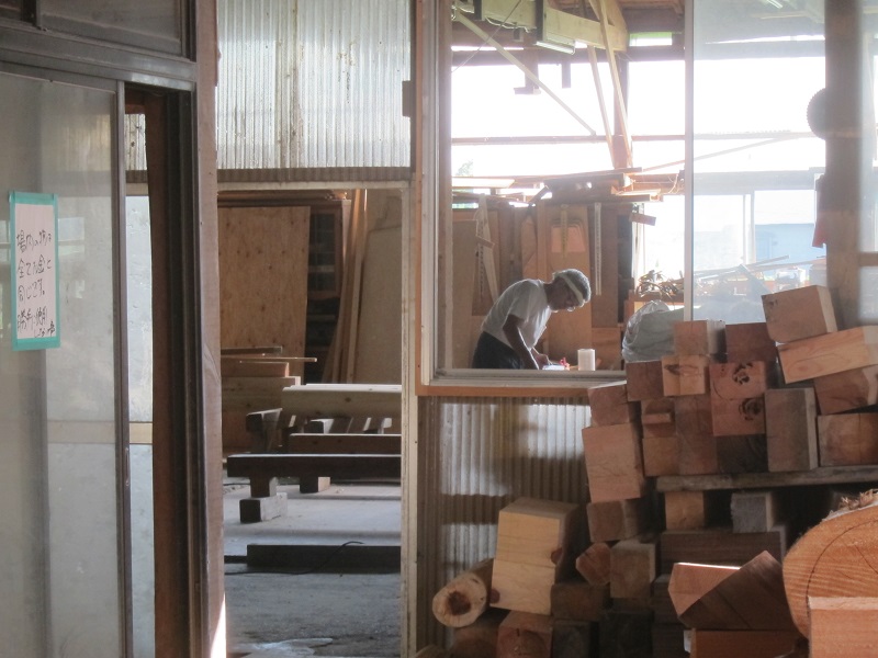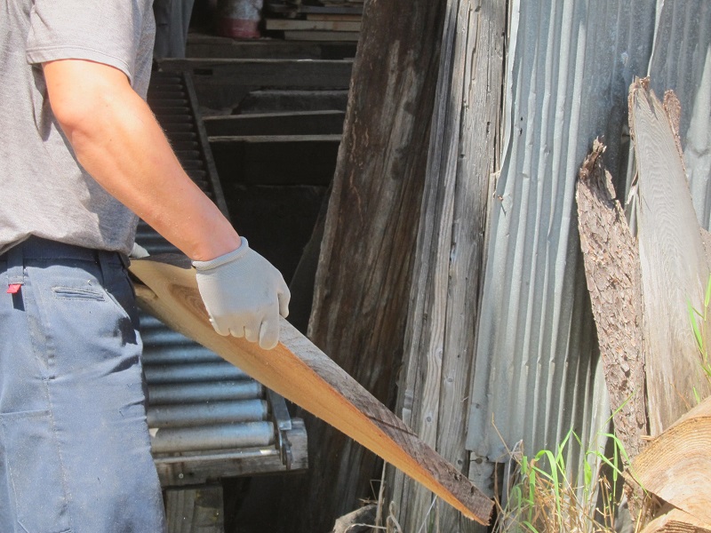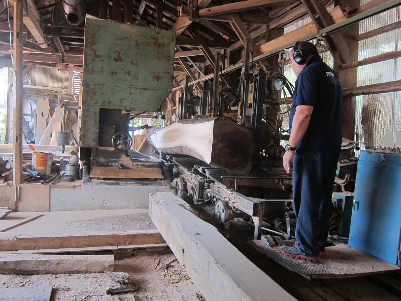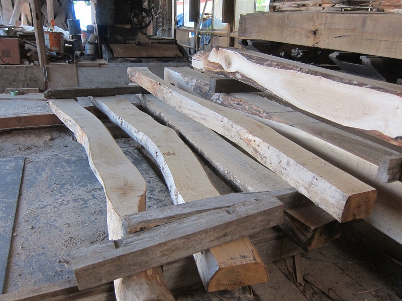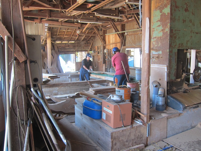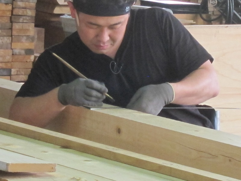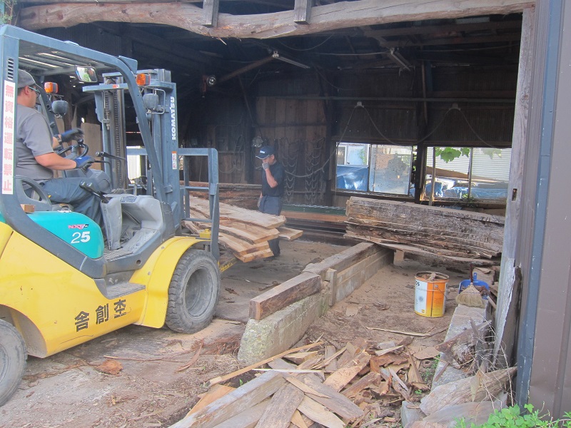 休み前は、栗や胡桃に朴などの雑木の製材を行いました。クルミの大黒柱は向こう5年以上は乾燥時間を要すると思われます。丸太の様態でこのウネル曲がり状態でしたが、製材してみると、数年後は曲がり梁か曲がりままの柱にも出来そうな楽しい雰囲気です。もしかすれば10年後これらが活躍する時もあるかもしれません。栗の板類も厚さ1年ですから使えるのは3年後想定です。これらの前に桟積み乾燥中の板があるので、それらを先に使いながら今回の製材材が乾くのを待ちます。製材時に出る端材もそれなりに役立つ日もあります。