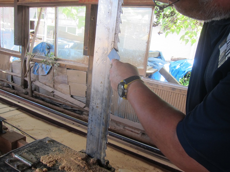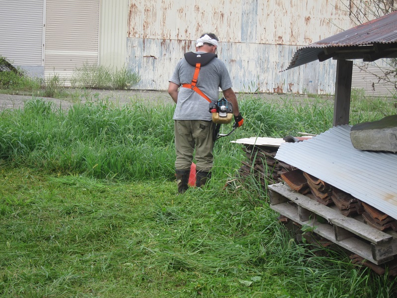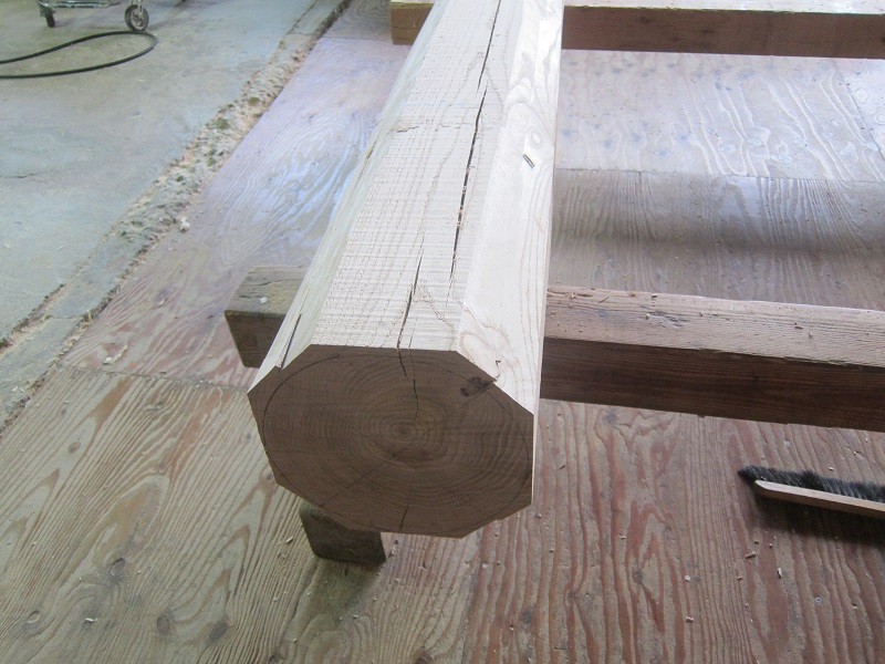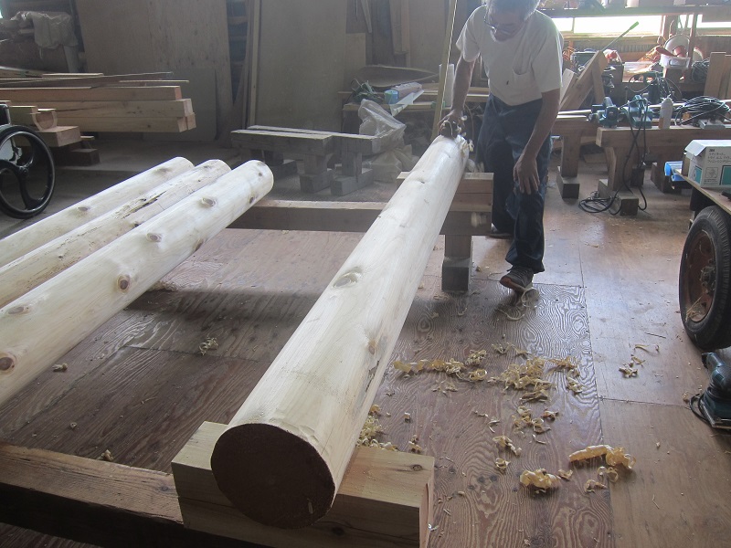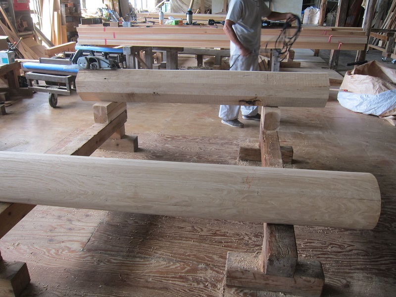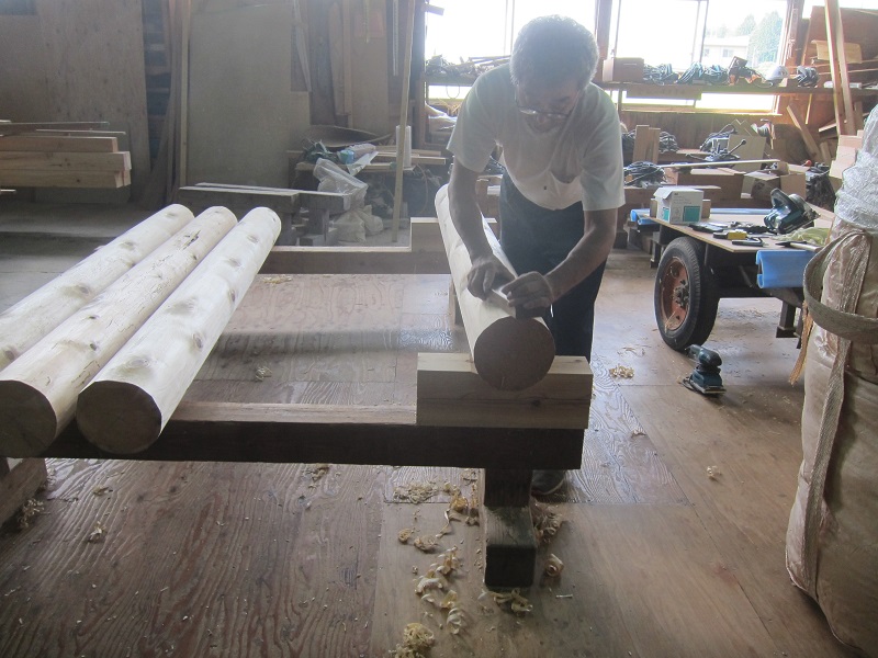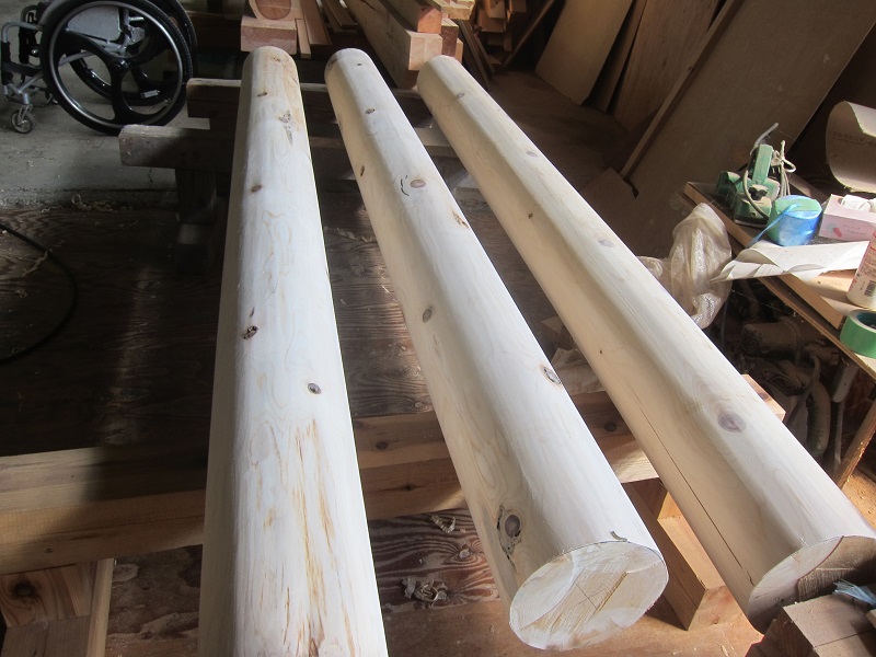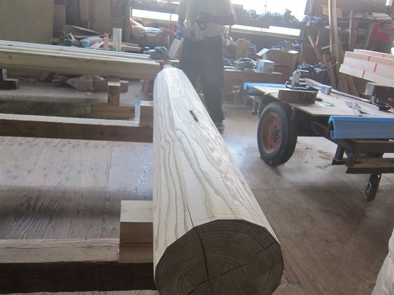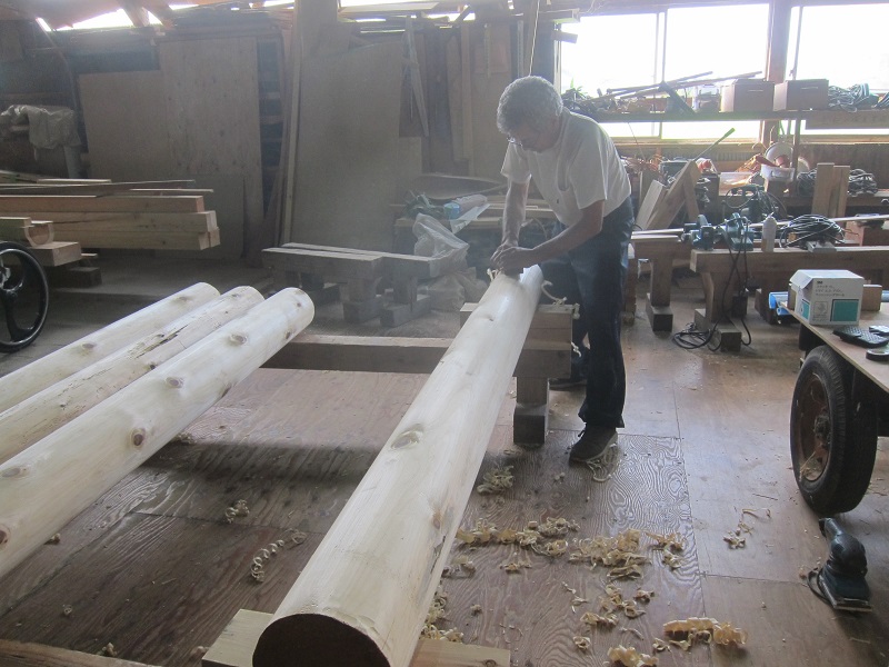 昨日からも今日も好摩上空の雲の流れが速いですね。その空の下、ワイヤーブラシの草刈りに初挑戦です。あ業場の屋根下では鳥居の継ぎ柱8寸丸柱の加工が進んでいます。栗の尺角大黒柱がすっかり丸くなりました。