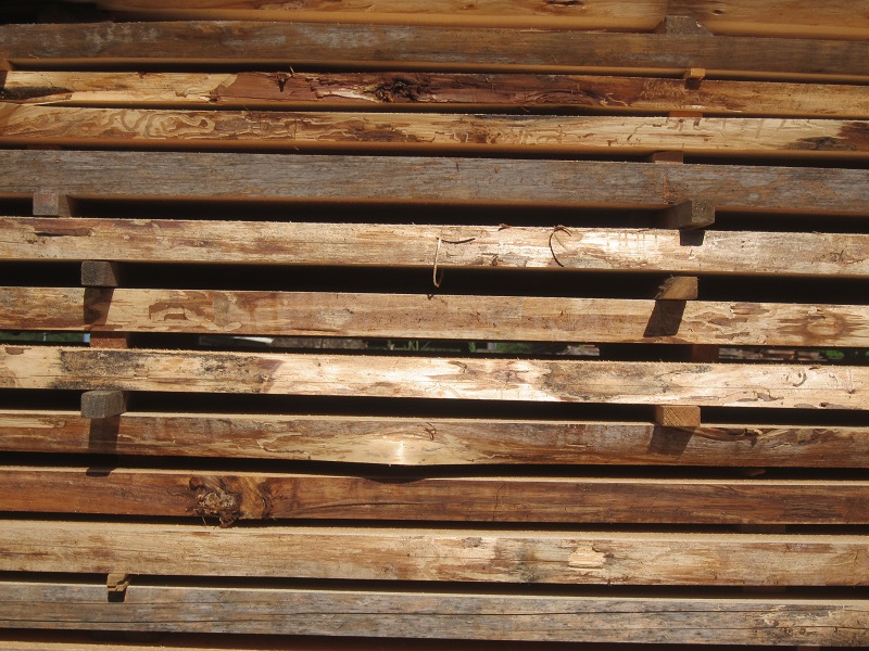 栗の曲がり梁の製材も終えて、樹皮を剥がして桟積み自然乾燥の準備に入りました。前回の製材中の写真では穴だらけの使えそうもない雰囲気でしたが、板で置かれた製材後の中にはとても綺麗な良い材がありました。なので、立木で見た場合に良く無さそうでも中には高級品になる部分も存在します。挽いてみないと分からない山師といわれる所以です。こうして全てを大切にしていると良い事が必ずあるものです。枝や膨らみや瘤の切り落としも花台や時計を造るなどの木工使いにも出来そうな感じです。放置しているうちに乾く感じですね。