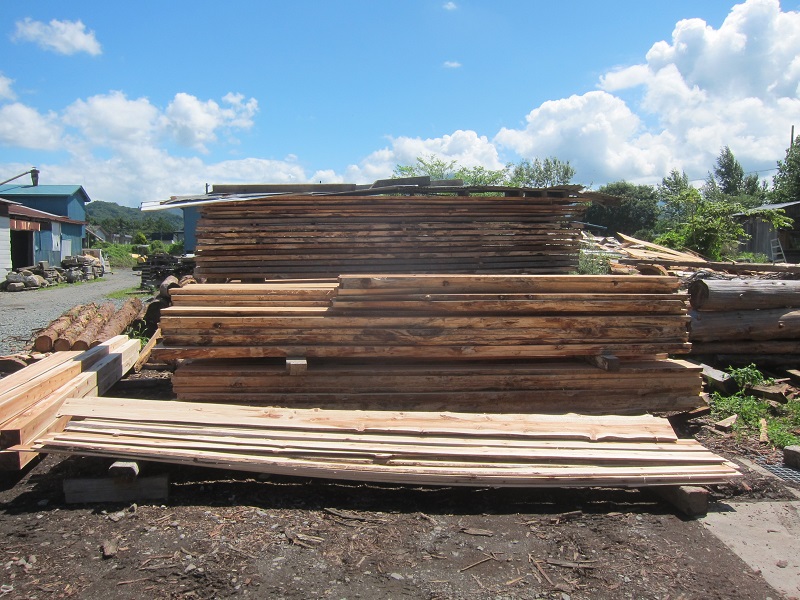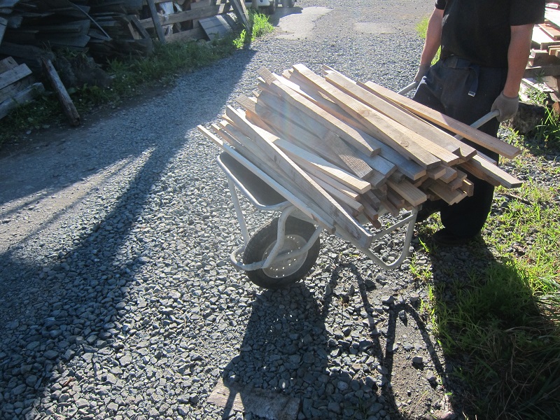 製材が進み針葉樹は大方完了です。今日からは引き続き雑木製材の予定です。針葉樹と云っても杉や落葉松と多種になりましたが、最後に挽いた落葉松の脂が帯鋸にべったりとくっついてしまって難儀してました。また、製材時はローラーを利用して背板は外に搬出するなどの工夫が見られます。製材が終わると、次は桟積み自然乾燥の準備に入ります。桟木は同じ厚さで大量に必要です。これらも、不要になった時には薪ストーブの火入れ用の着火端材になりますね。