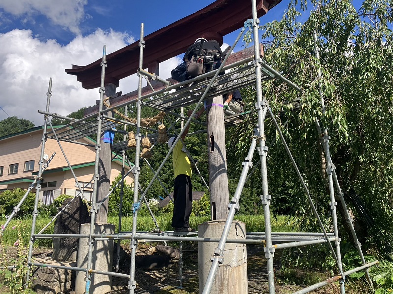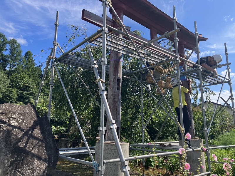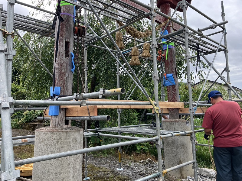 櫓足場を組んで取り組んでいる鳥居の修繕工事は、基礎工事中に大工の継ぎ柱の上部に合わせた丸加工や控え丸柱の加工など構造補強の準備に取り組んでいます。