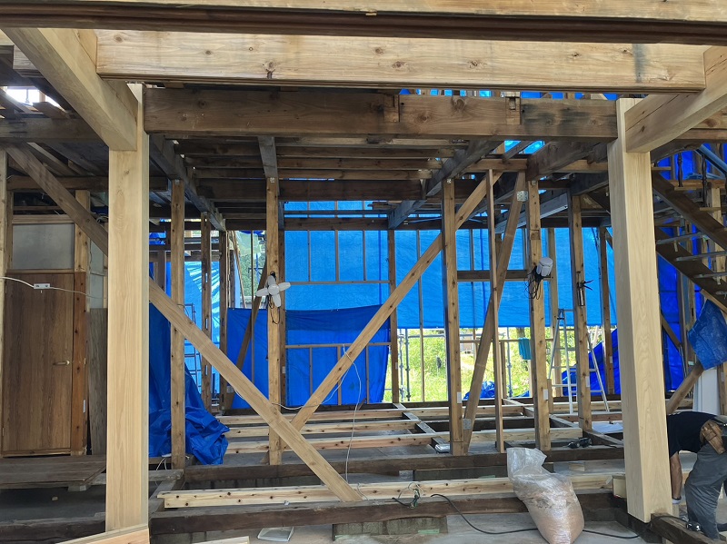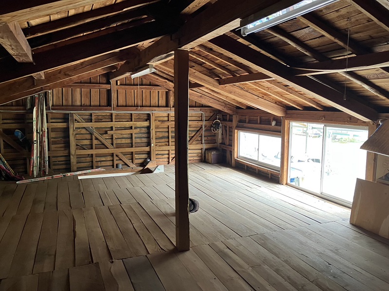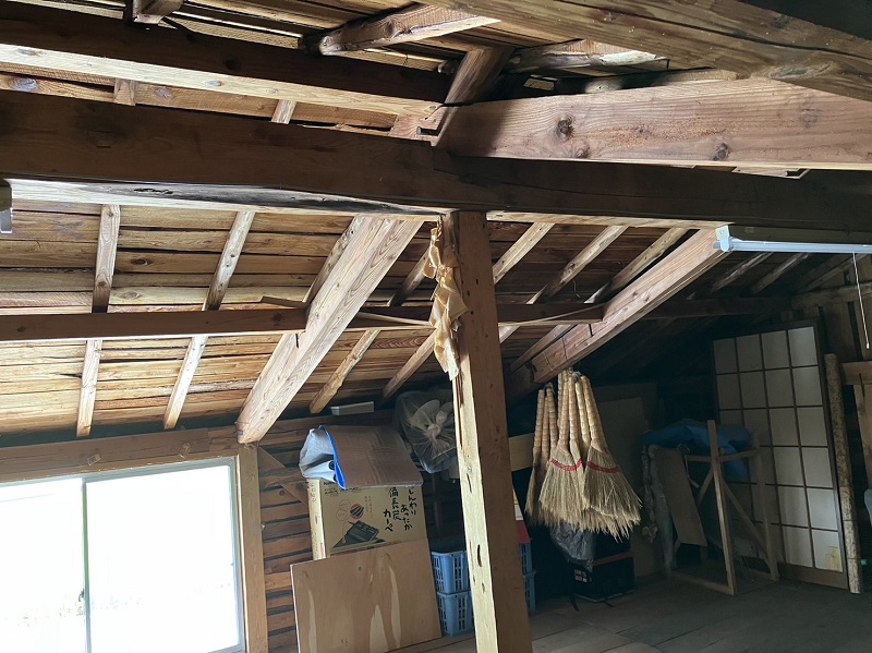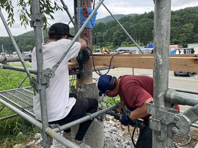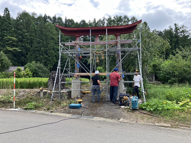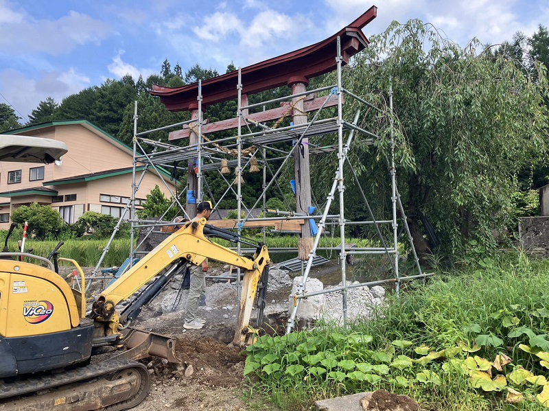 お盆休み明けの田山の大改修現場では、既存部上の屋根の新設が進んでいます。その既存部屋根上に谷が出来たので、大雪の積雪でも大丈夫か既存の構造を調べました。合掌造りと牛梁の塀用のような造りで昔の大工の手際に驚きながら、谷部下に補強が必要そうだと判断しました。工事は屋根が進んだので、次は床組みを急ぎ進めて、28日からの暖房配管工事に備え、外部囲いを早くやりたいと思っていました。それだけではなく、道路向かいの倒れそうな鳥居の修繕工事もご依頼いただきまして、取り組んでいます。