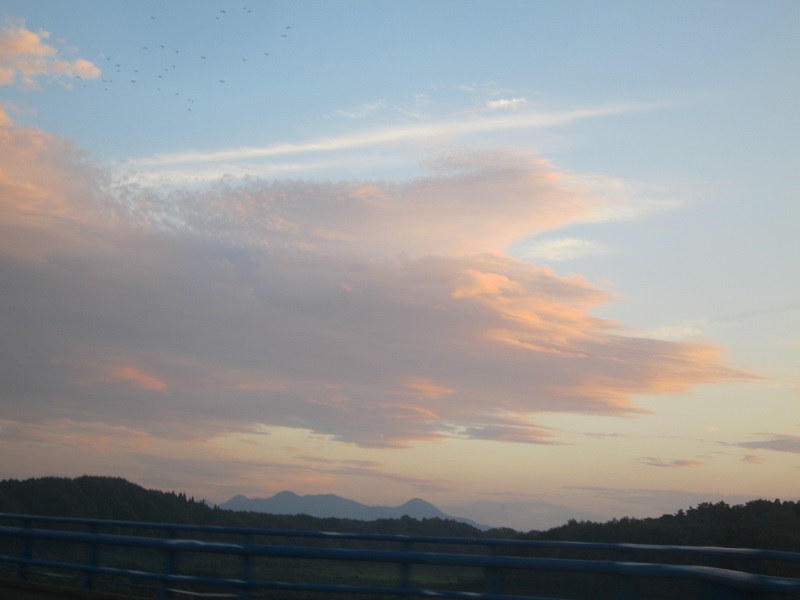 帰宅時の何時もの定位置に久し振りに入っての撮影です。岩手山の光景だけでなく横の稲穂も写せました。空に横たわる龍雲も自宅に着くまで近かず離れずずうっと見れました。鳥の群れも同様です。