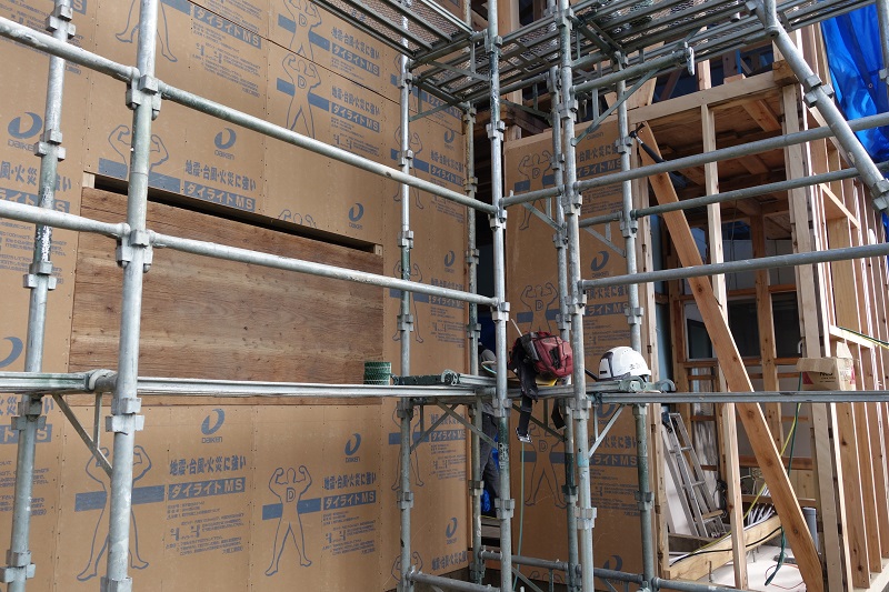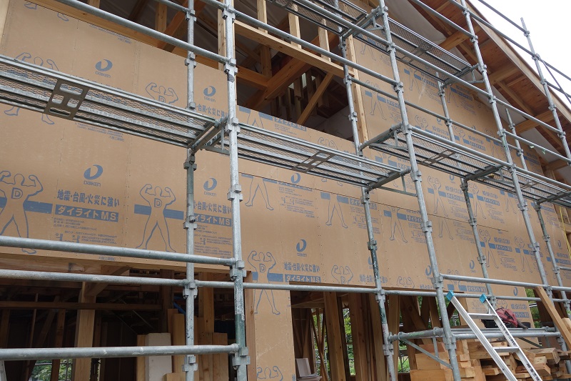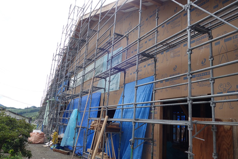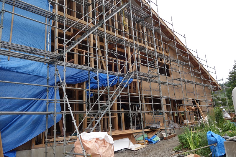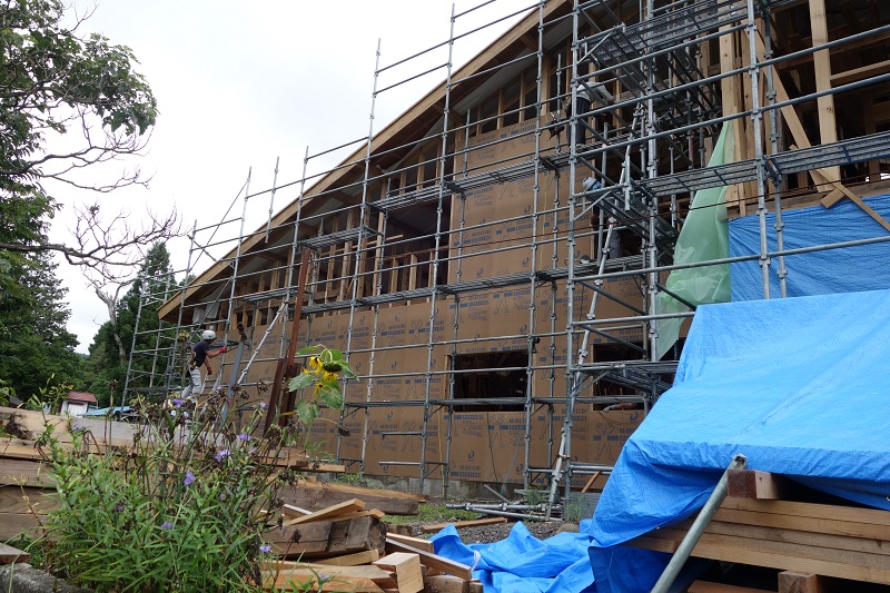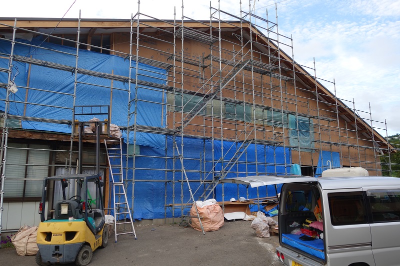 昨日の続きで、田山の大改修現場の進捗です。屋根は大方葺き上げましたし、キソメンバーの応援で外部囲いも大分進みました。なので、今日明日が勝負です。ナノになのに・・・応援大工さんが二人とも昨日から今日もお休みです。人の手で造り上げるのだからそうした事も仕方が無くあることではあります。でも、自社大工の手伝いを基礎メンバーが応援サポート出来る事自体が素晴らしく感謝の思いです。こうして自社総力を挙げて頑張って造り上げて参りたいと思います。微力ながら迫る台風の空を見上げて祈るばかりです。