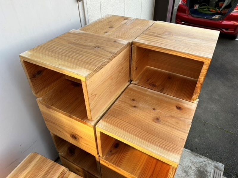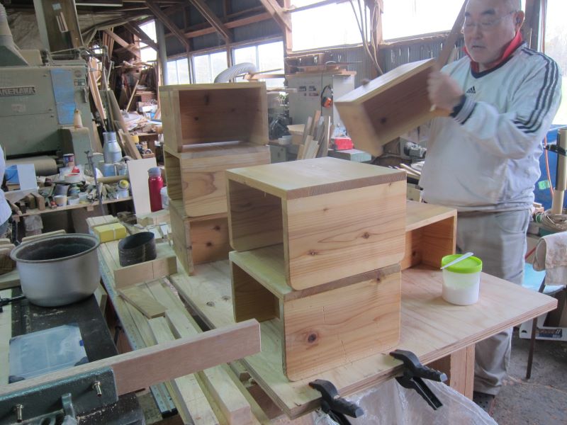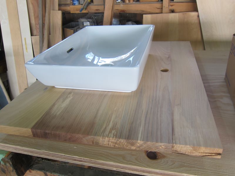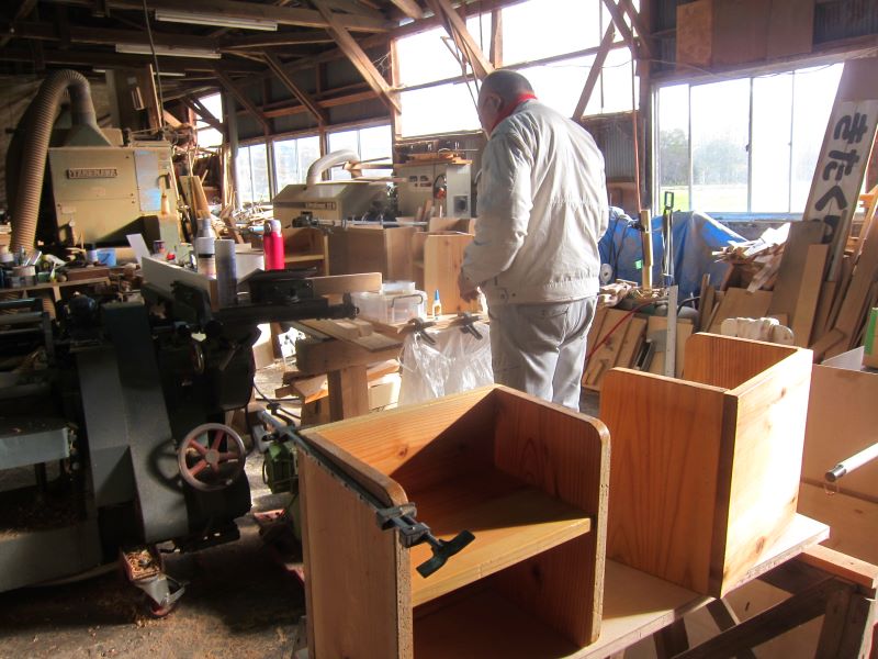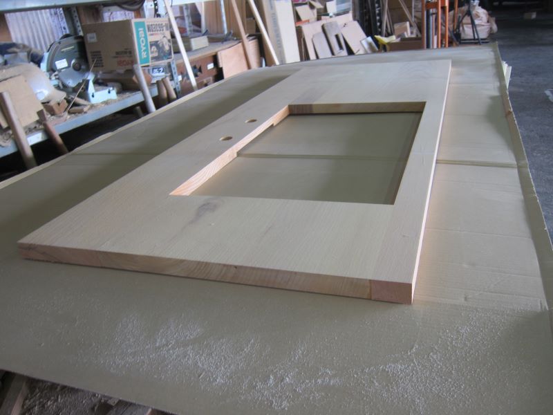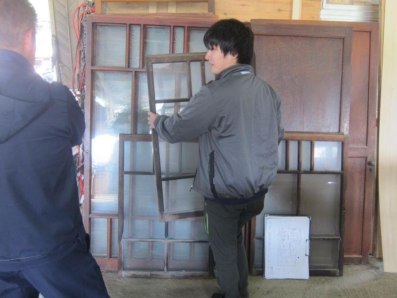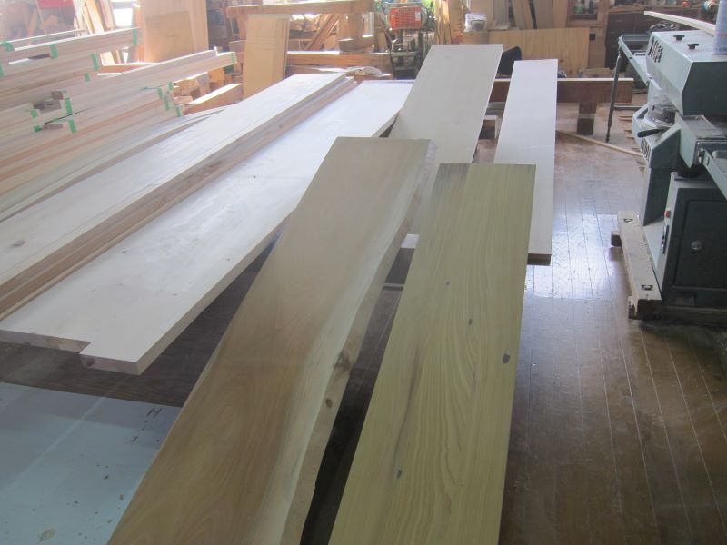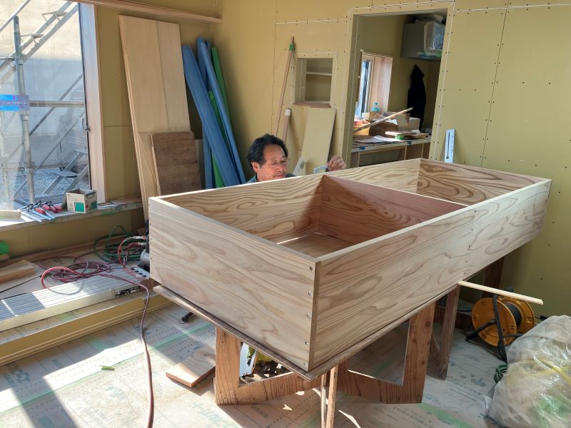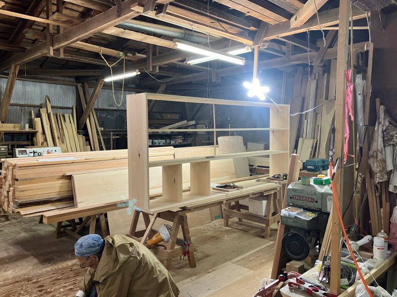 昨日、加工中の造作カウンター類をお施主様にご見学いただきました。欅やイタヤにサワラ等々、下足カウンターTVカウンタートイレ収納カウンターの他、洗面台のカウンター各種です。そして使用予定の古建具も同時に見ていただきました。