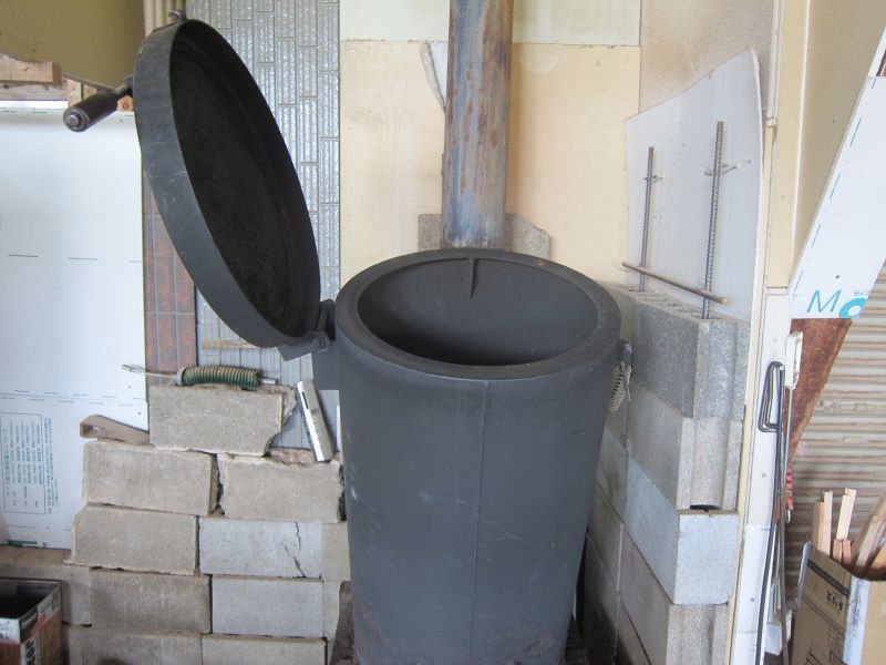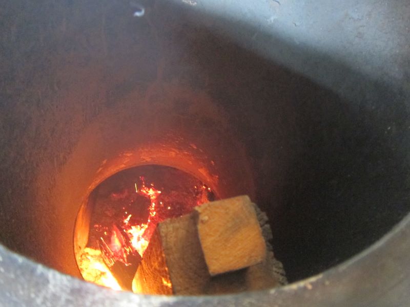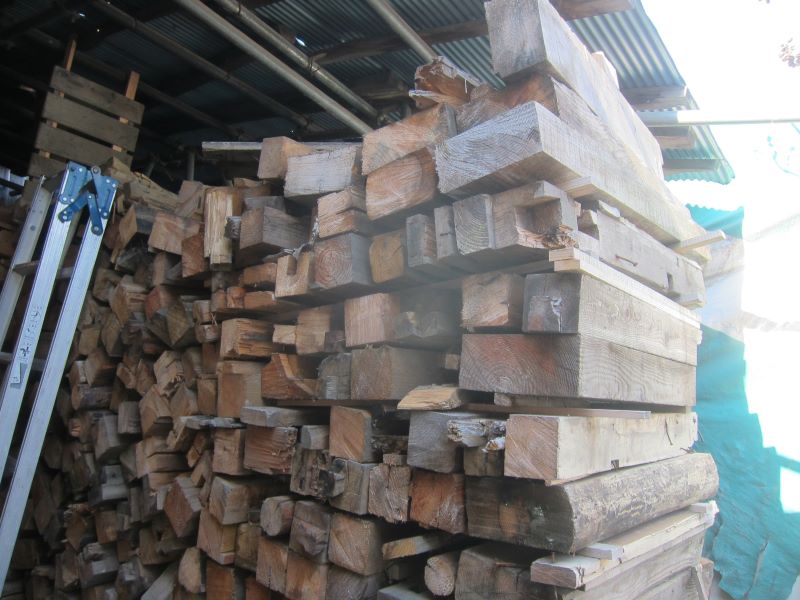 大工作業場の薪ストーブは、1mちょっとの長さの角材や丸太もそのまま燃やせます。解体材も薪として役立っています。薪ストーブの名はゴロン太(ごろんた)です。機関車のようにシュポシュポと音を出しながら燃えます。断熱の入らない広い場内も暖かいので、パワー絶大です。寒くなったのでもう活躍しています。